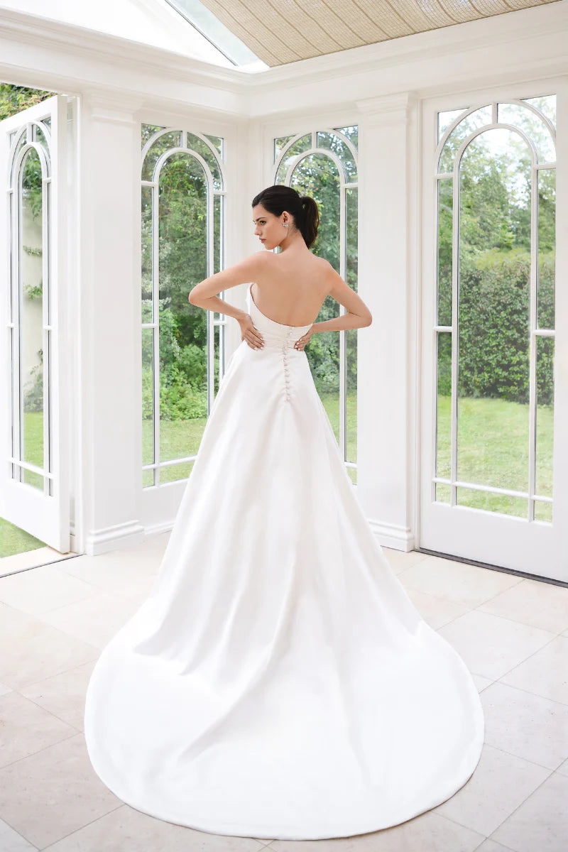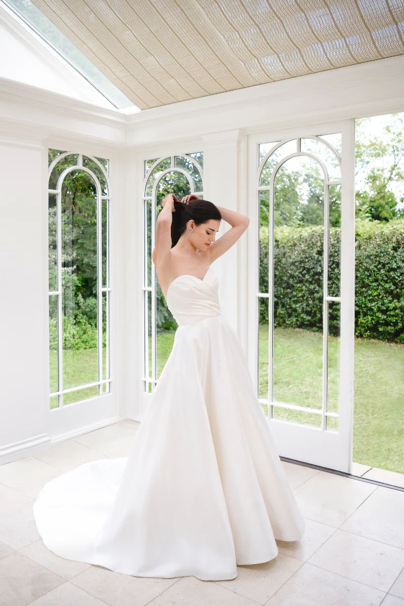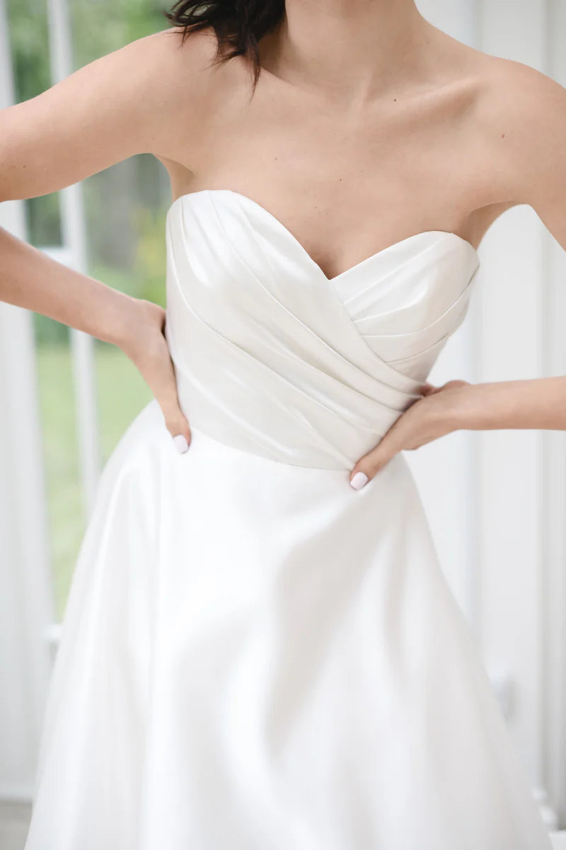 The ARIA gown is a glamorous, bold, and intriguing satin gown featuring a pleated corset bodice and a full A-line skirt with pockets, all in a luminous pearl color. Defined by its effortlessness, Aria features a chic pleated corset bodice which accentuates your figure with a sleek, contemporary design. Crafted from lustrous duchess satin, this statement draped bodice boasts a soft sweetheart neckline. Designed to draw in the waist, the full A-line skirt cuts a dramatic figure.