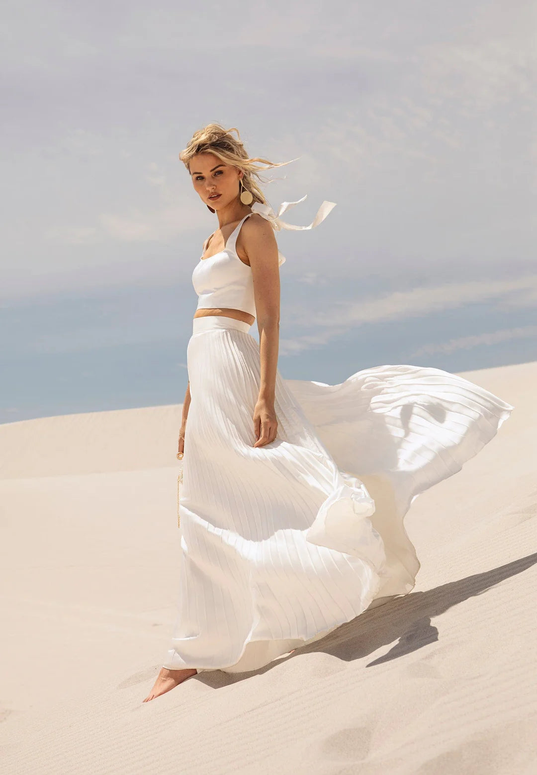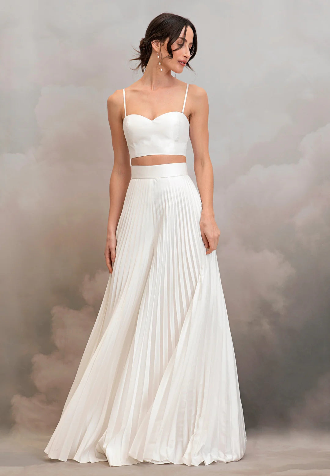 Dance the night away in the dramatic and fun Athena wide leg trousers. These high waist trousers are created from luxurious eco satin with sunray pleated details. The Athena Trousers pair beautifully with an array of our bridal separates, allowing you to create your own unique bridal look. Full length trousers come in a standard measurement of 115cm from waist to hem.