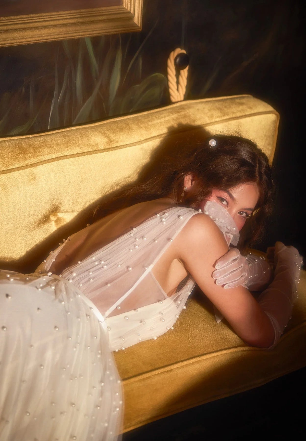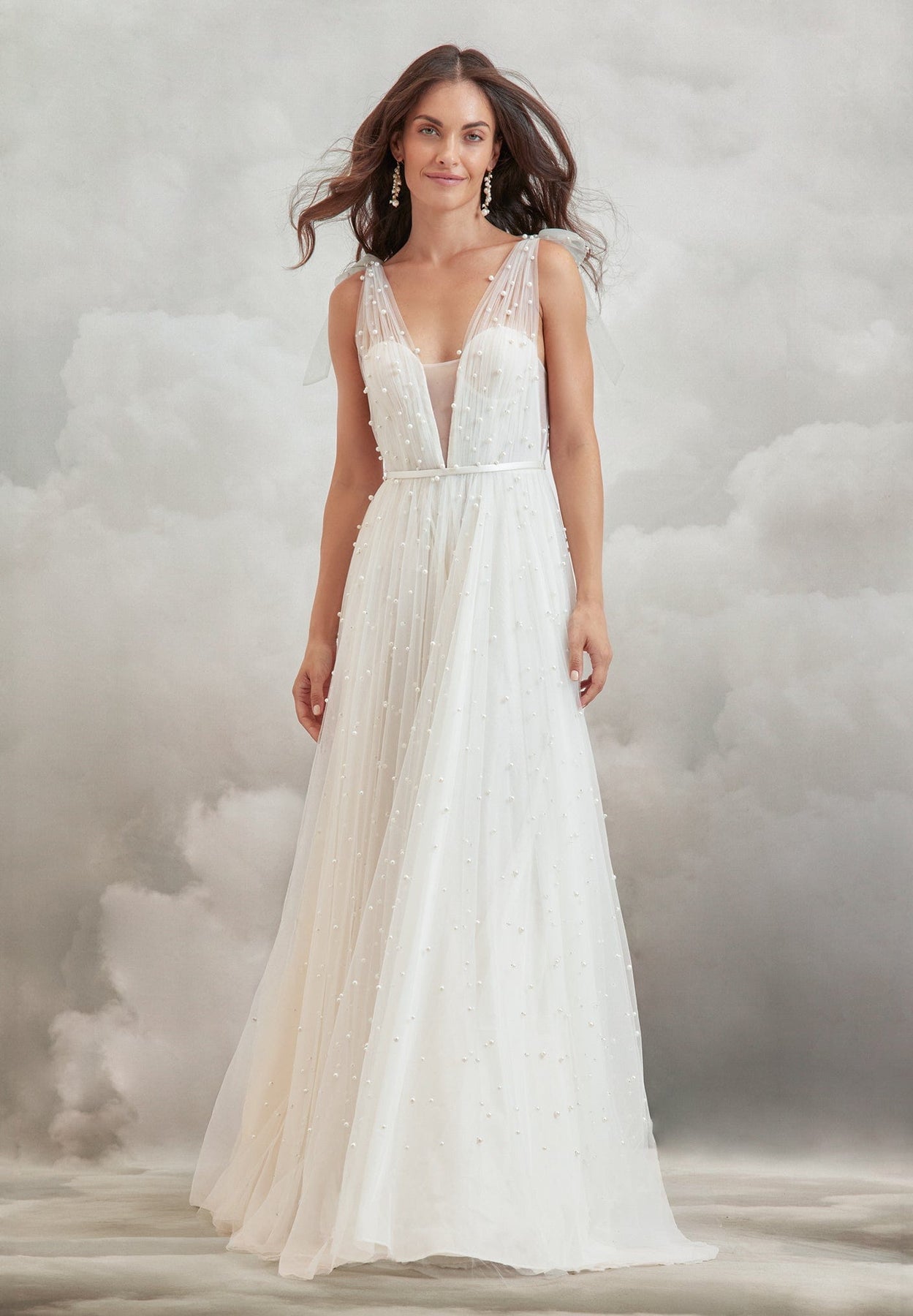 The floor length Bae Gown is cut from frothy layers of soft tulle in tones of oyster and pale champagne. The main layer of this gown is adorned with scattered pearls and gathered over the lined bust to create a plunging v-front and back neckline. Pearl tulle bows sit on the shoulders for added detail while illusion tulle panels secure the centre front bodice and low sides. A detachable boned belt cinches in the small of the waist while the voluminous full circle skirt drapes dramatically to the floor, ending in a sweeping train.