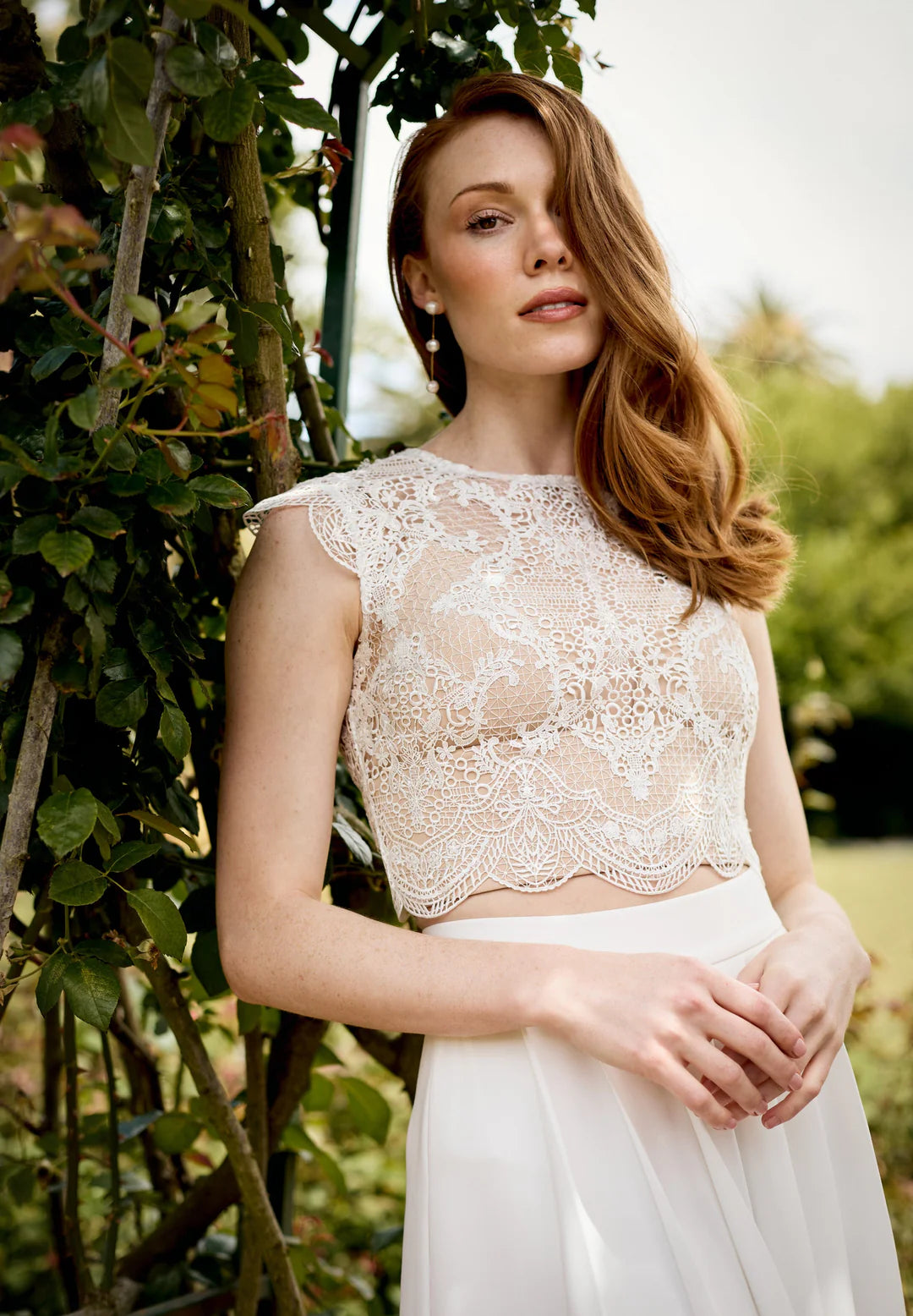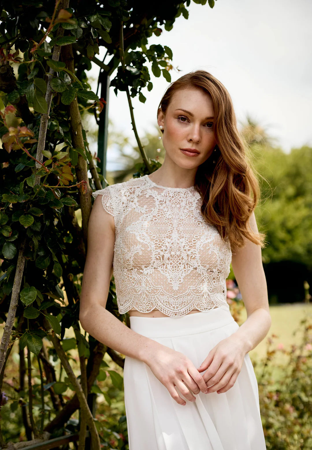 Delicate, romantic, and effortlessly elegant – the Bartley Top by Catherine Deane is a beautifully ethereal addition to your bridal ensemble. Crafted from sheer floral lace with intricate lattice detailing and a subtle shimmer from iridescent sequins, this piece is ideal for brides creating a bespoke two-piece wedding day look.