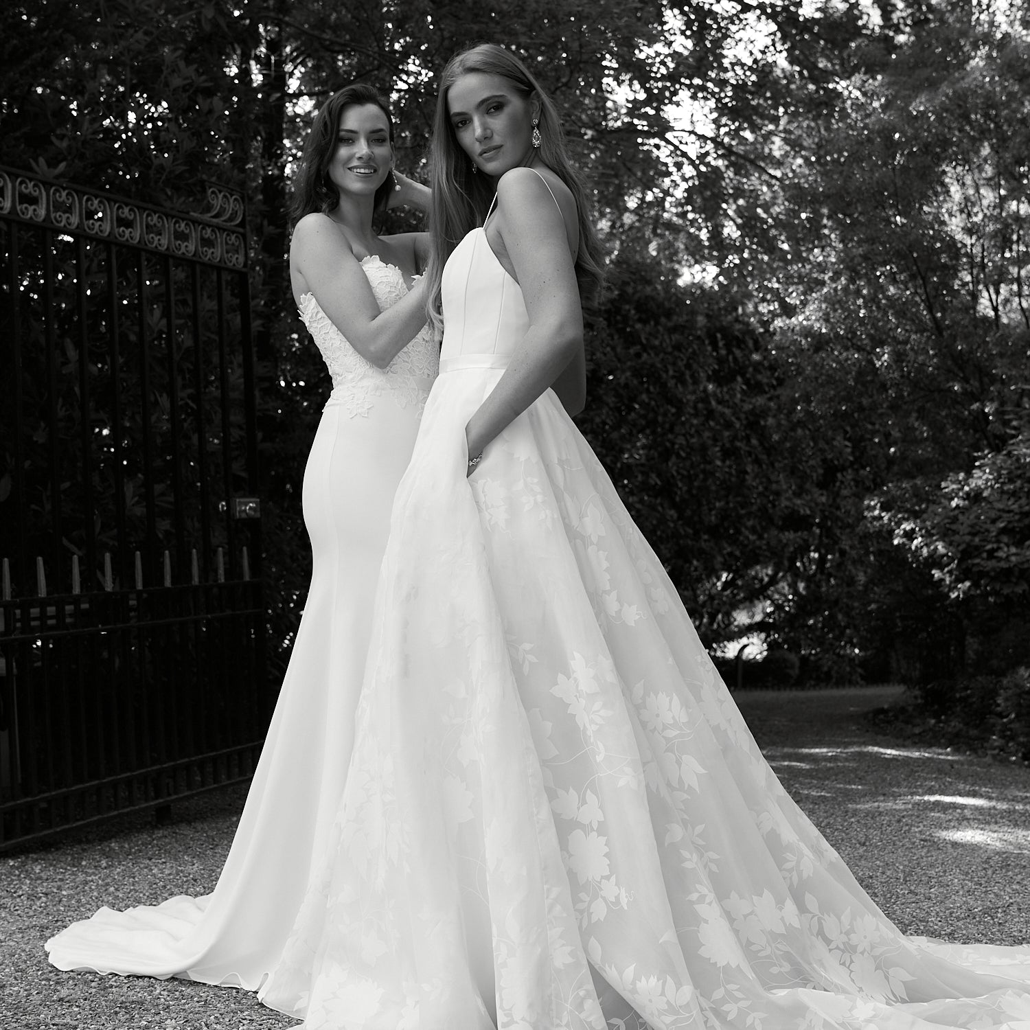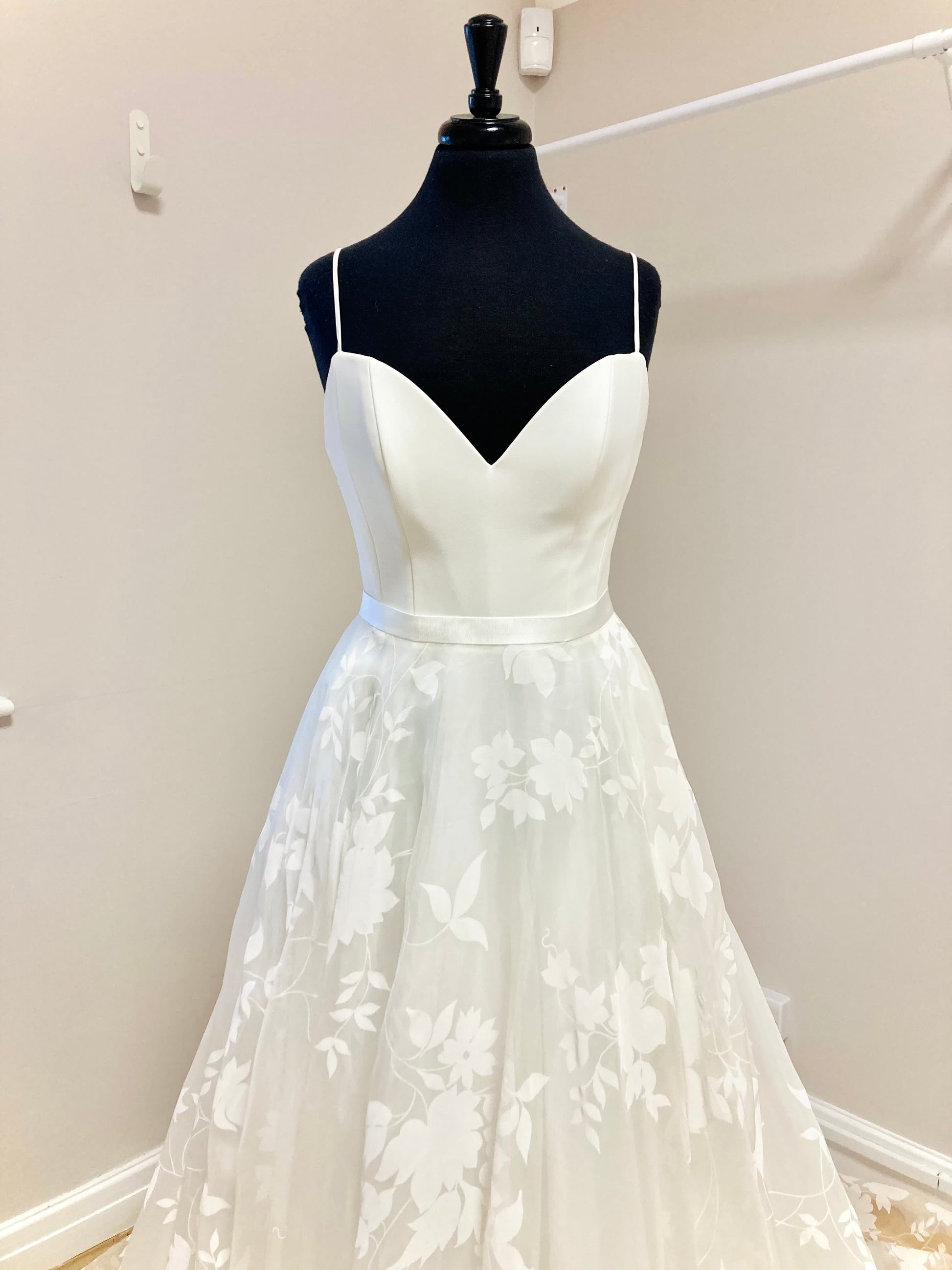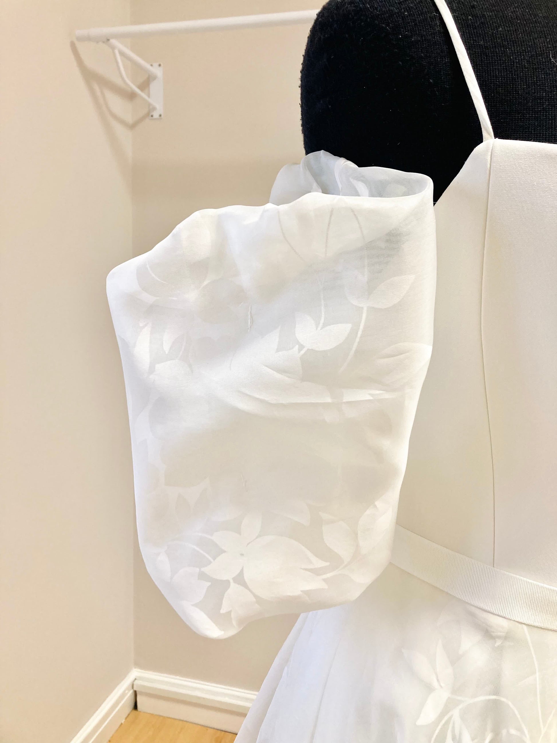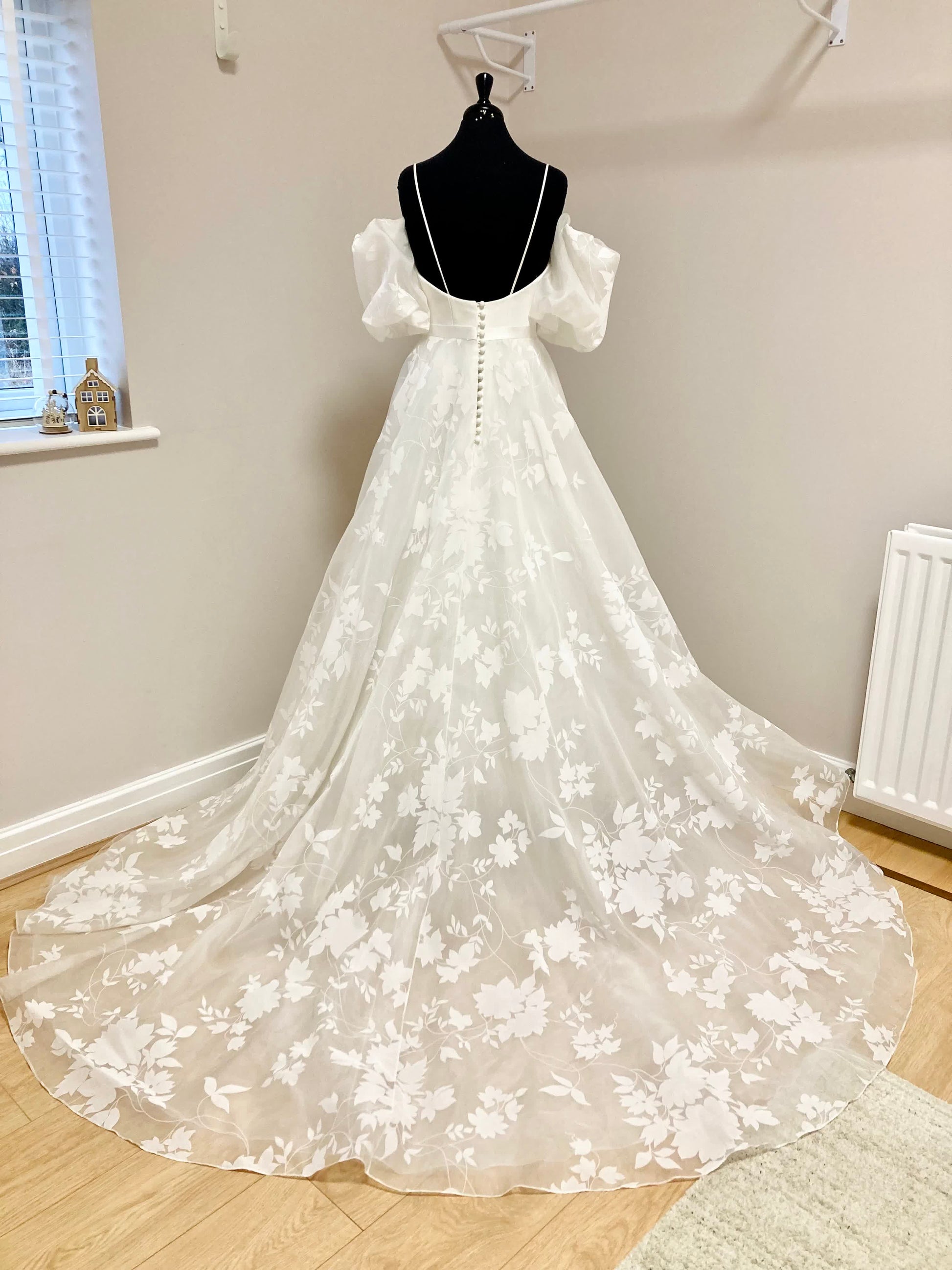 Bouquet by British designer Caroline Castigliano, made in the UK. Cut from Italian silk-organza printed with intricate blooms set against a pale ivory background, the Bouquet gown has a timeless silhouette with a nipped in waist and voluminous skirt. Bouquet also has the option of adding sheer sleeves accentuated by gentle ruching. The gown is cut with a soft, floaty circle skirt and the boned bodice features a petal-shaped neckline with a deep central V-point, which frames the décolletage and lengthens the body. The waist is finished with an elegant satin grosgrain sash. The classic Castigliano corsetry supports and slims the waist, the bodice sweeps low at the back, cinching in the waist and lifting the bust with 16 bones around the circumference of the body. The skirt features luxurious, Italian Silk Organza which is printed all-over with a contemporary floral design, layered over swathes of delicate soft tulle for a lighter than air, dream-like effect that swirls and dances as the bride moves. Pockets are concealed in the side seams for a contemporary edge.