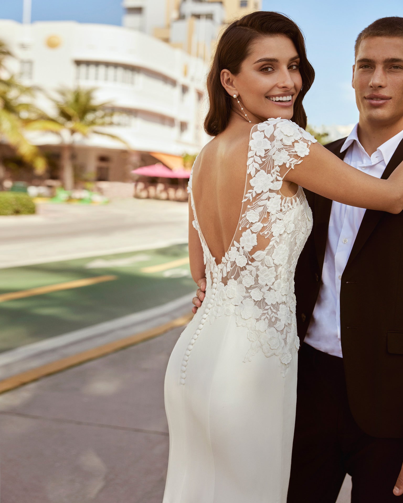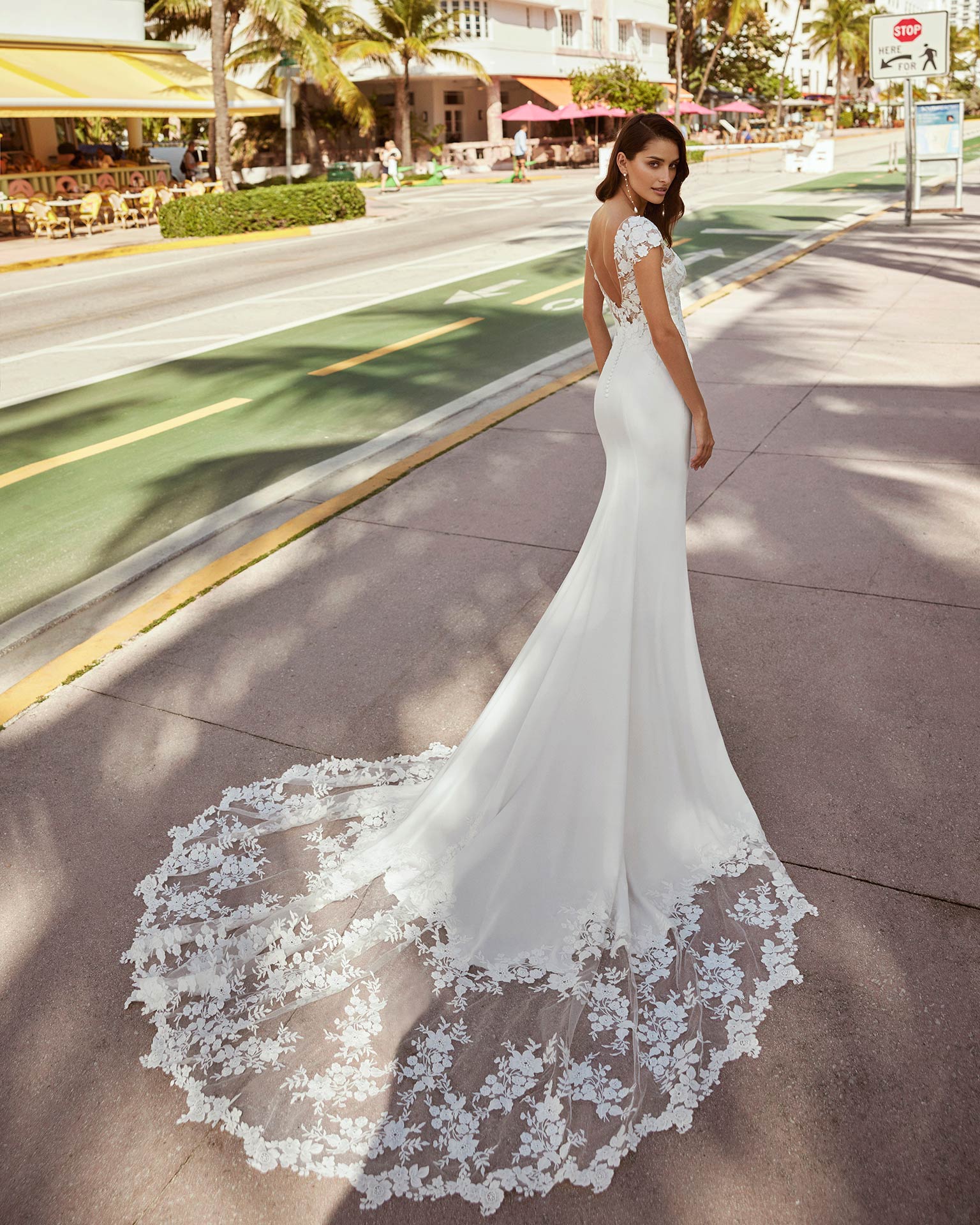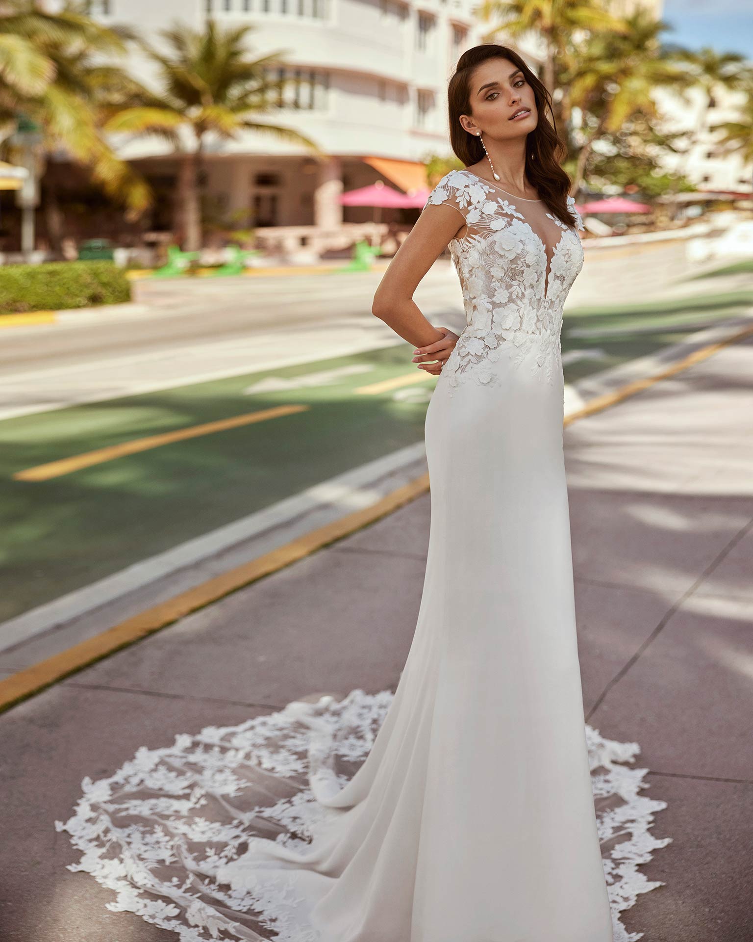 Carly by Spanish designer Luna Novias. Carly is a romantic fitted wedding dress, made in crepe combined with a beautiful soft lace. This dreamy Luna Novias design features a v-neckline, open back and cap sleeves.