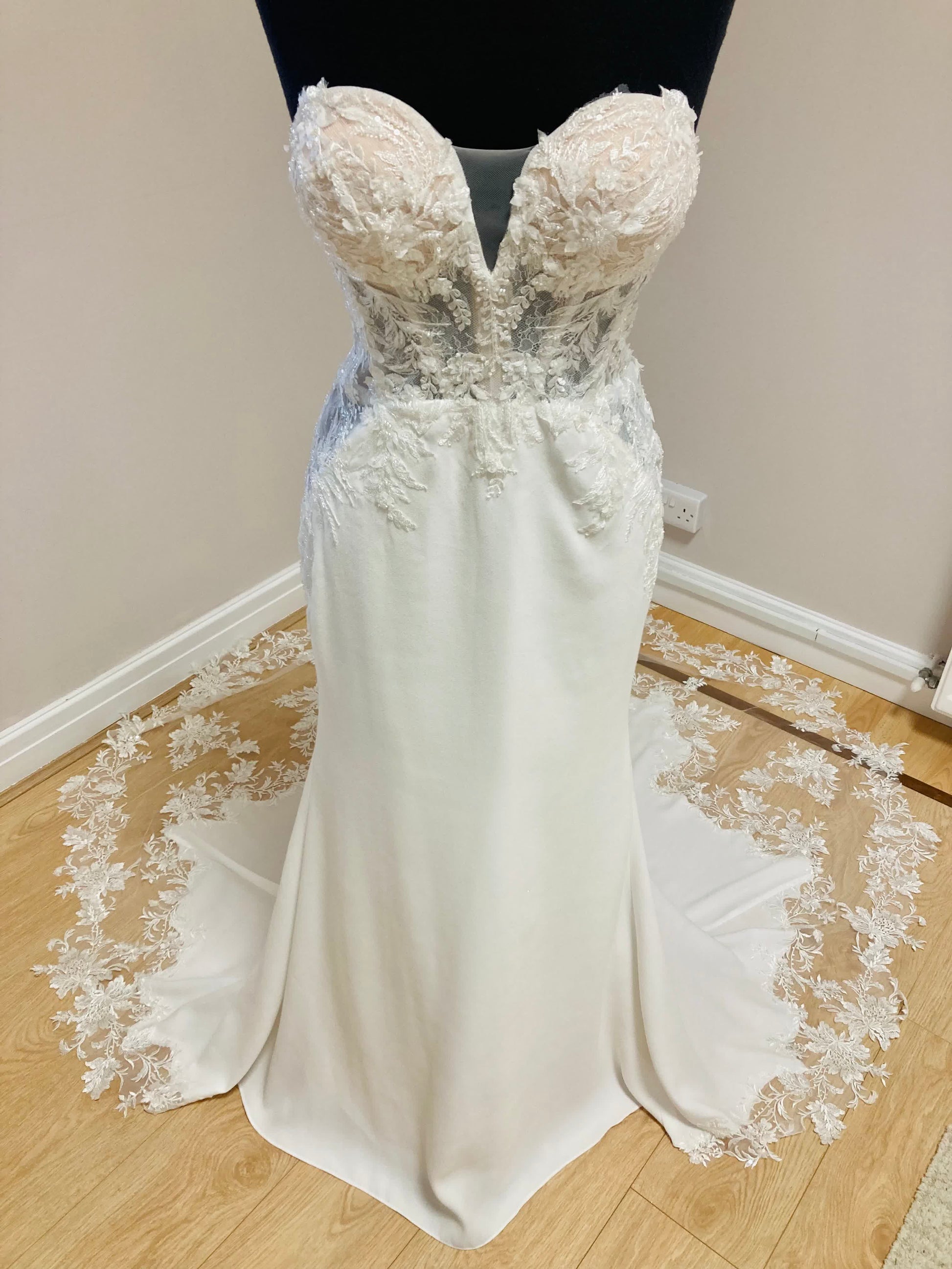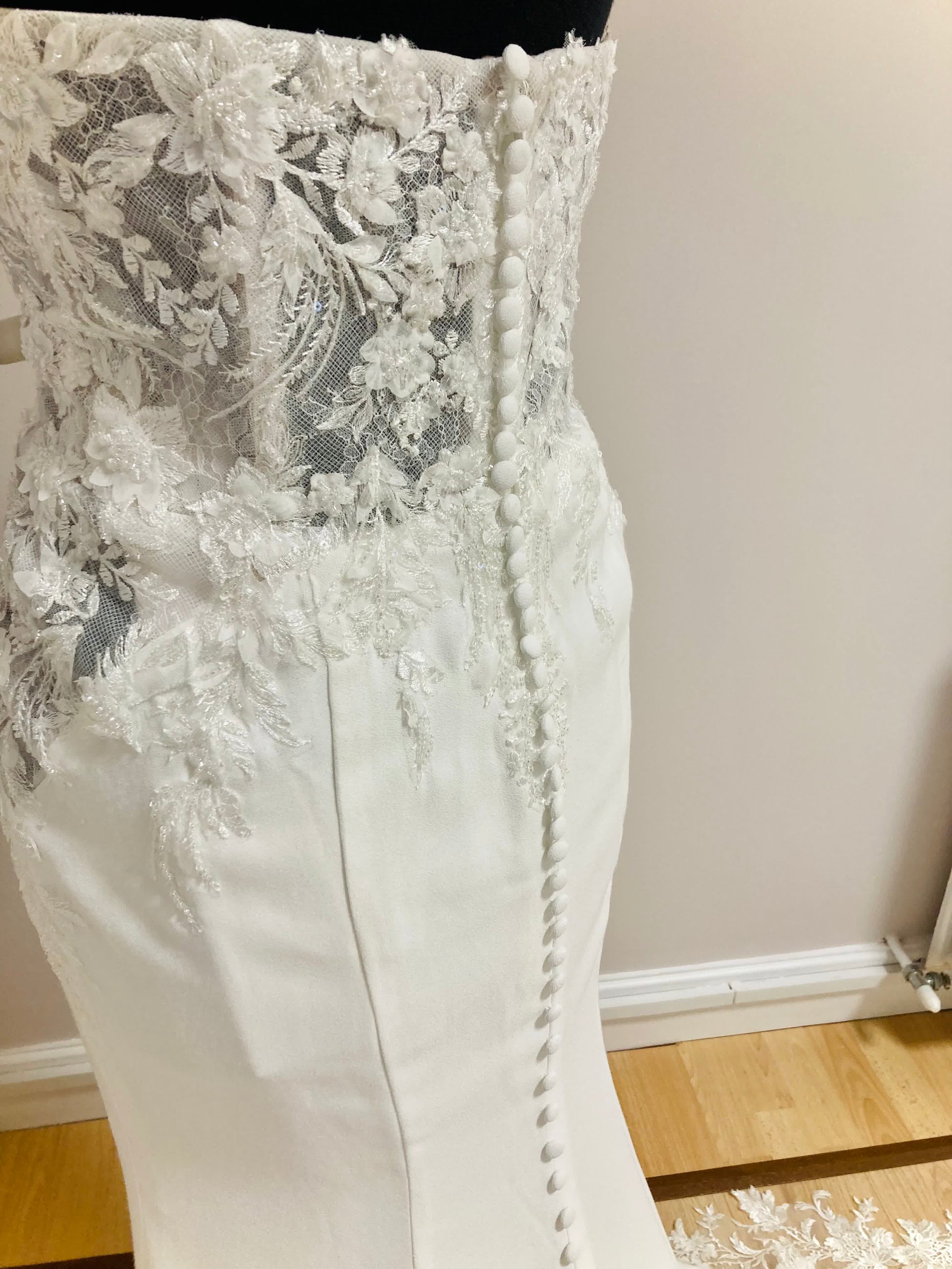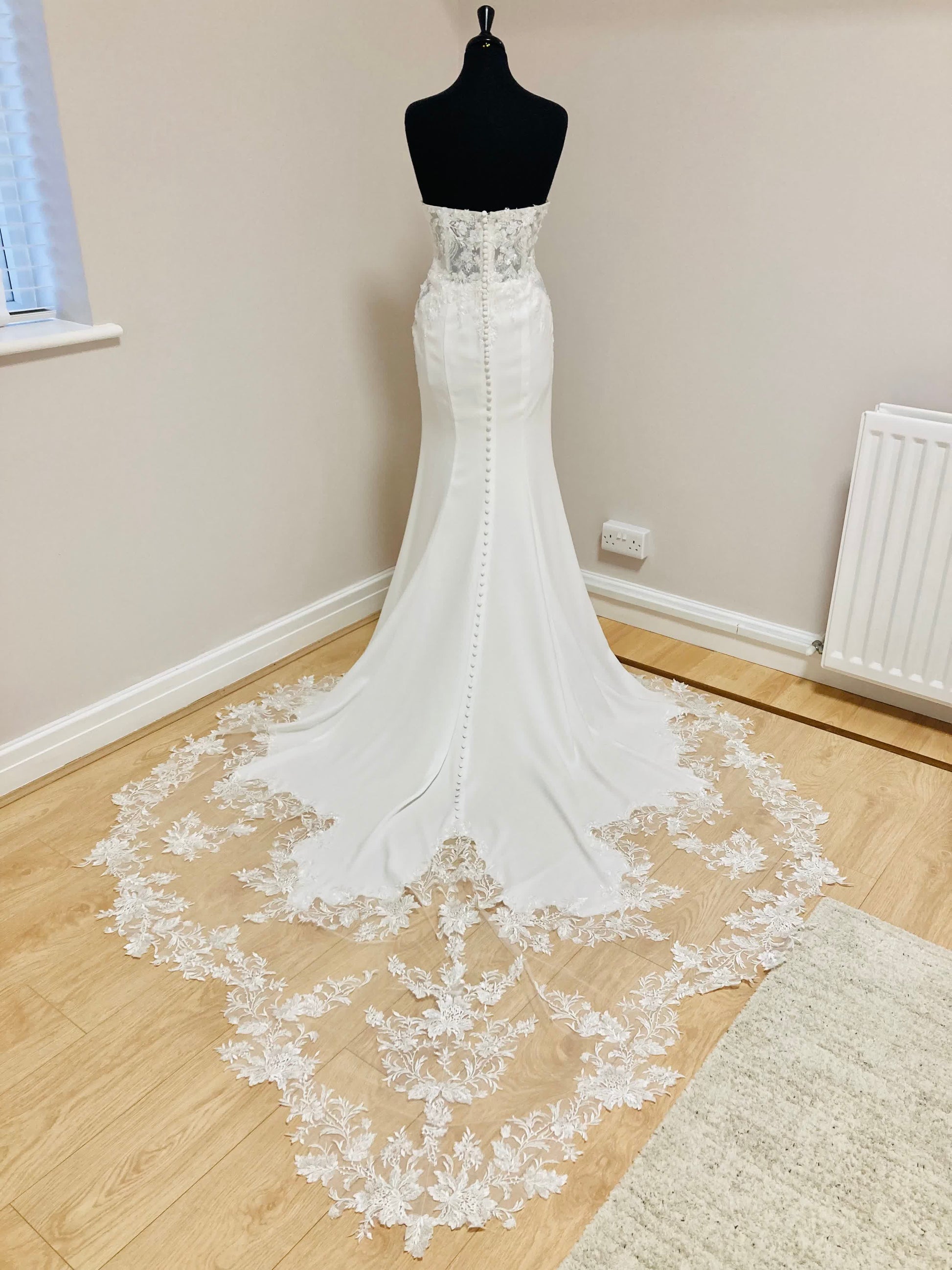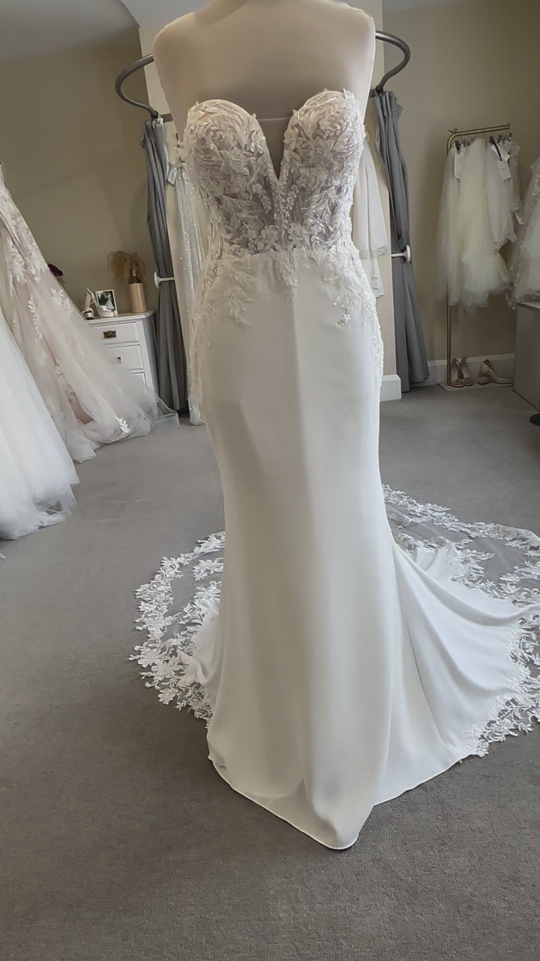 Carola is a feminine mermaid fit wedding dress, made in crepe with lace detailing on the bodice and train. This delicate Luna Novias design will win you over with its sweetheart neckline, buttoned back and detachable sleeves, not to mention the showstopping train.