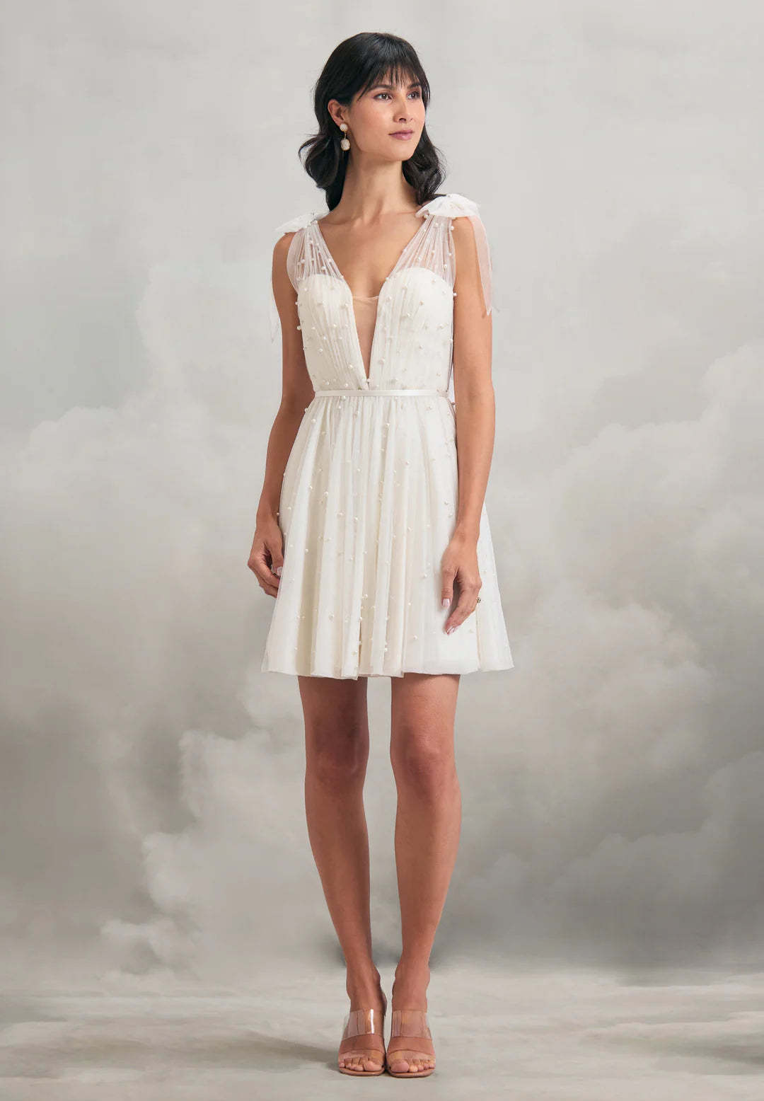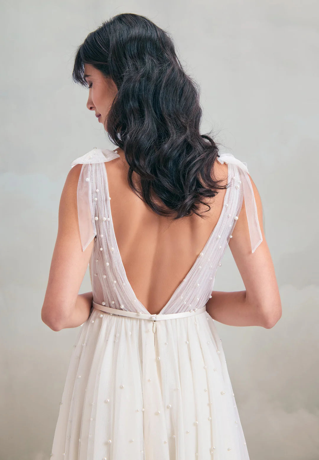 Crafted from delicate pearl-scattered tulle over soft champagne eco satin, the Carolina Dress features a flattering A-line silhouette that cinches at the waist and flows into a full mini skirt. The plunging V-neckline at the front and back adds allure, while the sweetheart-shaped bodice lining with built-in bust cups and boning ensures a supportive and sculpted fit.