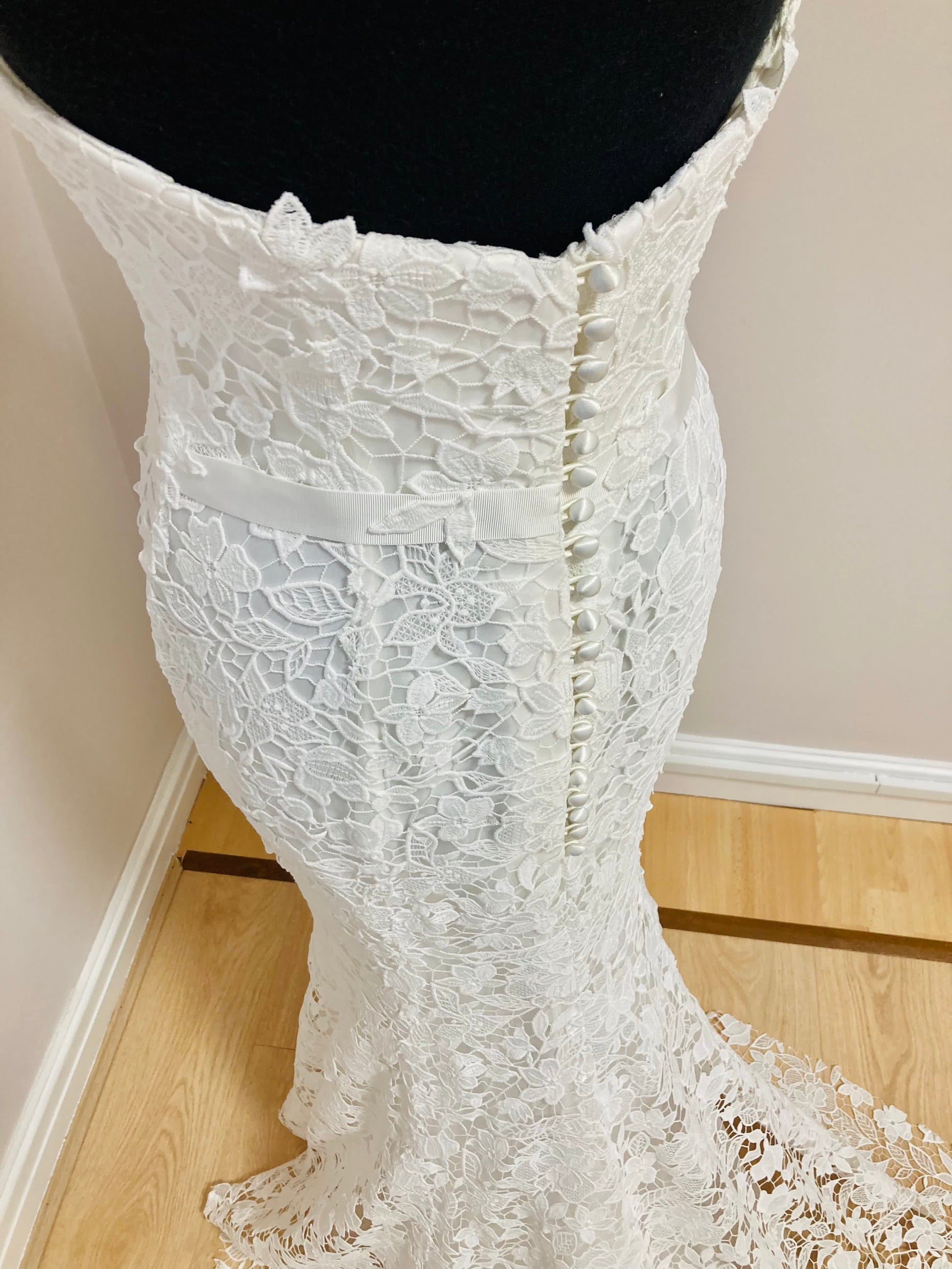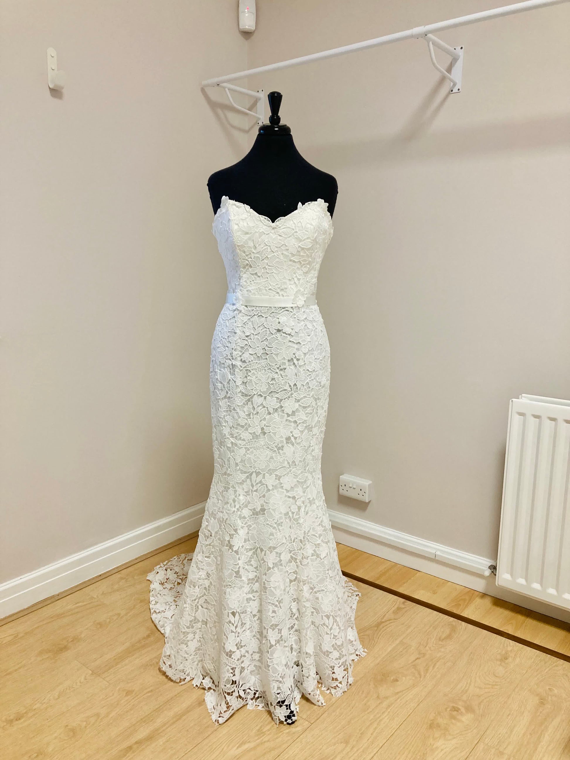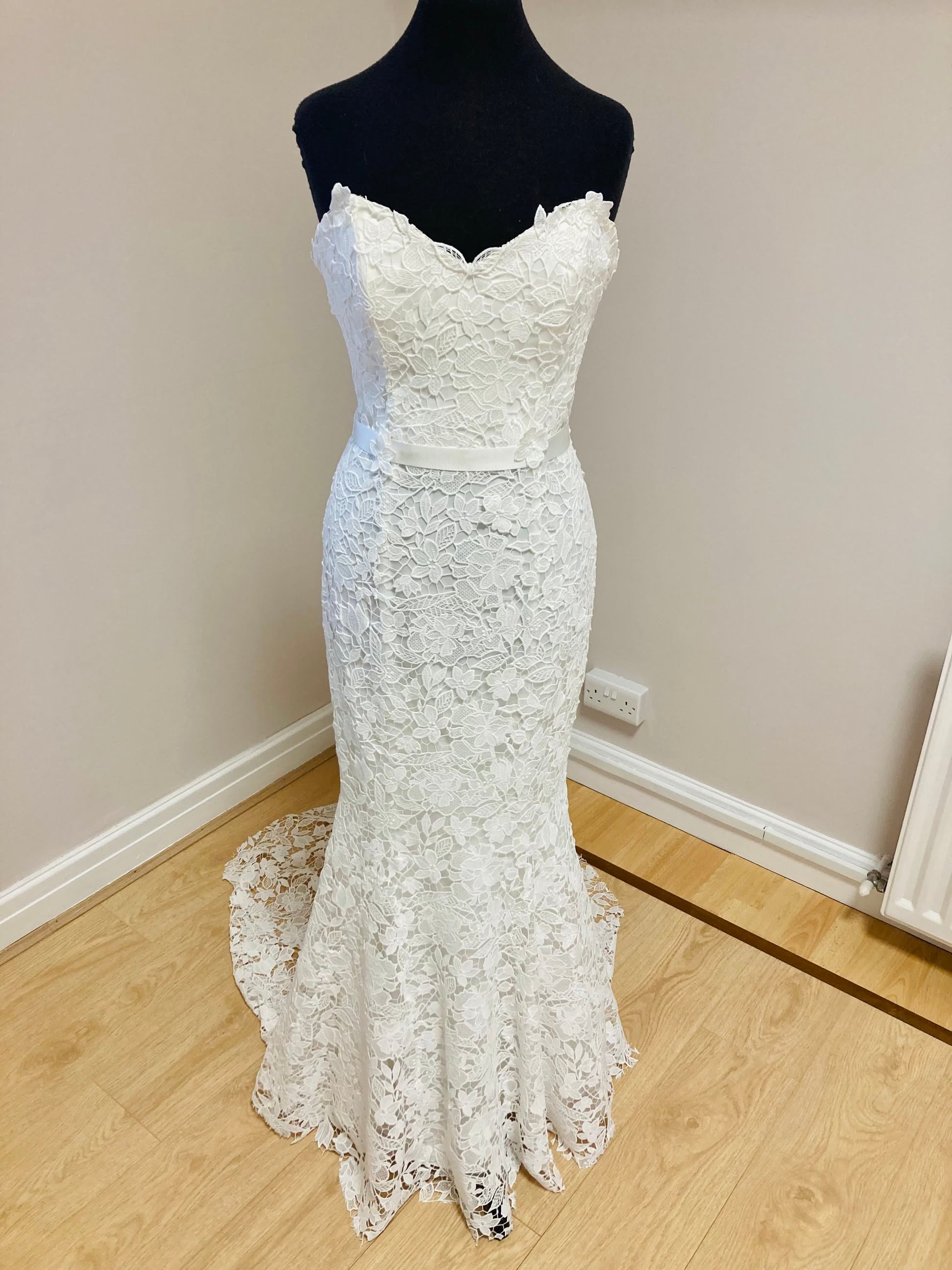 We are offering our sample of Fiesta off the rack. Our Fiesta is in excellent condition and ready to be worn. It is best for a UK high street 10-12, and can be altered down to a UK 8 high street size. This dress is perfect for any last minute brides to be, still looking for an amazing gown.