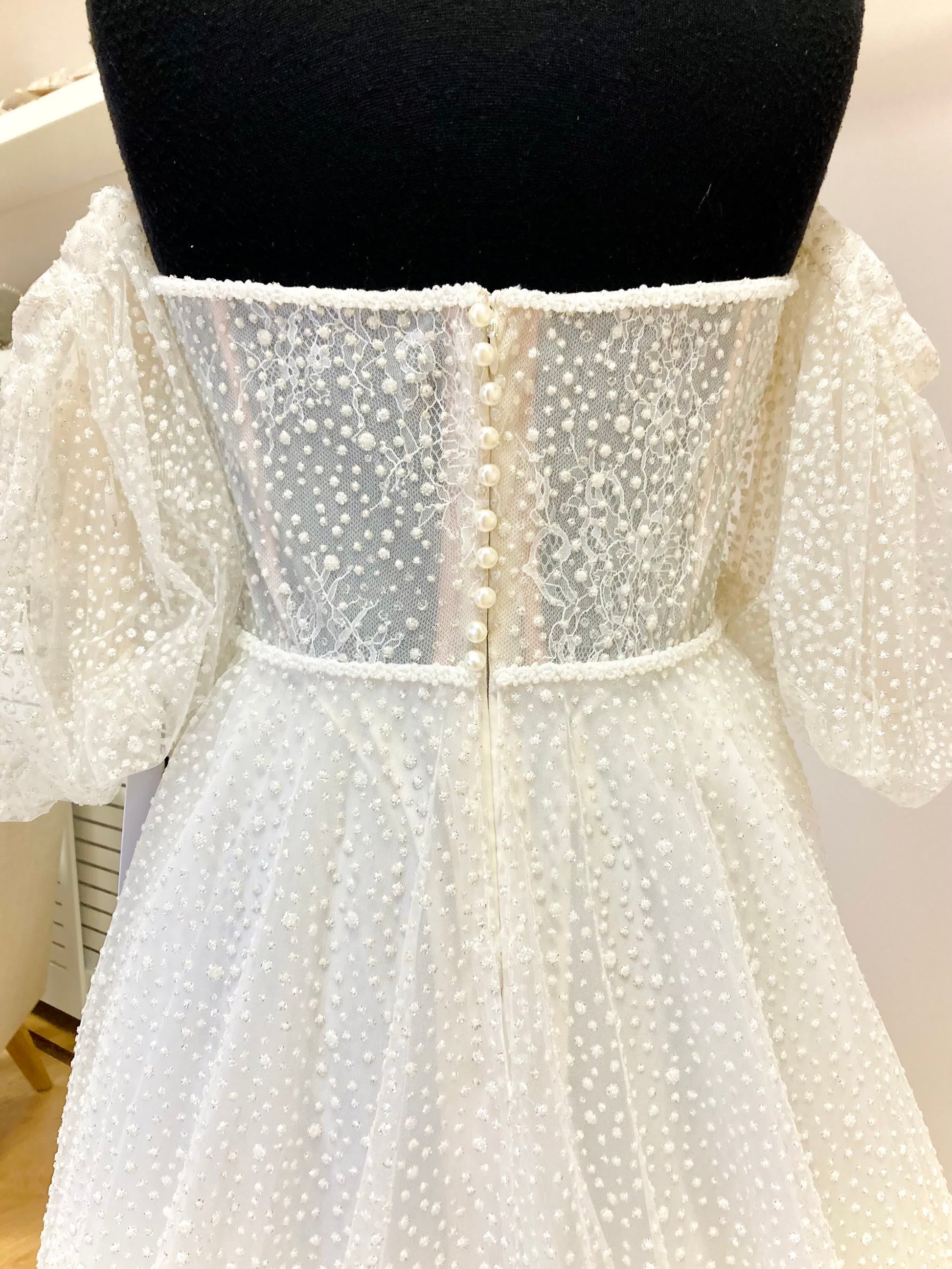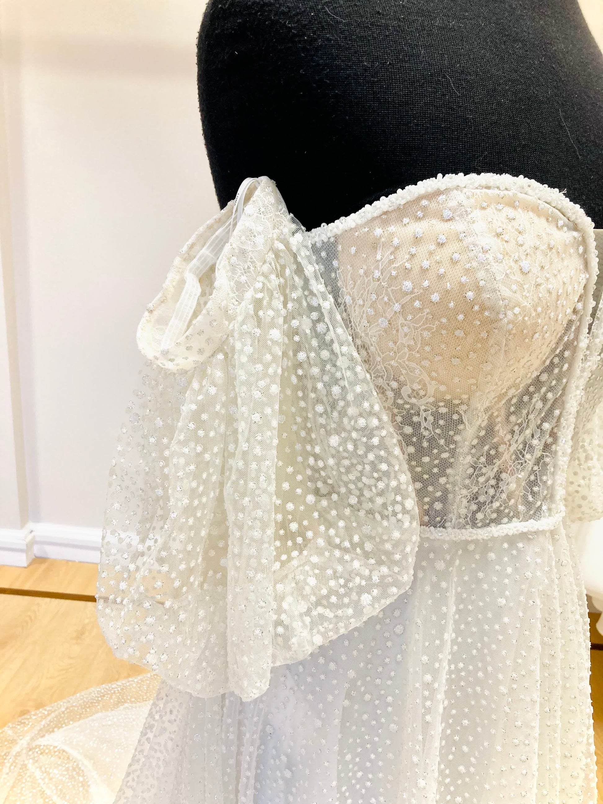All sample dresses can be reduced in size up to 2 dress sizes. Please check your body measurements against those listed below. All sample dresses are sold as seen with defects, repairs and alterations are not included in the price of the dress.
