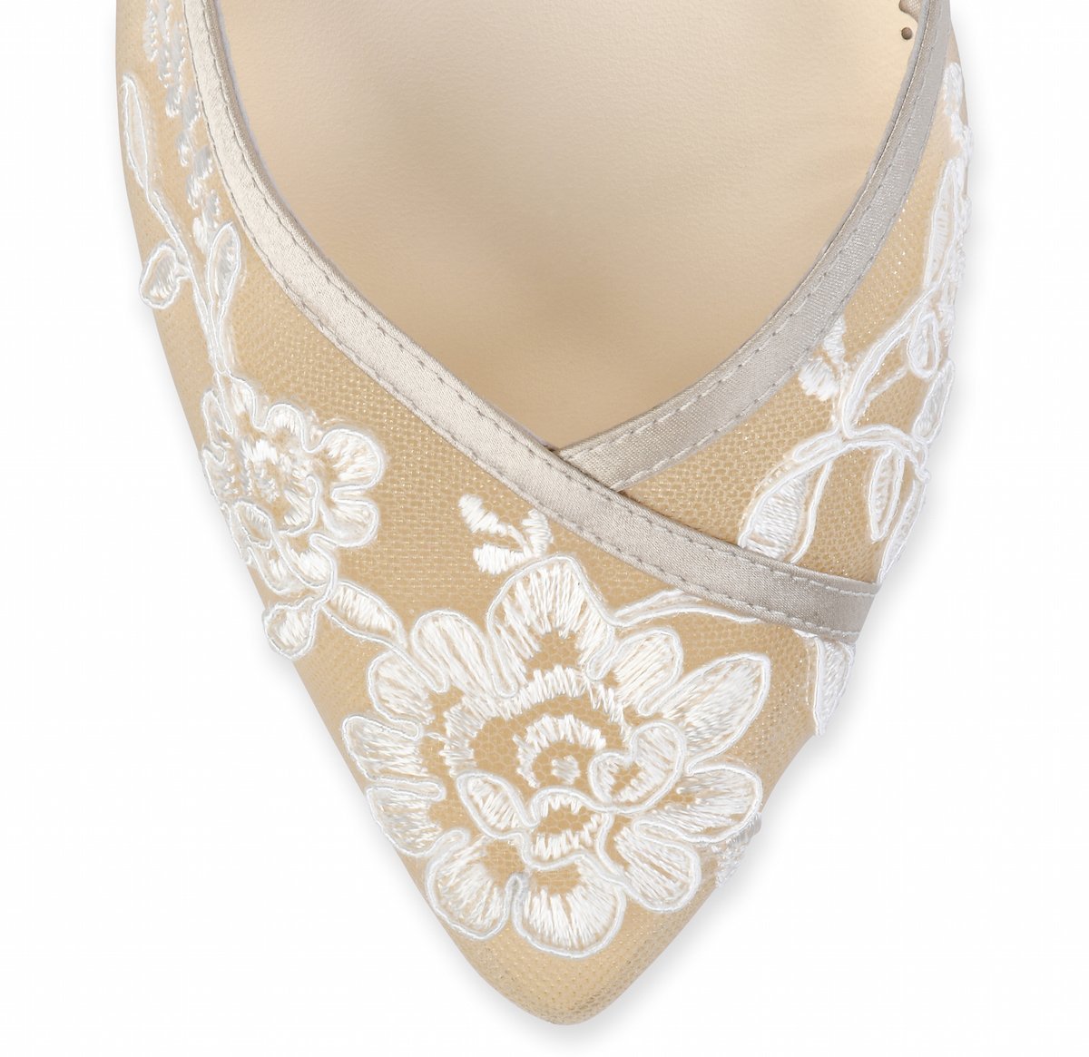 Adorned with embroidered ivory lace intertwined with vines on nude-coloured mesh, Chelsea makes for a romantic and feminine wedding block heel. The D’orsay shoe shape is a sexy take on a classic pump as it exposes the curved instep of the foot. Add the ankle strap for secure fitting to make this the perfect wedding shoe for all women. You can now walk on grass!