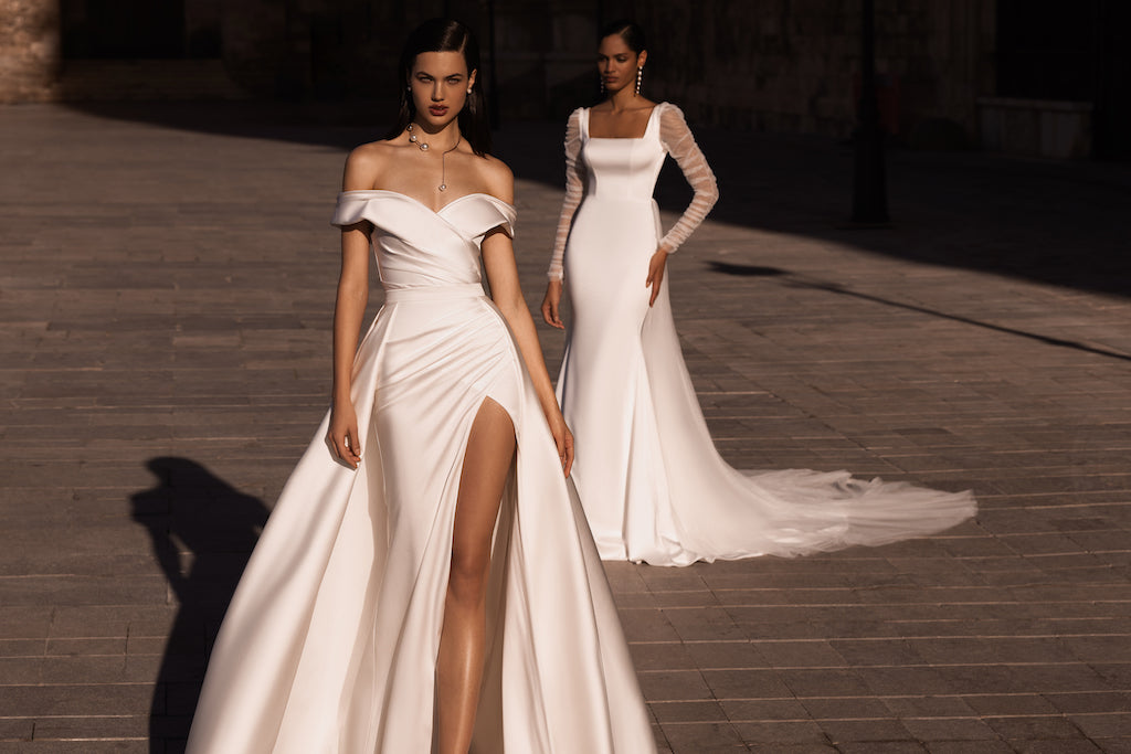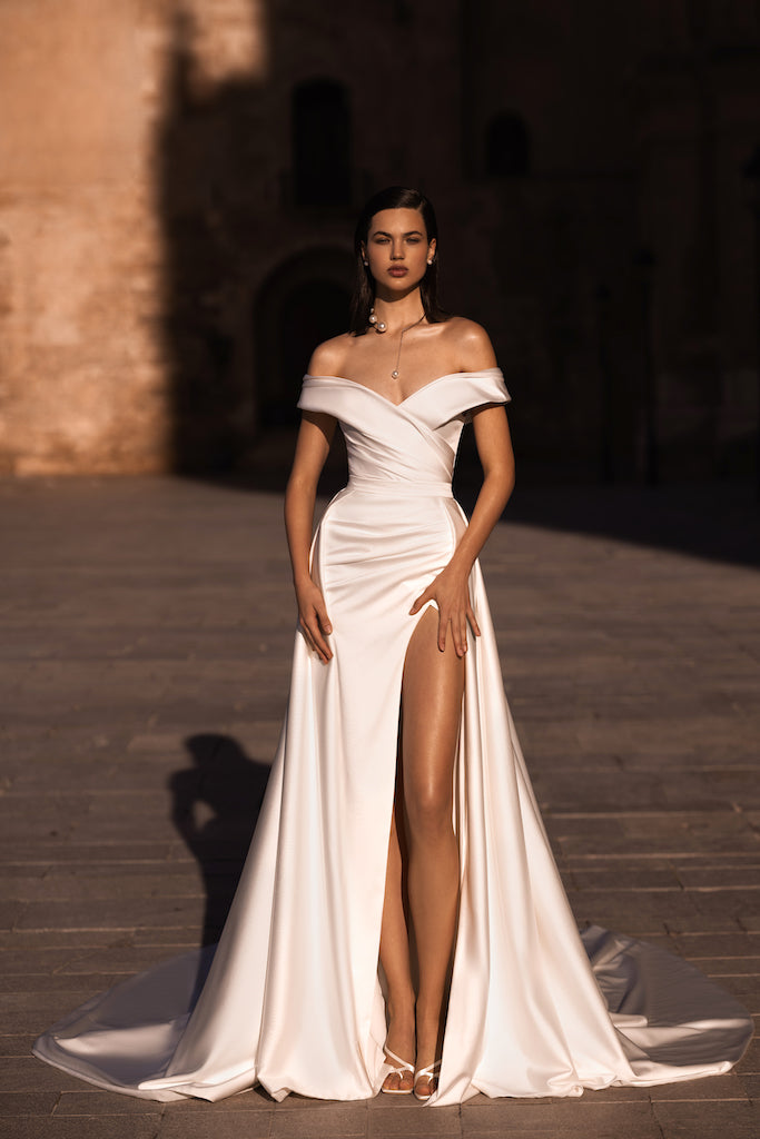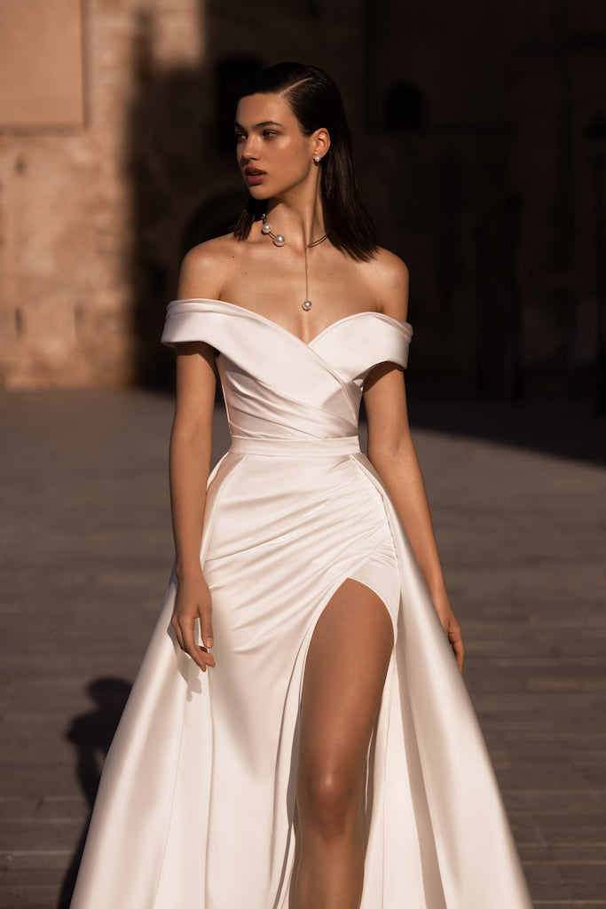 Demia by WONA is a stunning sheath wedding dress, an epitome of modern elegance and sophistication. Crafted from lustrous glossy fabric, it gracefully hugs your curves, exuding confidence and allure. The draped off-shoulder corset with a sweetheart neckline accentuates your feminine grace, framing your colletage with a touch of romance. The skirt features a sultry slit, adding a hint of allure and allowing for easy movement as you glide down the aisle. For an added touch of versatility, a detachable overskirt is included, allowing you to transform your look effortlessly from ceremony to reception. With its impeccable design and attention to detail, this sheath wedding dress embodies contemporary luxury, ensuring all eyes are on you on your special day. Experience the perfect blend of style, comfort, and versatility as you create memories to last a lifetime.