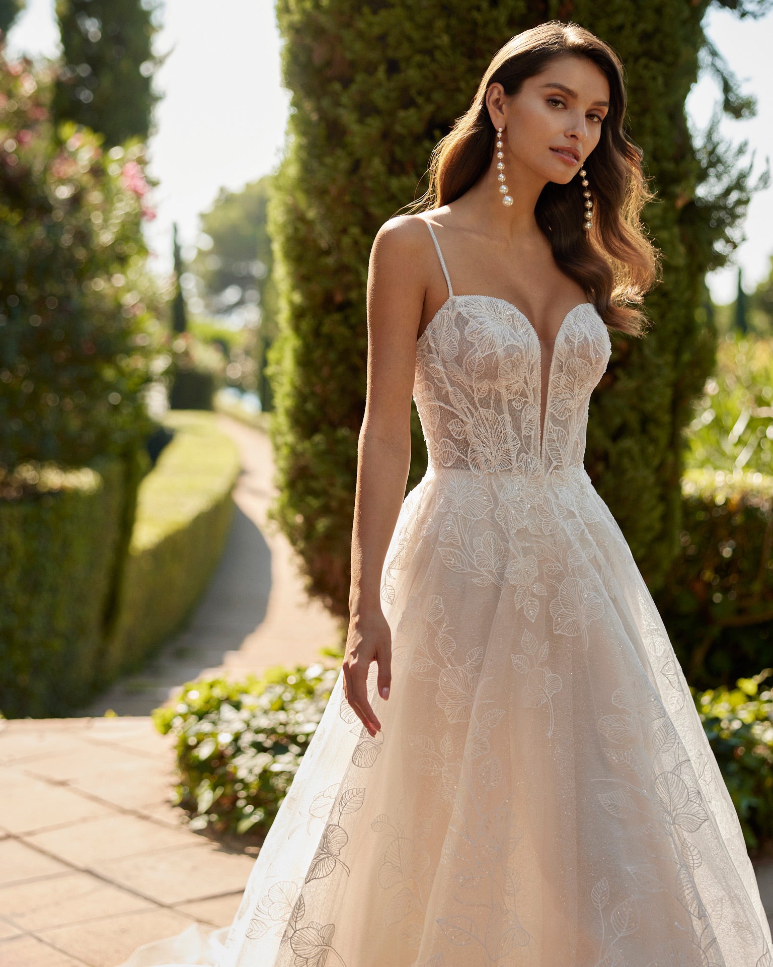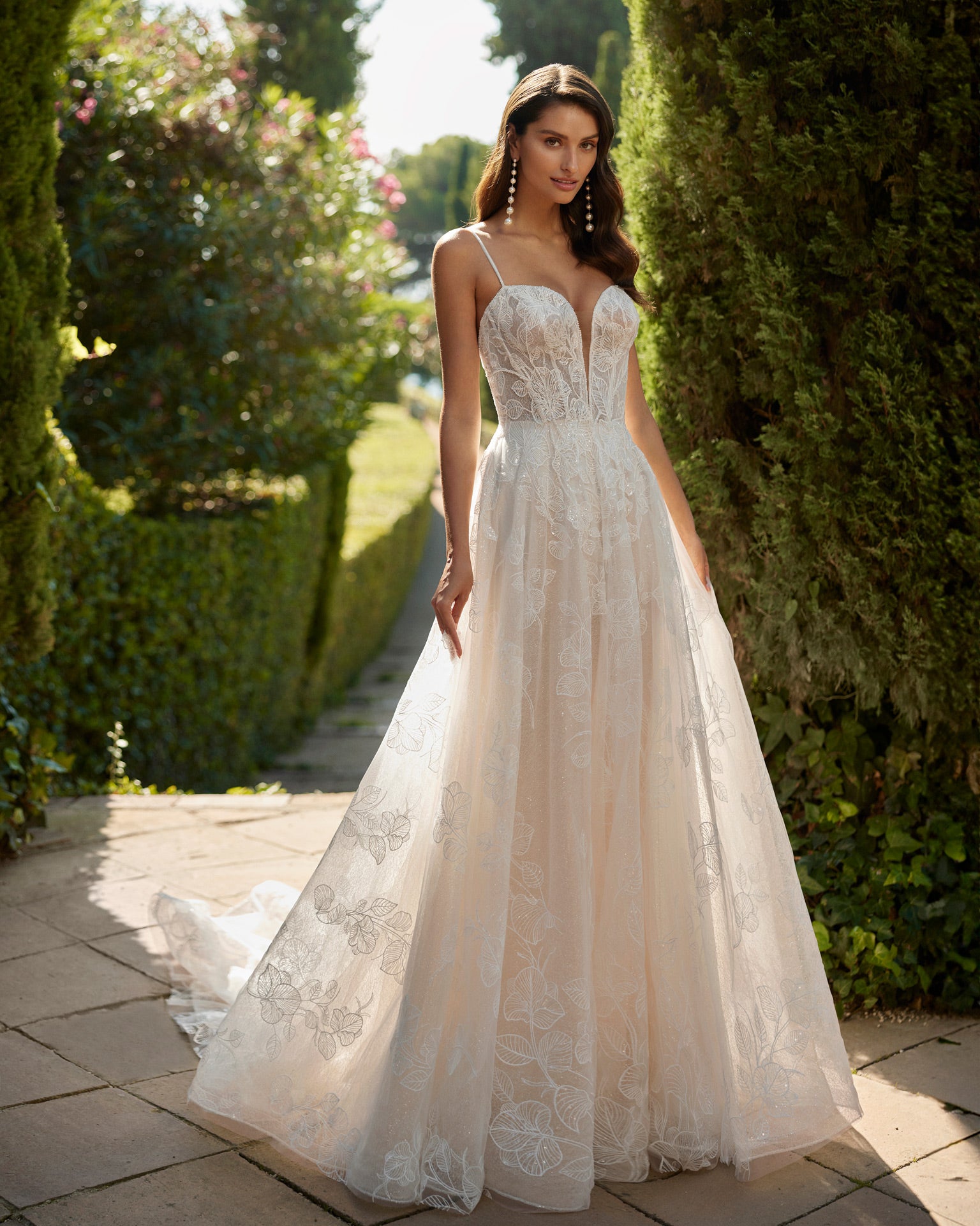 Devine by Adriana Alier is a modern A-line wedding dress that combines glamour and sophistication. Crafted from delicate lace, rhinestones, and glitter tulle, this gown sparkles with every movement. The plunging neckline adds a touch of allure, while the crossed straps at the back create a striking and elegant silhouette. An exclusive design by Adriana Alier, Devine is the perfect choice for brides who want to shine on their special day with a contemporary yet timeless bridal look.