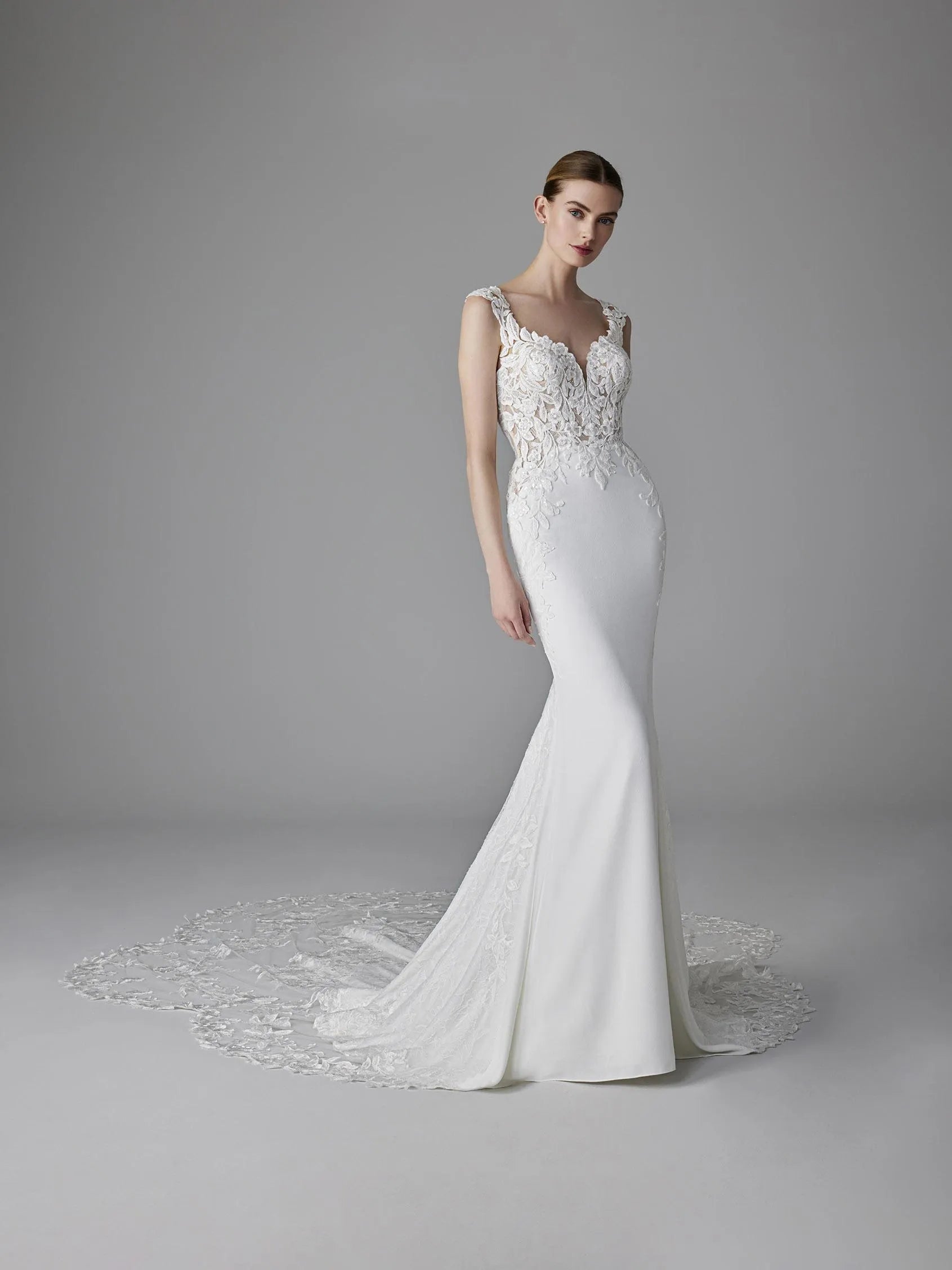 Pronovias Dion is perfectly complemented by the romantic details that make it a model as attractive as it is beguiling. The enchanting bodice with sweetheart neckline, rounded back and wide straps is fully covered with lace and rhinestones, while the sophisticated mermaid skirt made of crepe is fitted to mid-thigh and gently opens to a magnificent lace-trimmed sheer train.