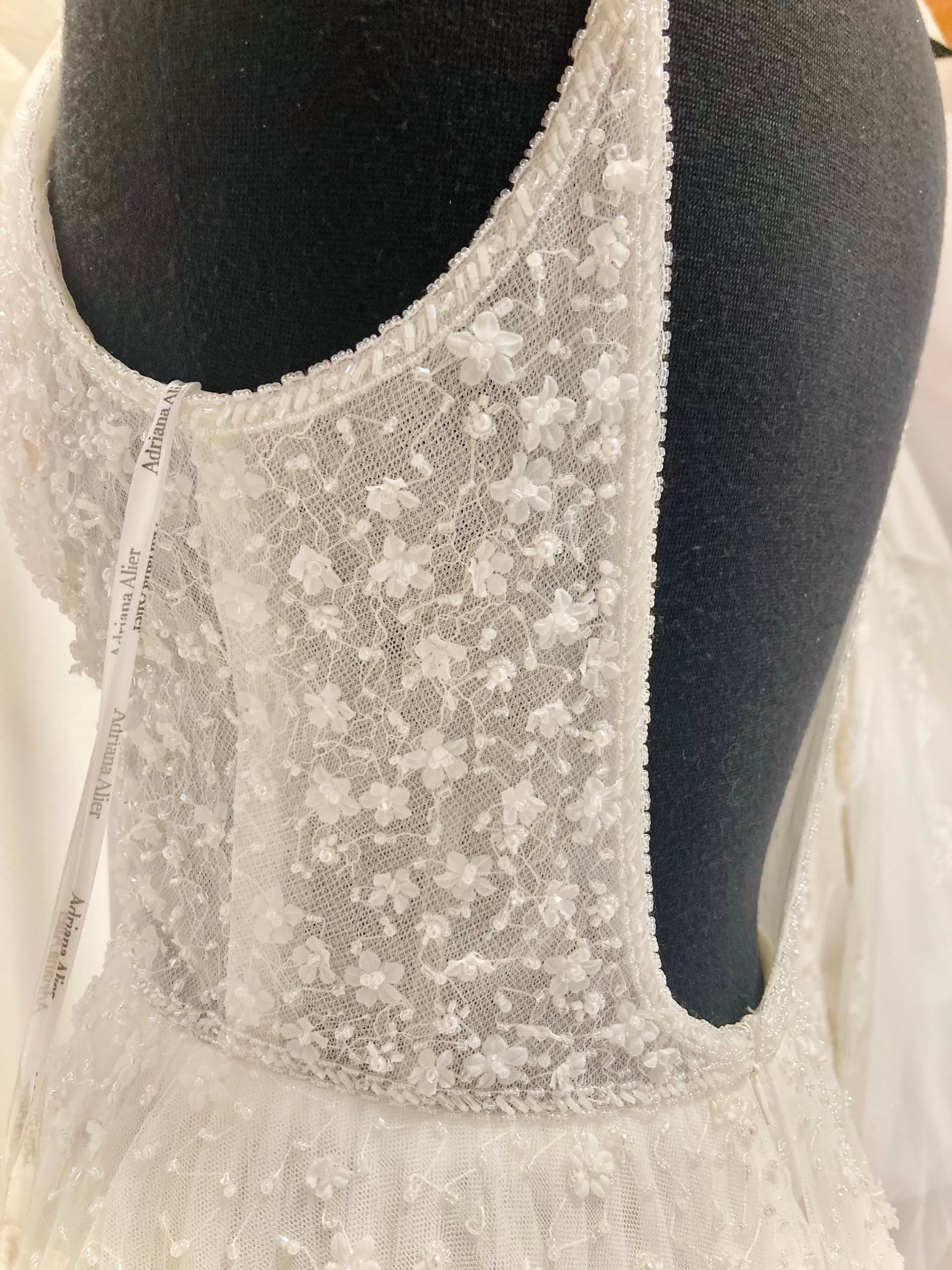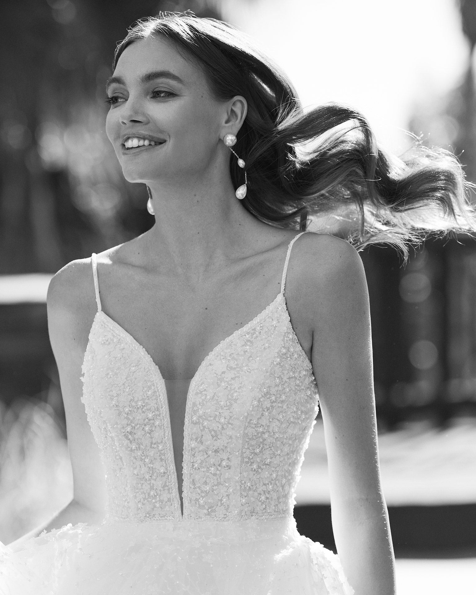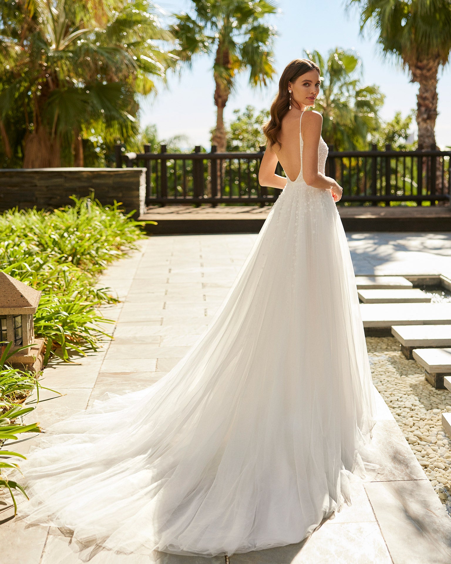 Hidra by Adrianna Alier. Hidra is a beautiful A-line wedding dress, with a full skirt made of tulle combined with embroidered lace. The top has a deep-plunge neckline, and an open back with delicate straps.