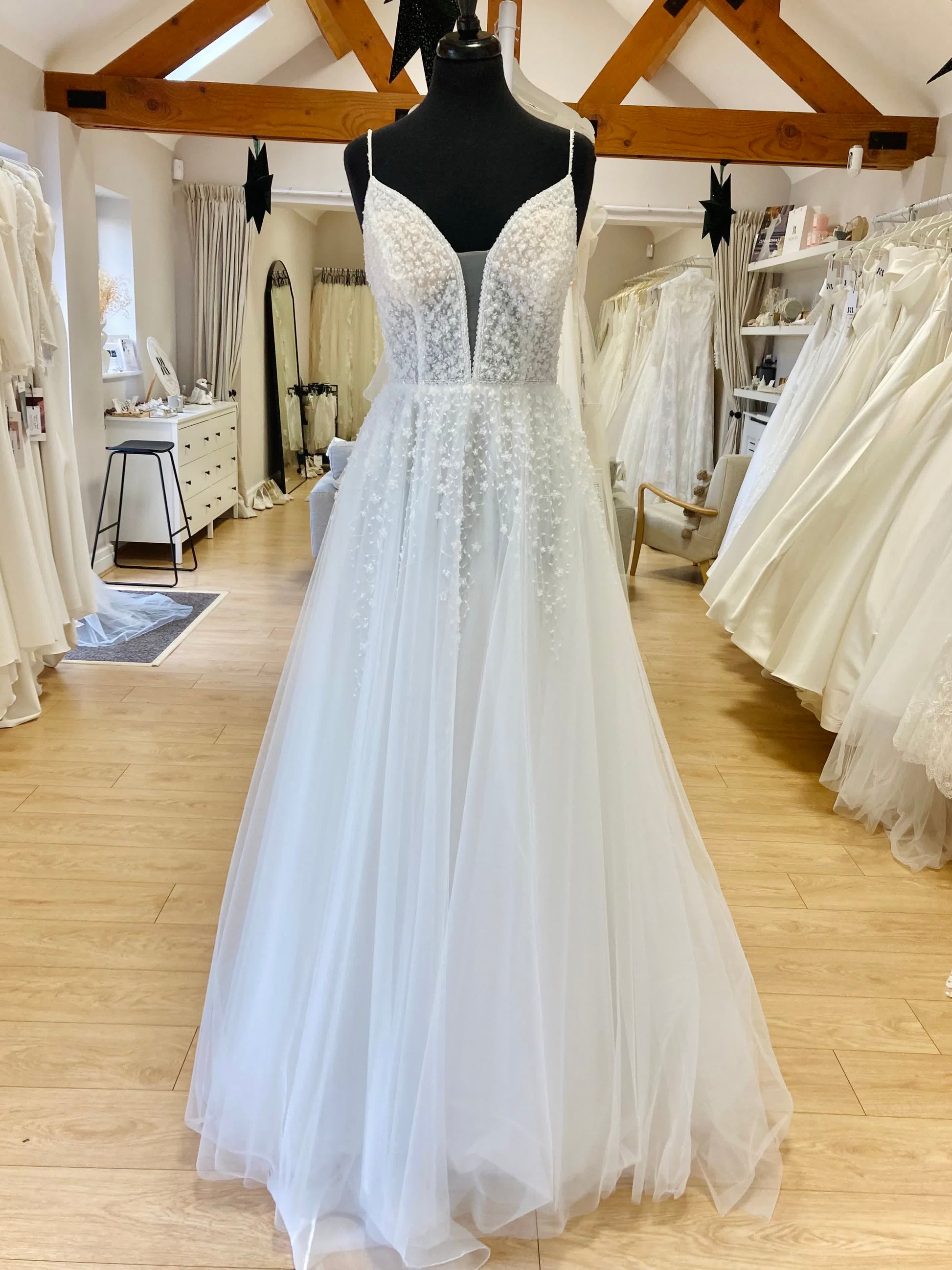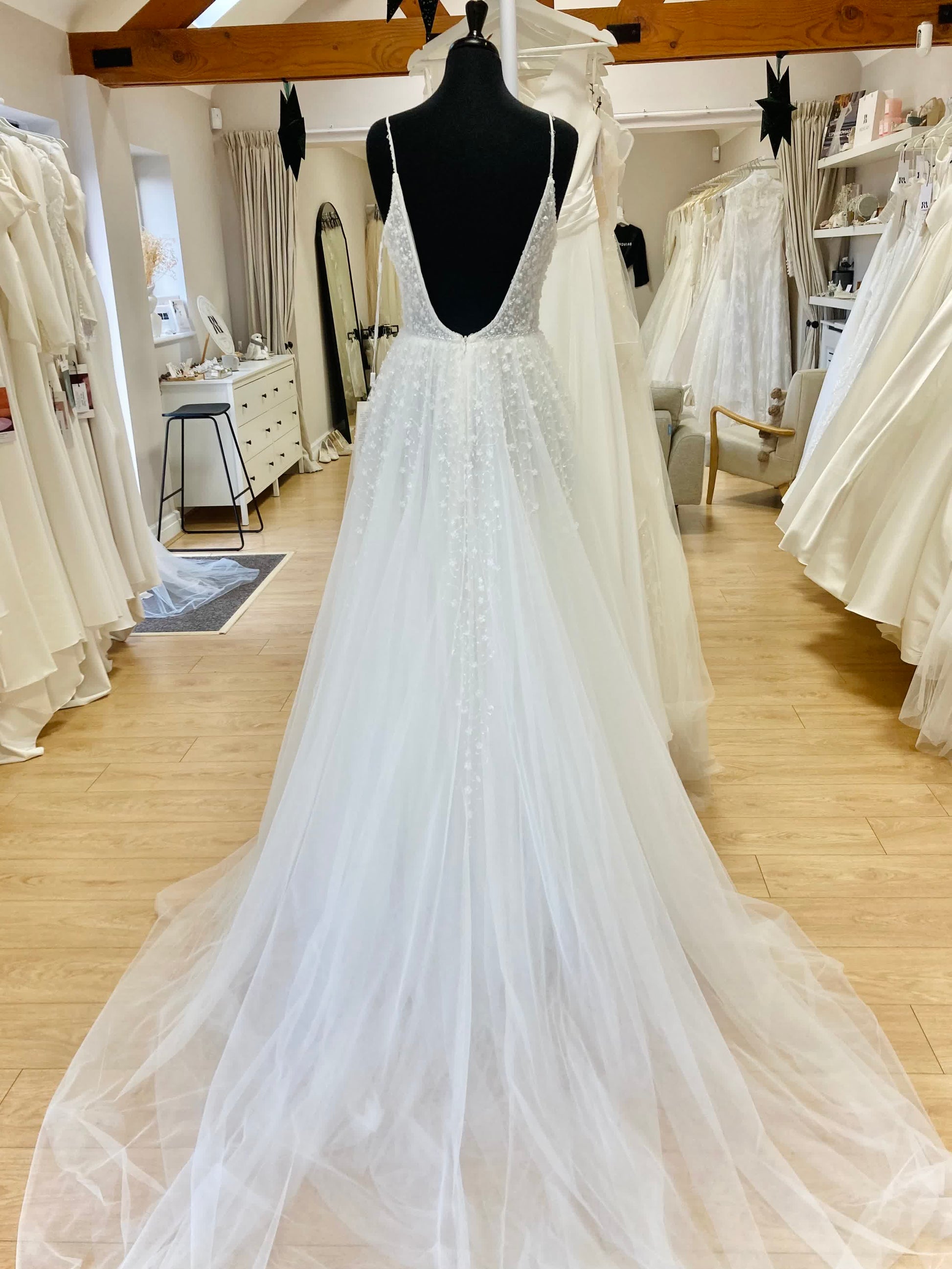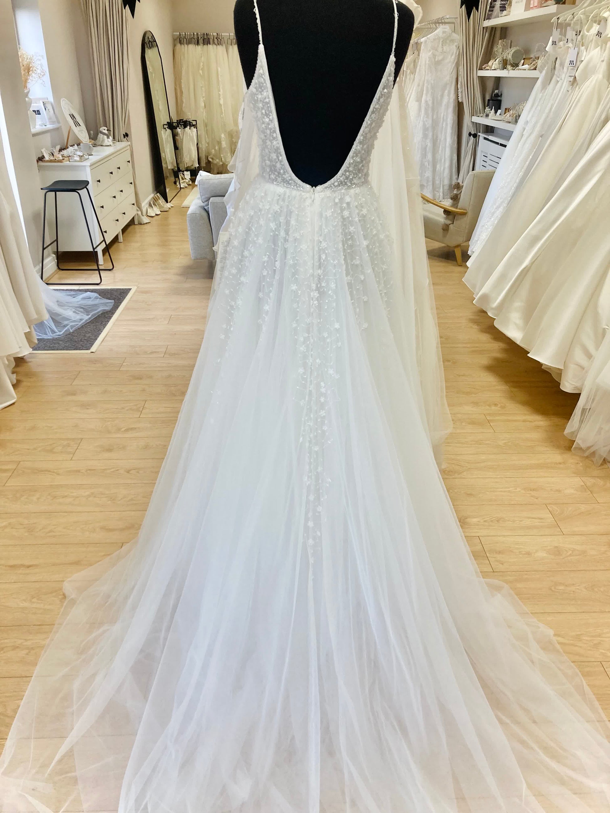 - Repairs required: Yes. Beading on straps needs repairing / replacement. Hook & eye needs replacing. This is a soft tulle skirt so it will likely have some small pulls as it’s a delicate fabric.