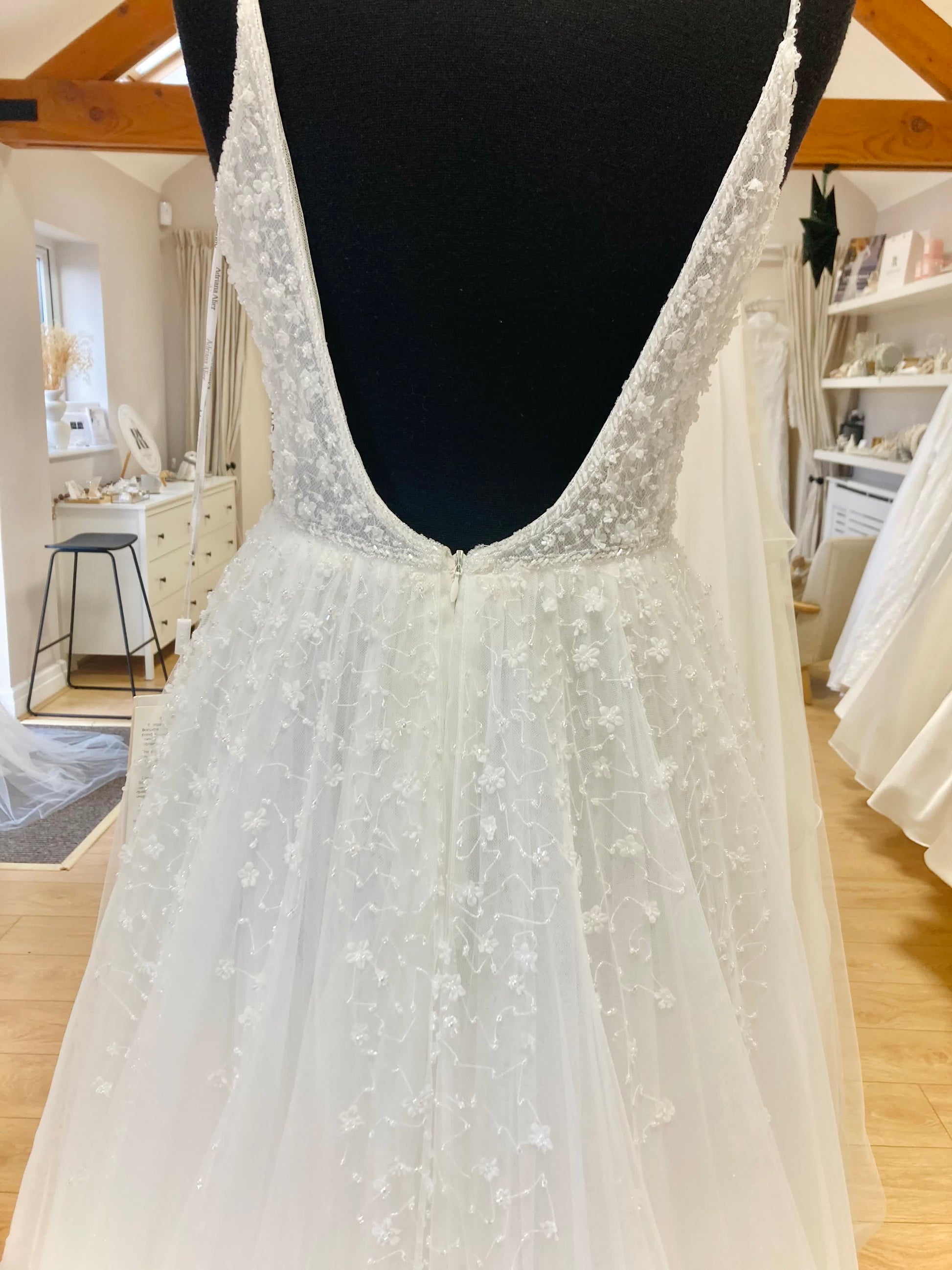 All sample dresses can be reduced in size up to 2 dress sizes. Please check your body measurements against those listed below. All sample dresses are sold as seen with defects, repairs and alterations are not included in the price of the dress.