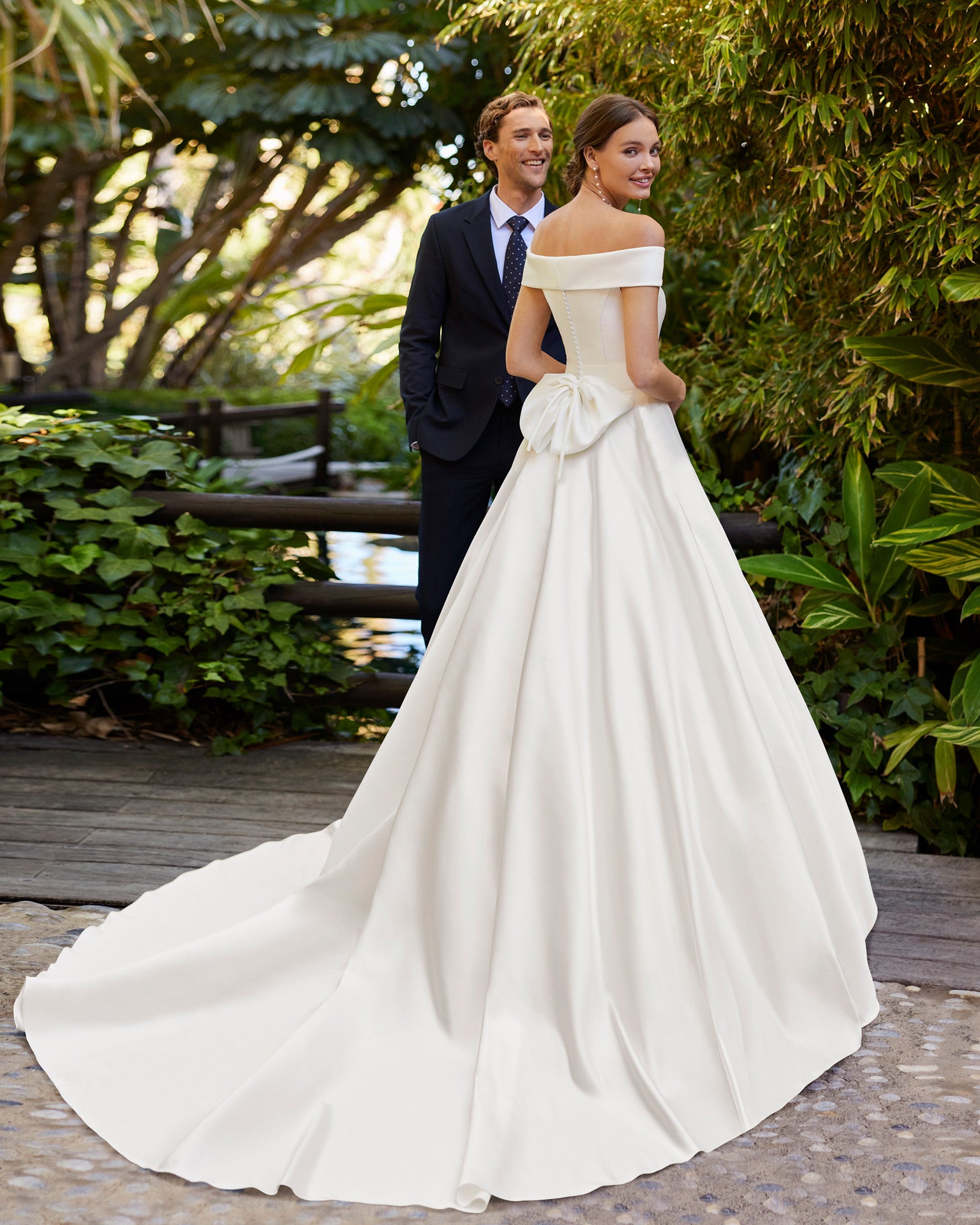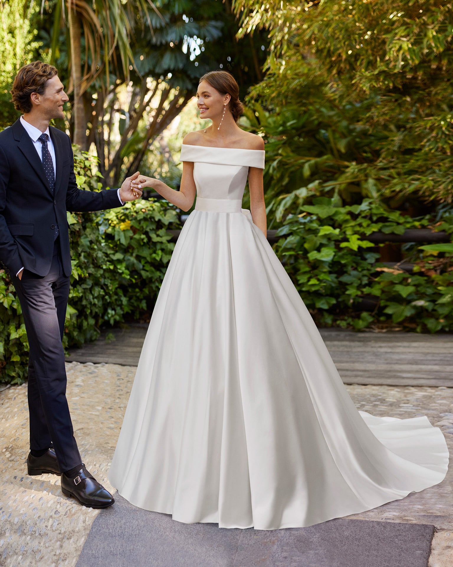 The "Holly" wedding dress by Adriana Alier is the perfect choice for brides seeking timeless elegance on their special day. This classic A-line wedding gown is beautifully crafted from luxurious matte mikado fabric, offering a sophisticated look that’s ideal for modern and traditional weddings alike. Featuring a flattering Bardot neckline, a full skirt with convenient pockets, and delicate button and bow details at the back, this dress combines style and practicality seamlessly. Whether you're shopping for the perfect bridal gown or exploring designer wedding dresses, the "Holly" is a stunning option to make your wedding day unforgettable.