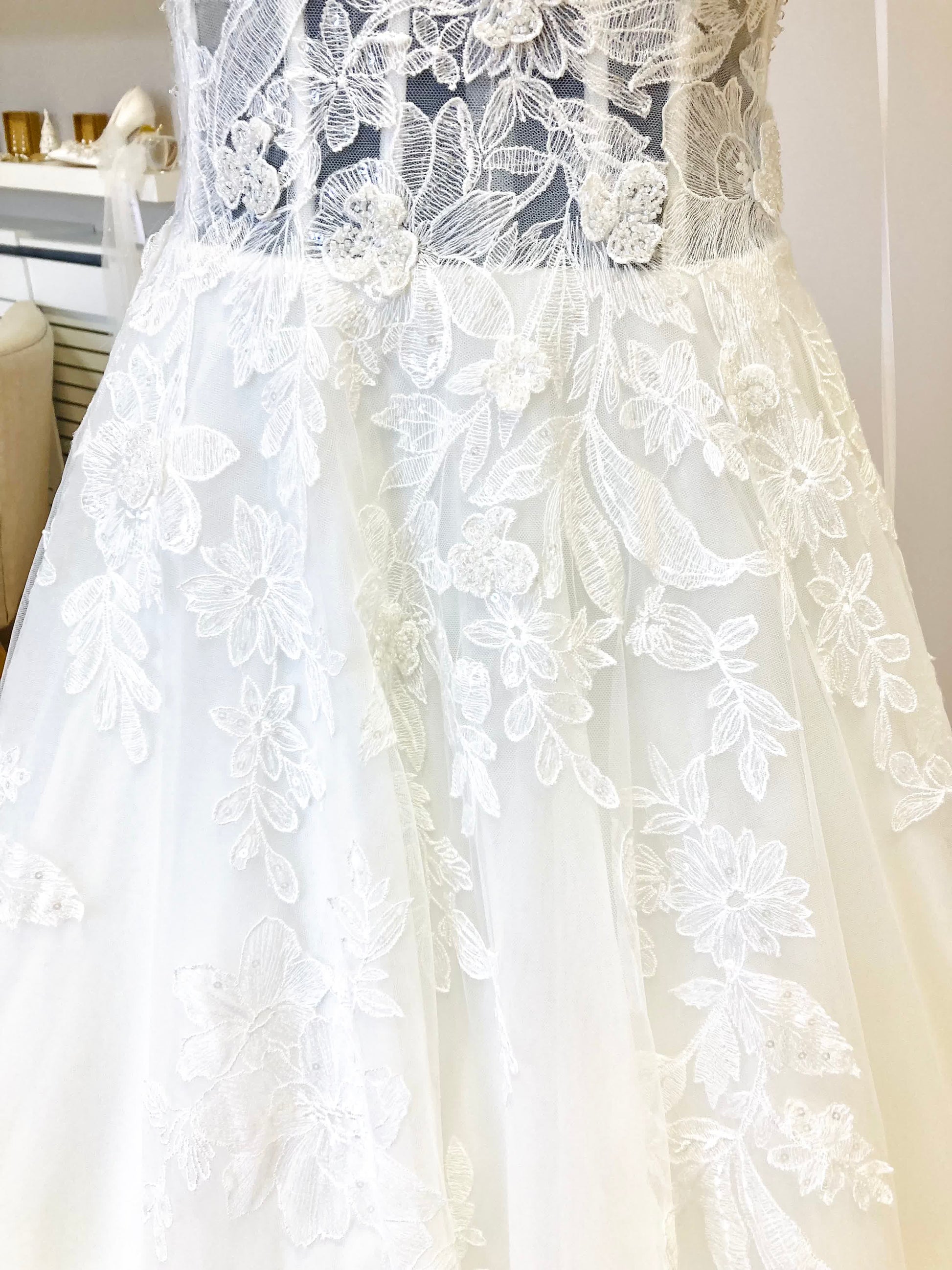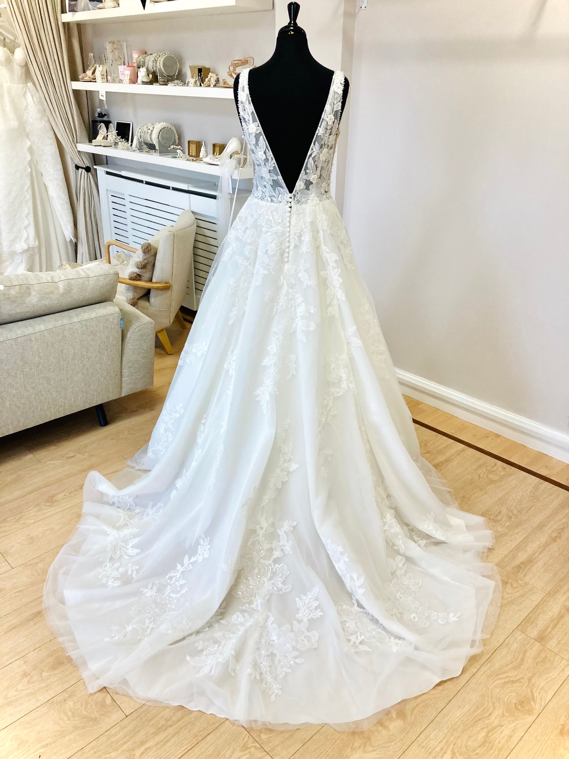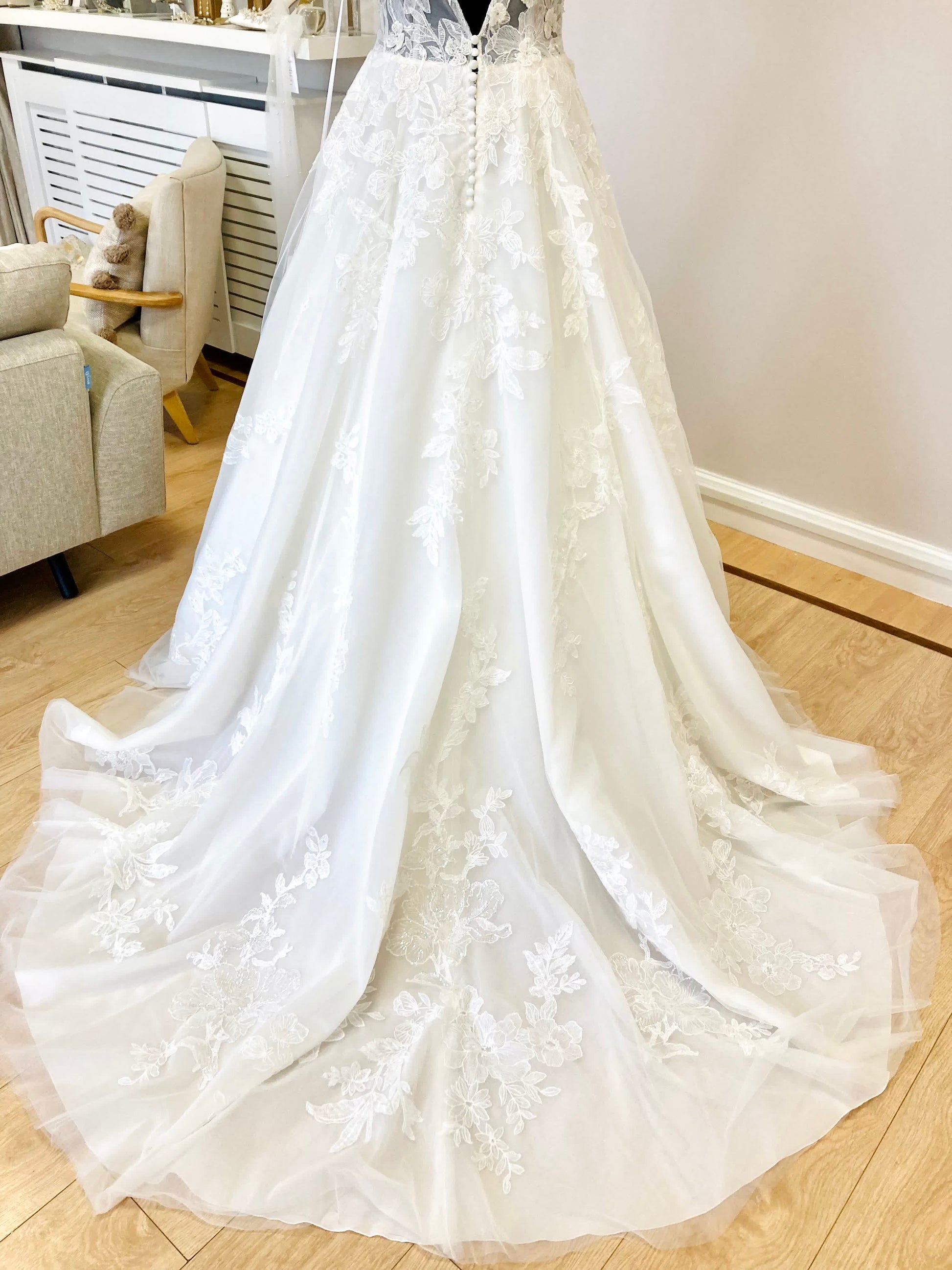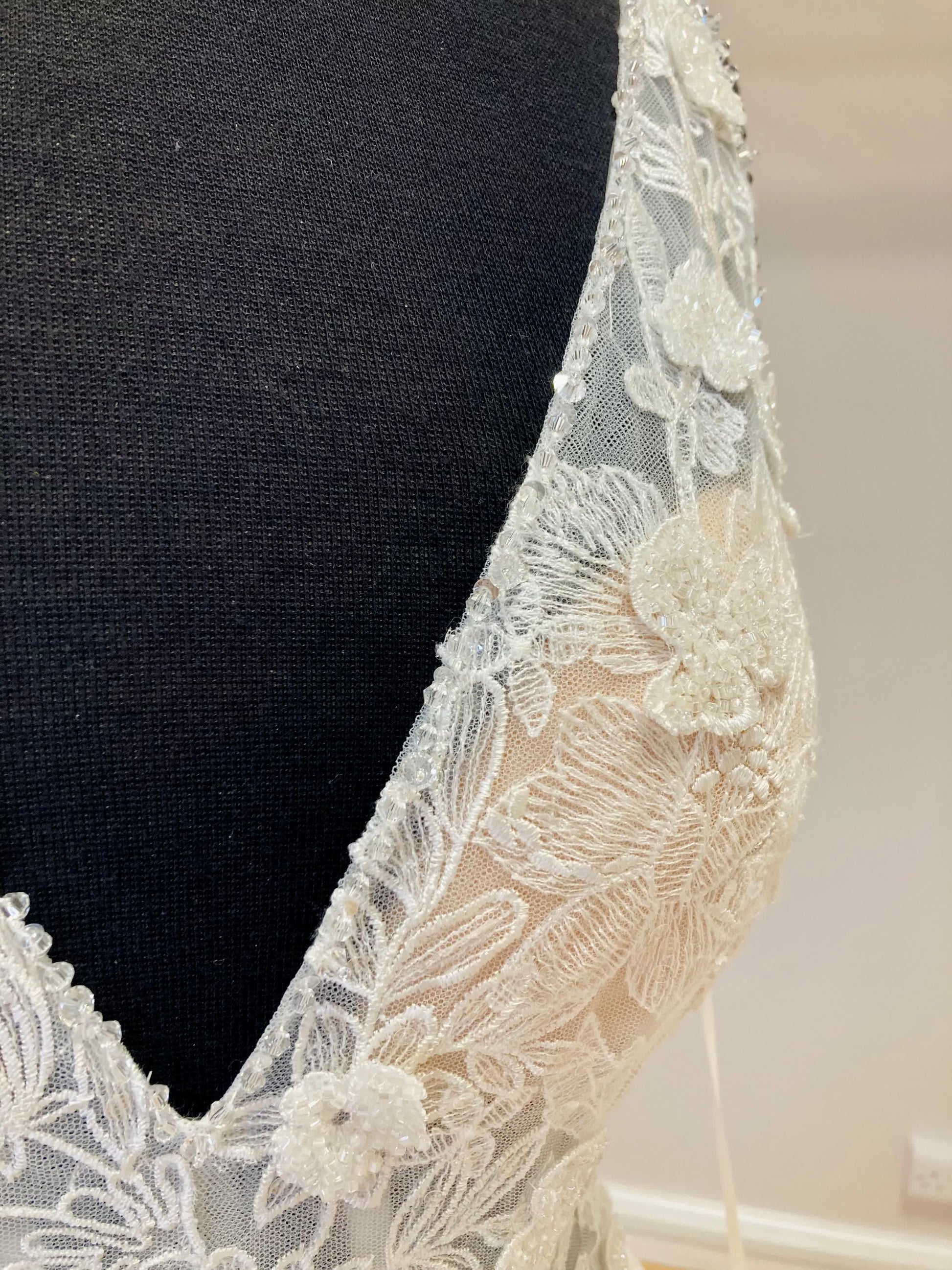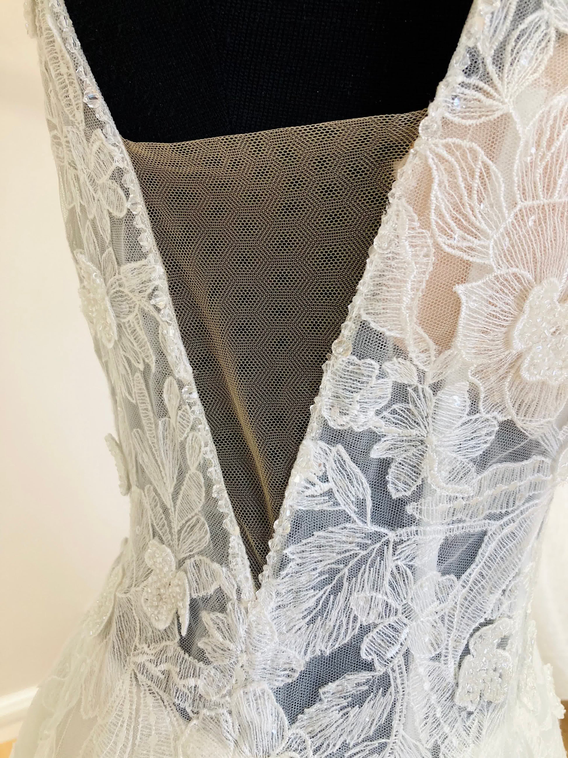 All sample dresses can be reduced in size up to 2 dress sizes. Please check your body measurements against those listed below. All sample dresses are sold as seen with defects, repairs and alterations are not included in the price of the dress.