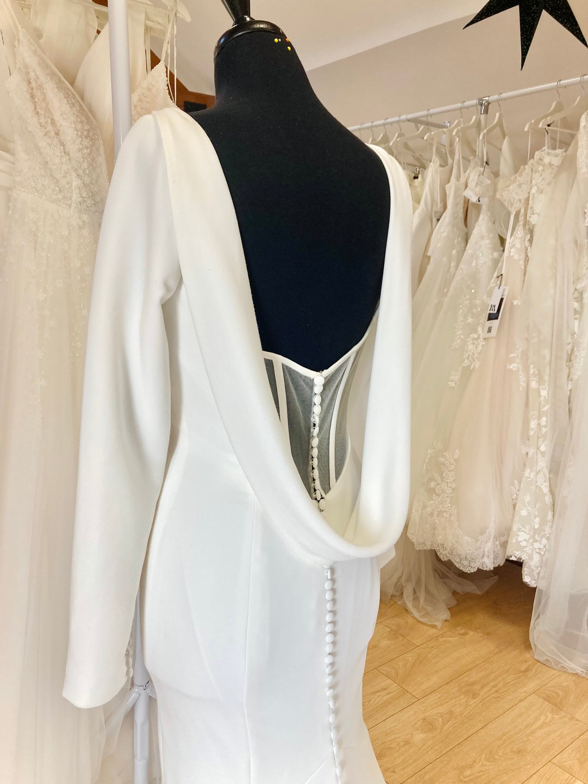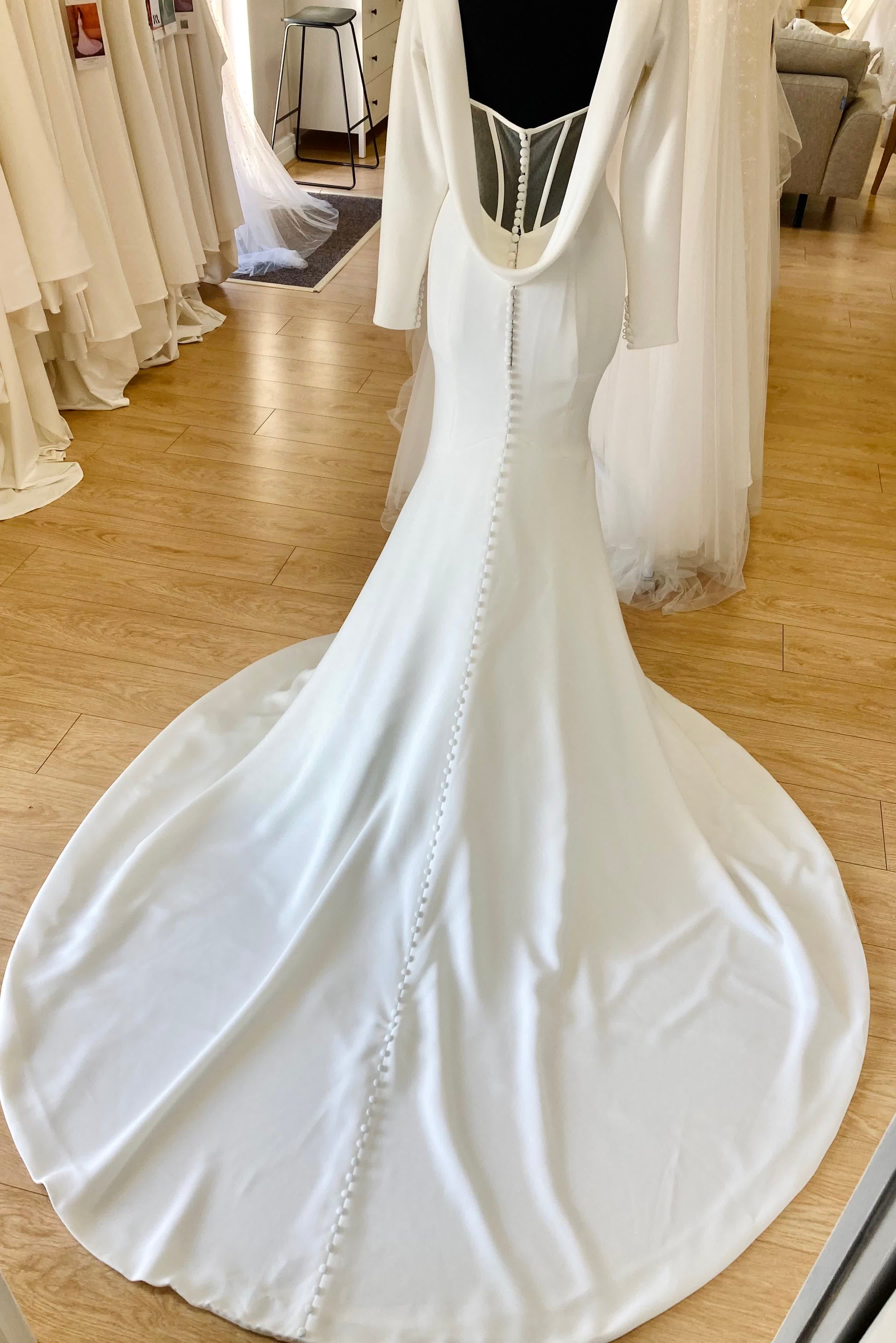 This crepe-back satin mermaid gown with long sleeves is effortlessly elegant. Its sleek, form-fitting design highlights clean lines for a sophisticated, structured look. The modest front contrasts beautifully with a stunning open illusion cowl back, featuring a sheer panel and a row of buttons down to the chapel train. Available in classic ivory, this gown is the perfect blend of timeless elegance and modern allure.