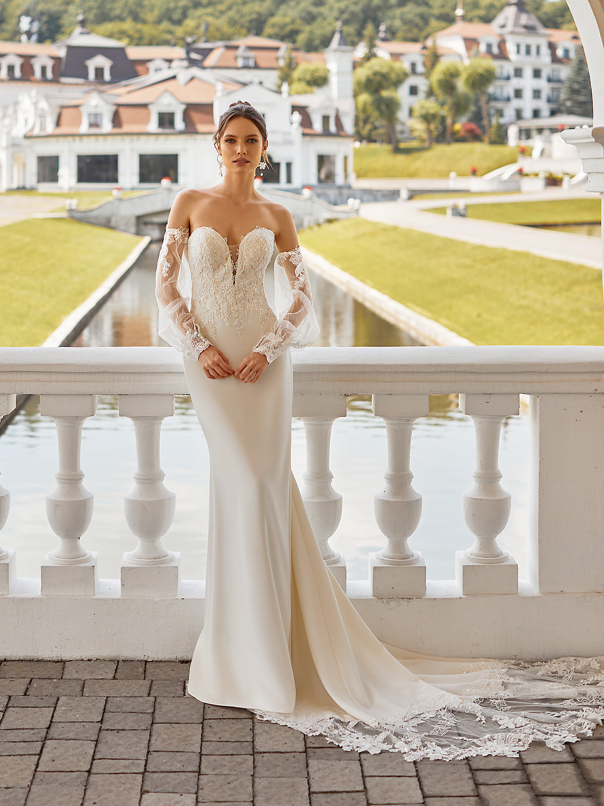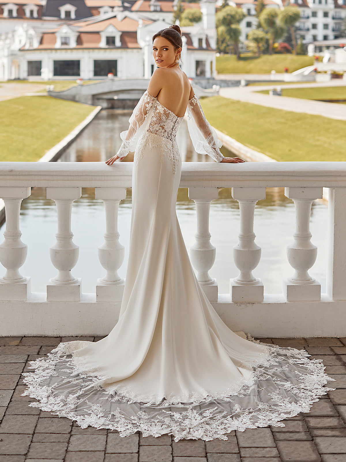 Style J6839 from the Moonlight Collection is a modern fairytale gown in regal crepe fabric. The soft mermaid silhouette hugs your figure, flowing into a chapel train. The open back features lace cutouts and net fabric for a romantic touch. Detachable bishop sleeves add versatility, letting you customise your look from ceremony to reception. Perfect for a bride who wants elegance with a personal twist.
