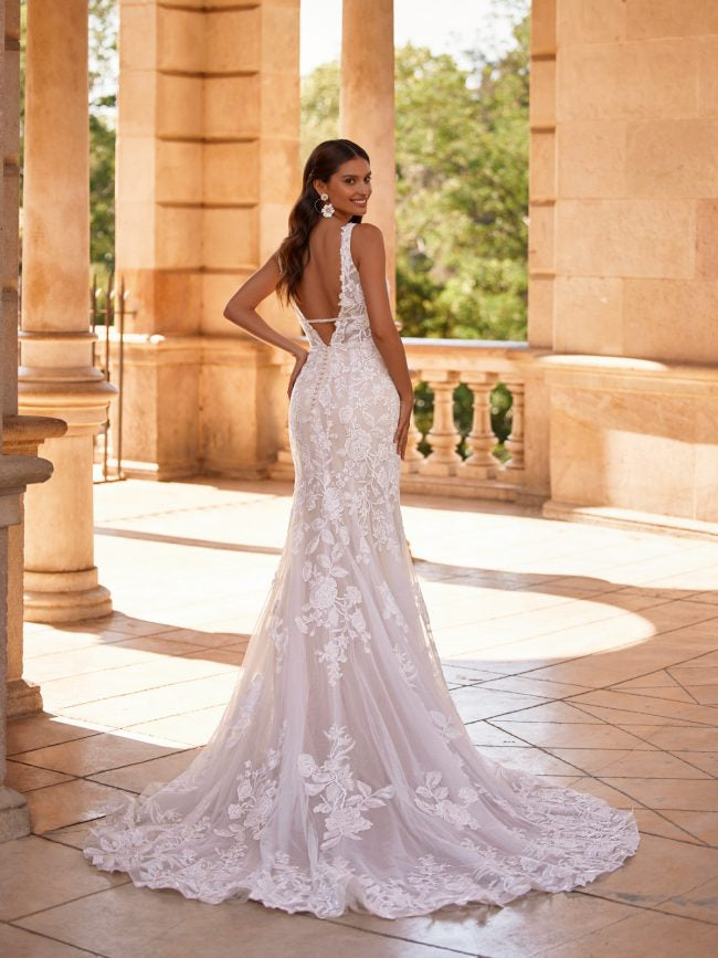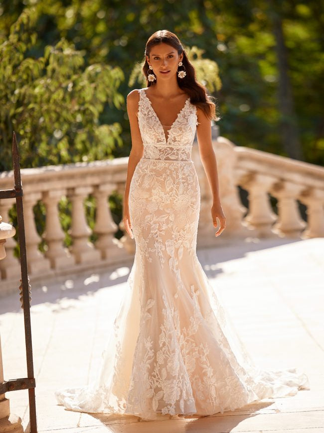 Moonlight Collection style J6876 is a romantic fit-and-flare gown with a deep V-neck and illusion V-back. Crystal-beaded bands at the waist add a fun touch, while floral lace appliqués and sparkling tulle flow from the bodice to the chapel train. Delicate lace wisps create a natural, organic feel. Easy to wear with a zipper and button closure, this gown is available in Ivory, Latte, Nude, or all-Ivory for a classic look.