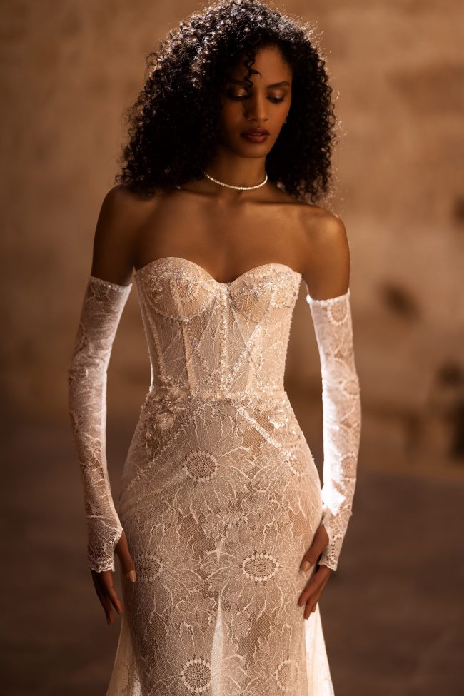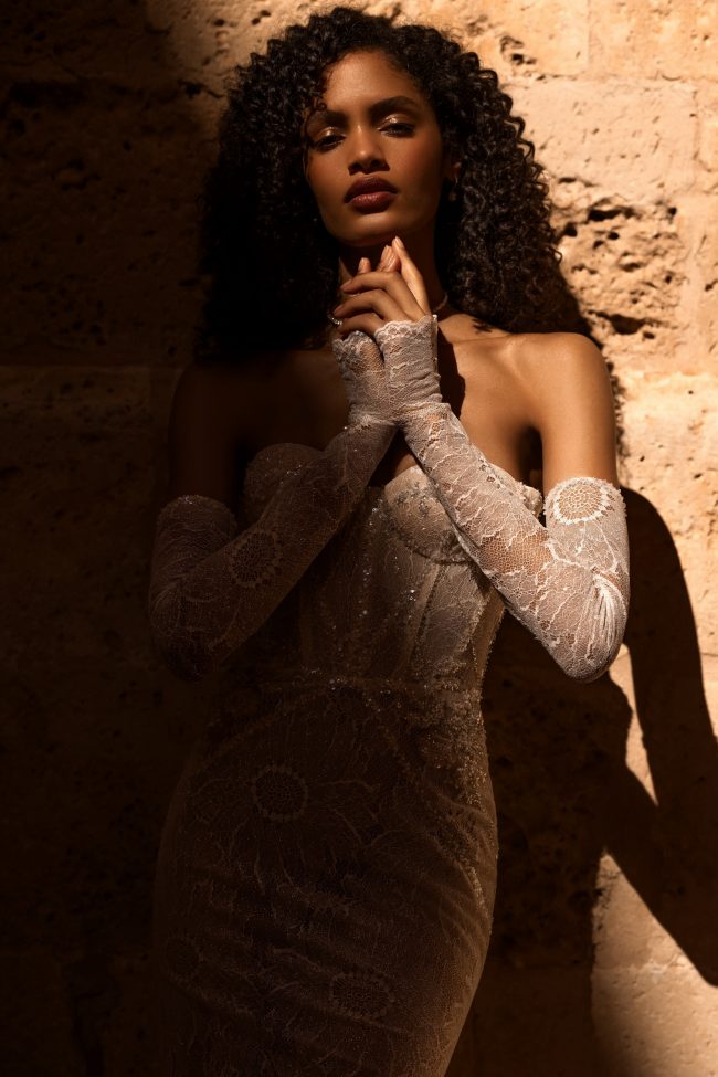 Jill by WONA is an exquisite gown crafted from delicate floral lace, creating a captivating and timeless look. The strapless corset, with its sweetheart neckline, accentuates your natural beauty and highlights feminine curves. For added versatility, the dress features detachable sleeves, allowing you to effortlessly transition from a classic strapless style to an elegant and romantic look. As you walk down the aisle, the mermaid silhouette gracefully follows your every move, creating a sense of enchantment and allure. The intricate floral lace pattern adds depth and texture to the dress, while the detachable sleeves offer a touch of versatility, allowing you to customise your look based on your personal preference.