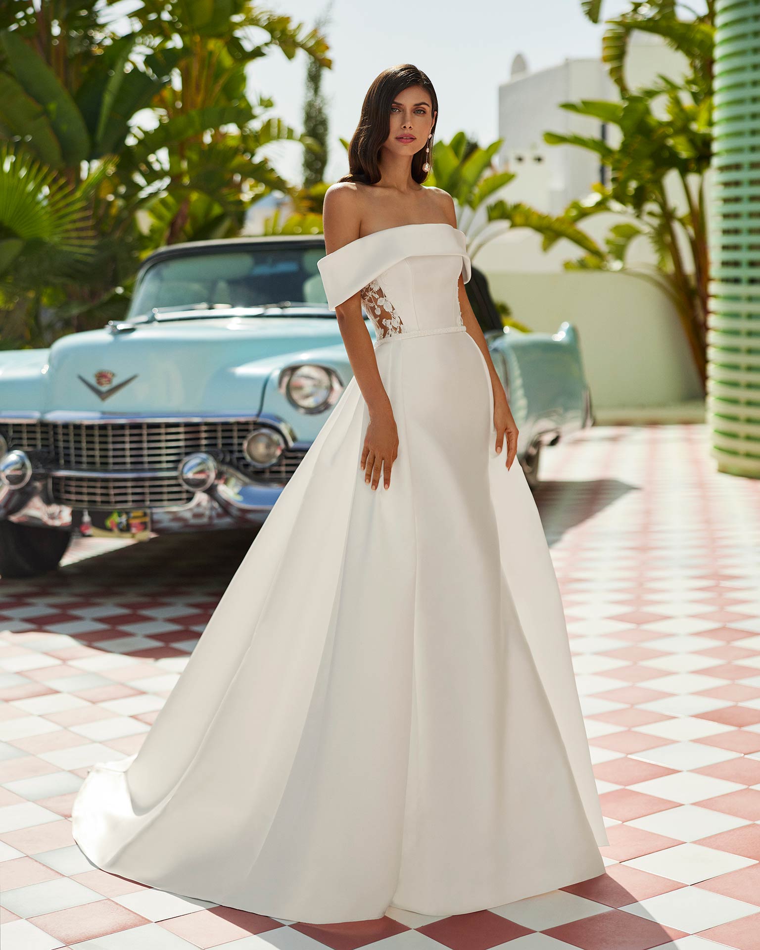 The look is elevated with a dramatic detachable overskirt, adding volume and grandeur for a true aisle-worthy moment. Wear it for your ceremony, then remove it to reveal a sleek, minimalist silhouette for the evening celebration.