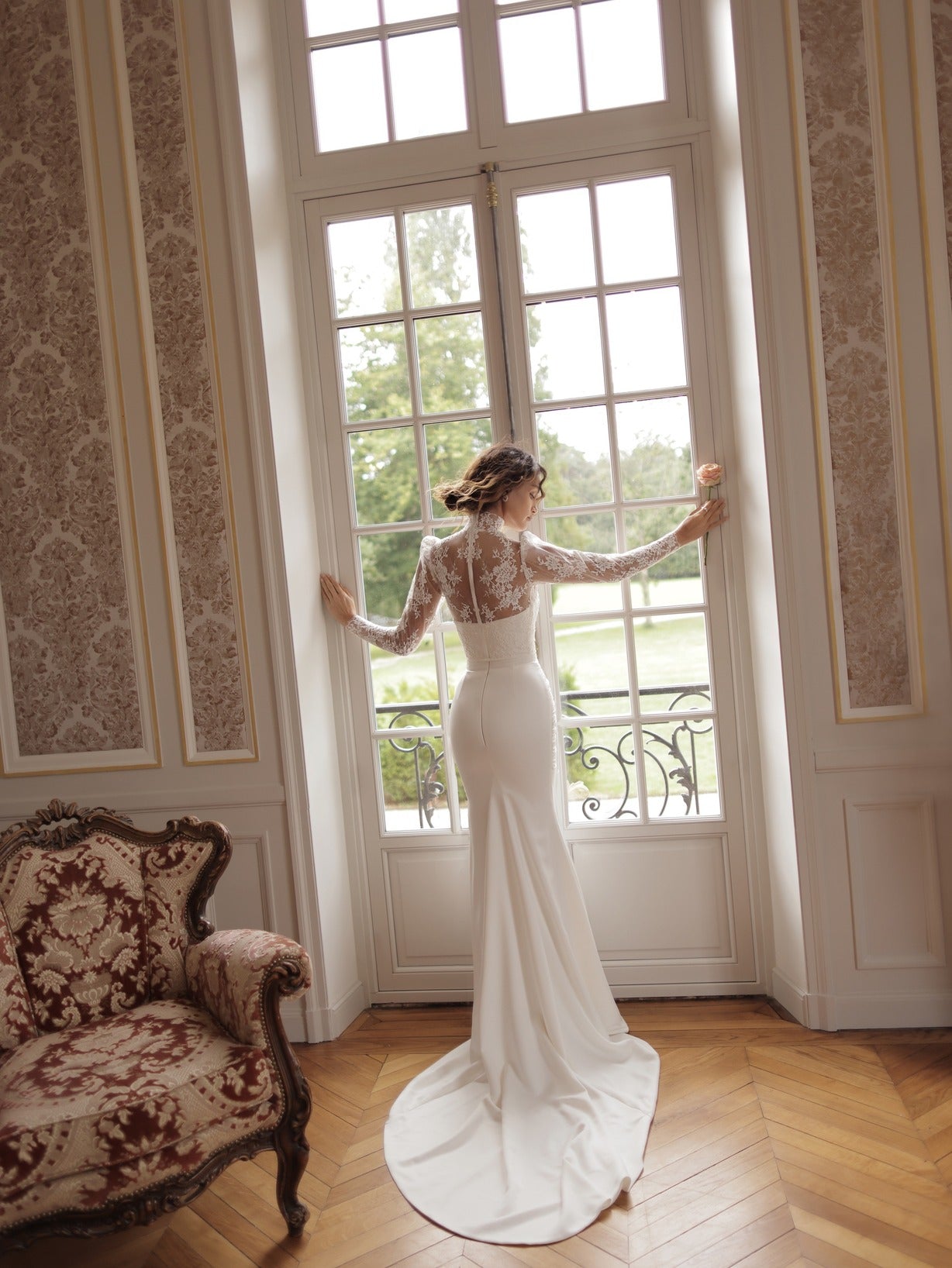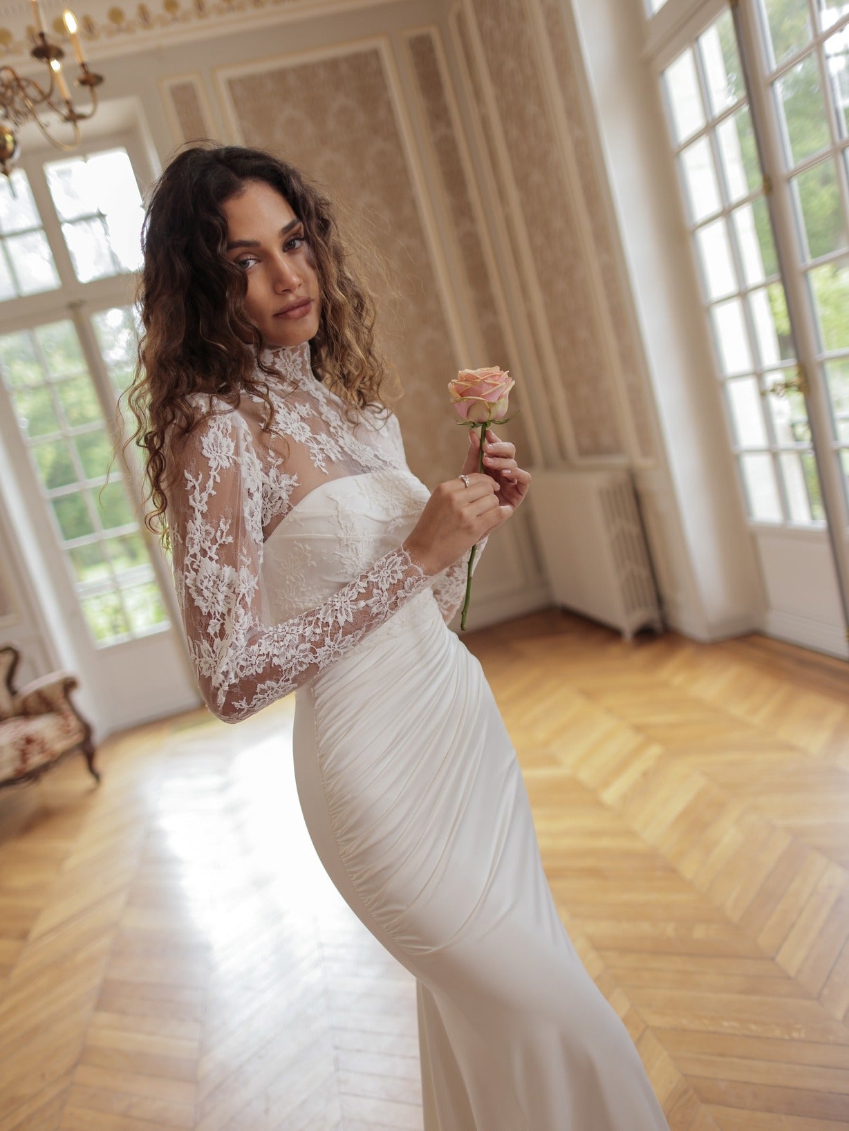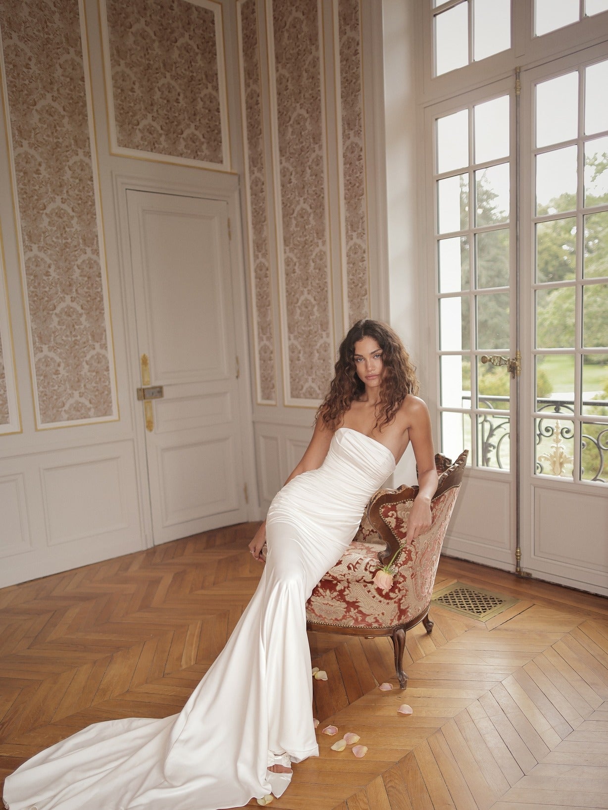 Kea by WONA is a luxurious silky trumpet wedding gown that exudes timeless sophistication. The wrapped mesh overlay creates soft, elegant drapes around the bodice and waist, beautifully enhancing and texturising the silhouette. This stunning design is perfect for brides seeking a sleek and refined look with an air of effortless elegance.