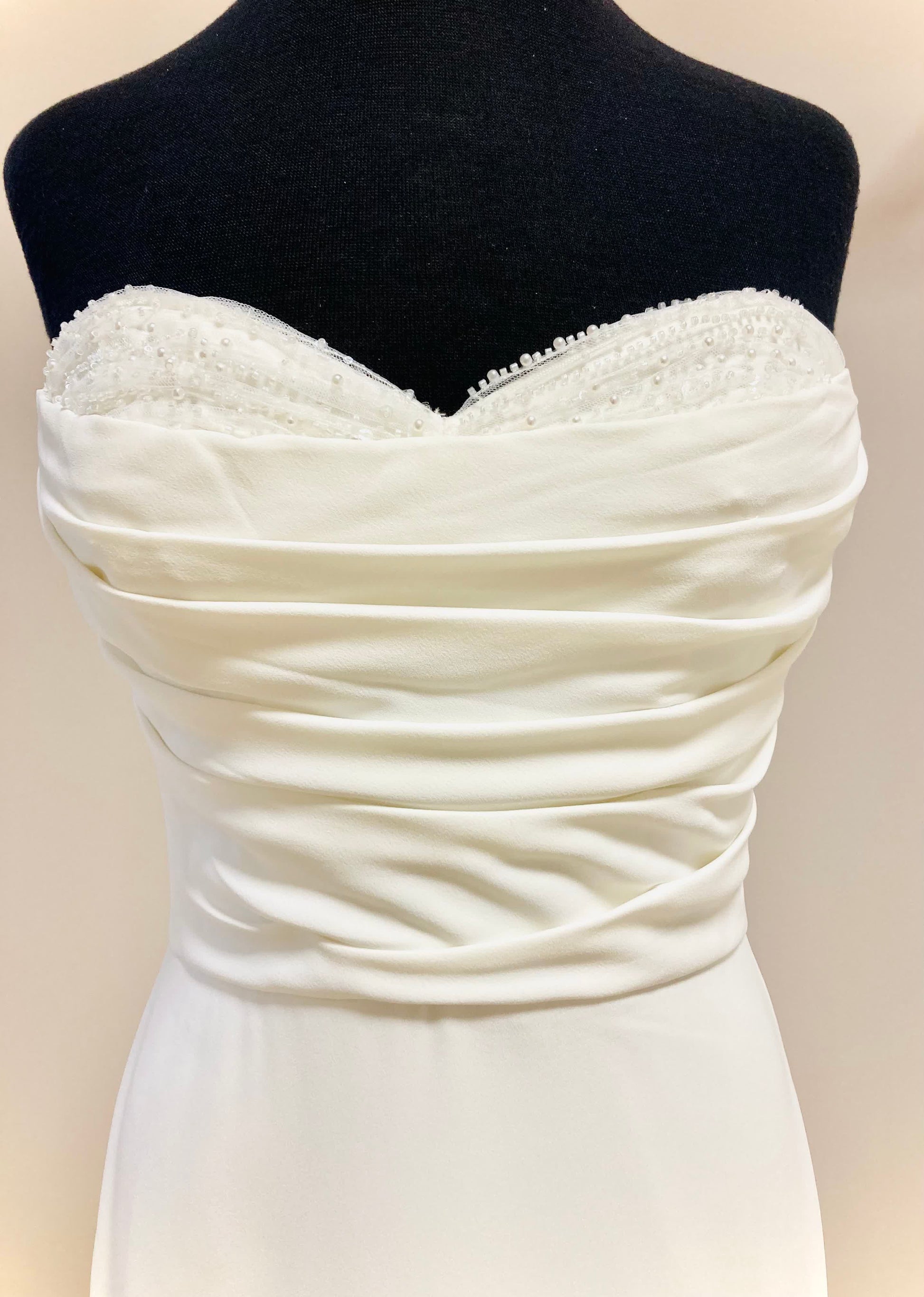 The Lark wedding dress by Theia is a strapless sweetheart crepe siren gown with pearl accents and covered buttons to the train hem.