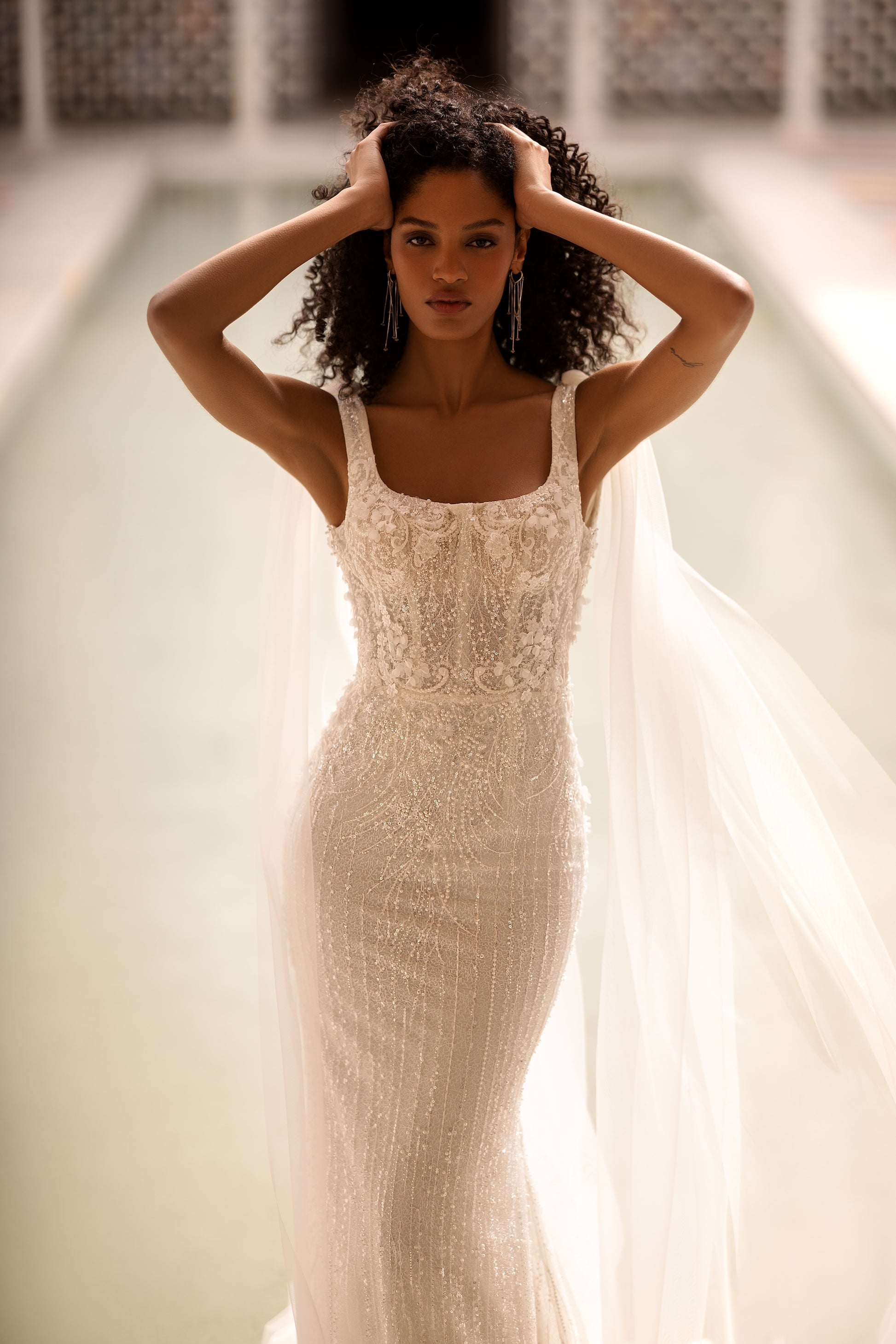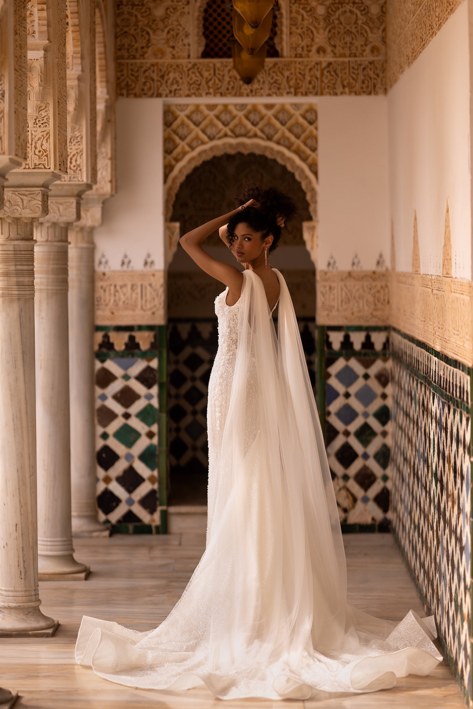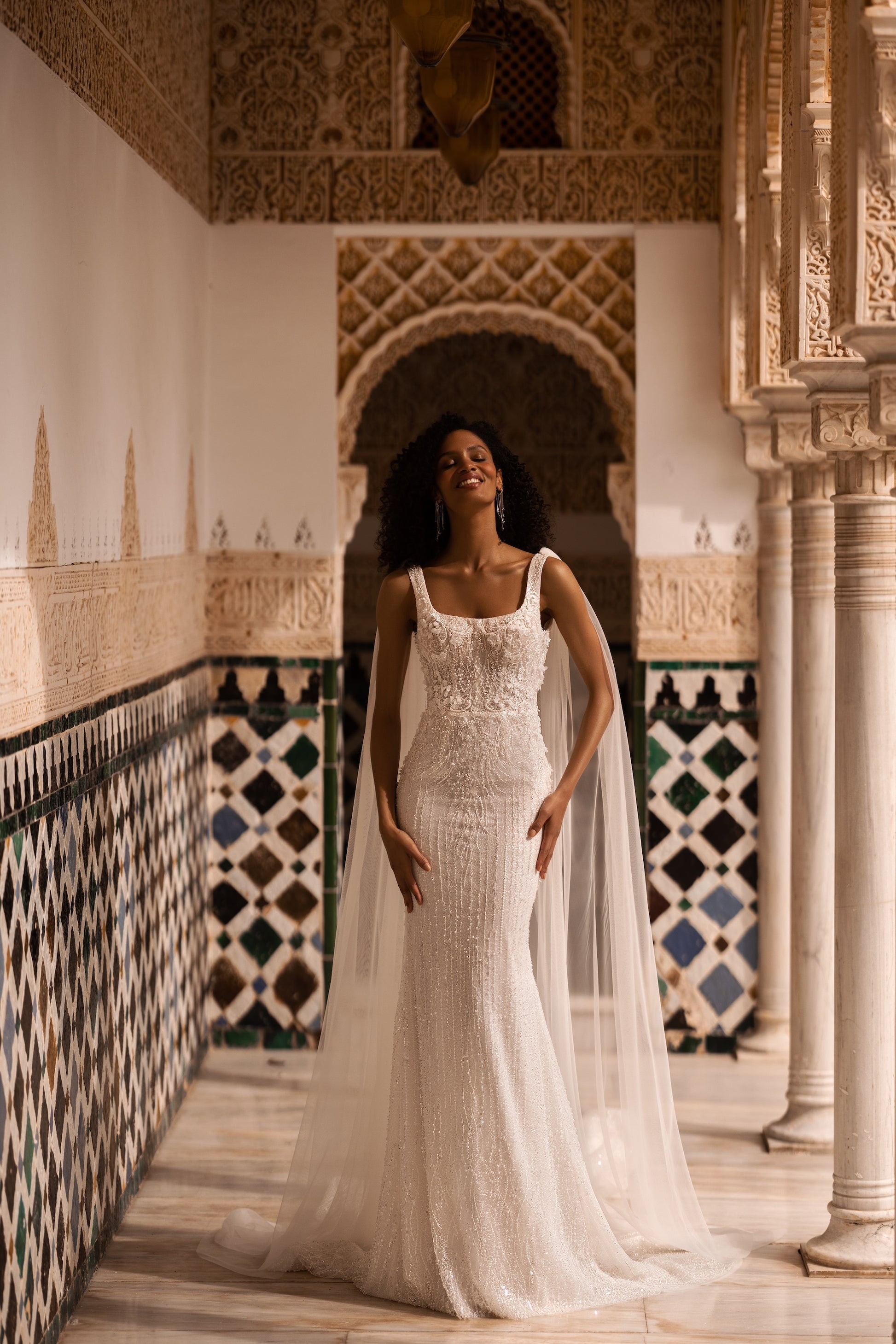 Malma by WONA. Malma is an exquisite gown crafted from intricate floral lace, meticulously adorned with delicate beads and pearls that catch the light and create a mesmerising effect. The corset, designed with slender straps and a sophisticated square neckline, beautifully accentuates your shoulders and dŽcolletage, enhancing your natural grace and allure. As an exquisite addition, a detachable tulle cape is fixed on the shoulders, adding a touch of ethereal beauty and creating a captivating aura as you walk down the aisle. The mermaid silhouette gracefully embraces your curves, creating a silhouette that is both alluring and romantic. Dress only - £2,000 - store sample Dress & cape - £2,000 Cape only - £200