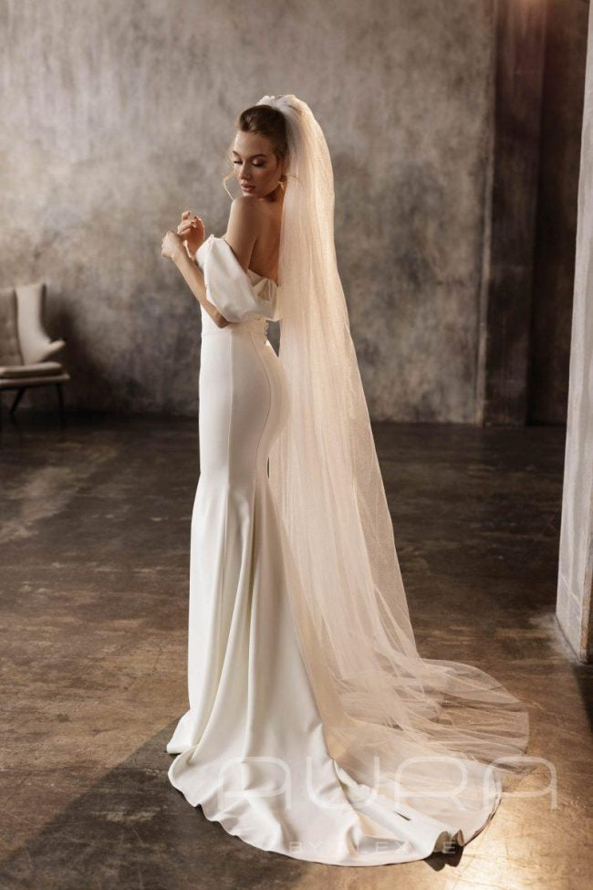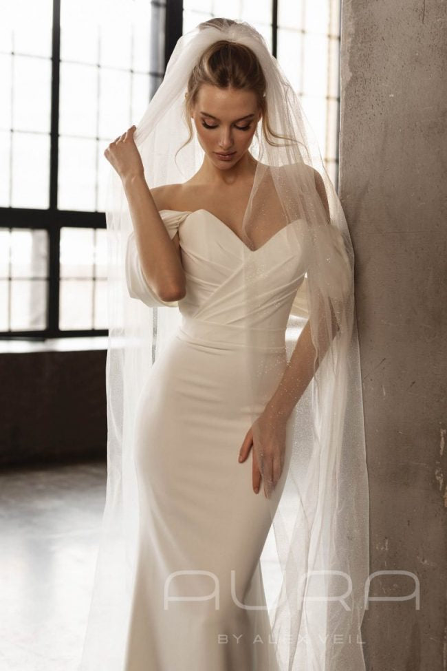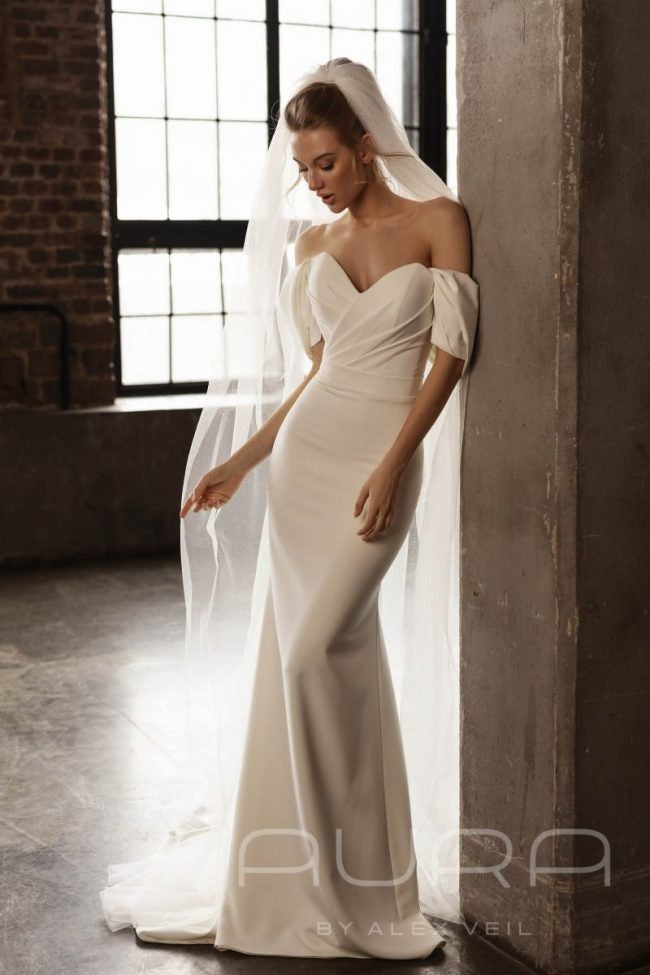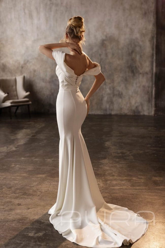 The beautiful Margarita by Alex Veil is a beautiful crepe fitted wedding dress, with a beautiful pleated bodice and corset back.