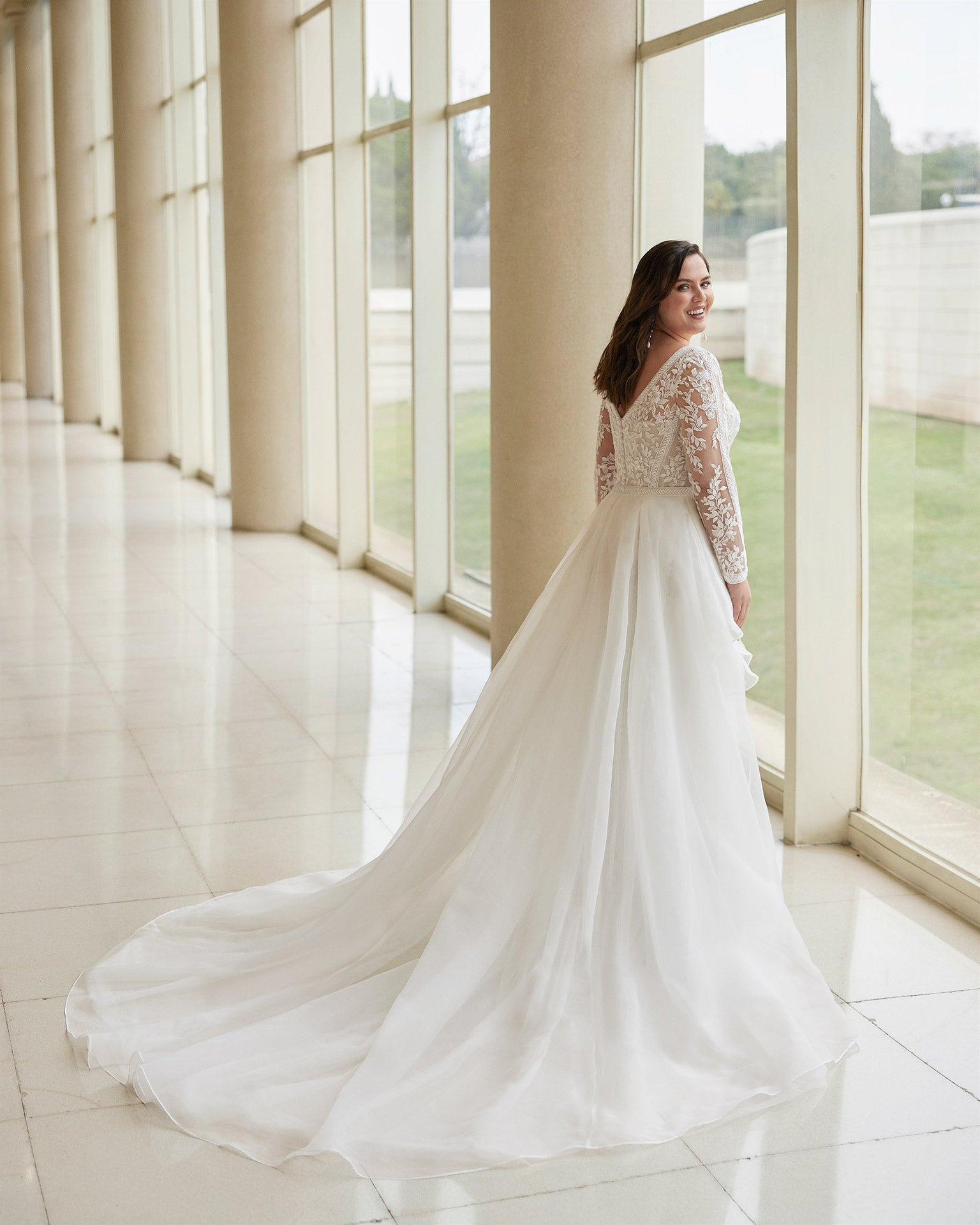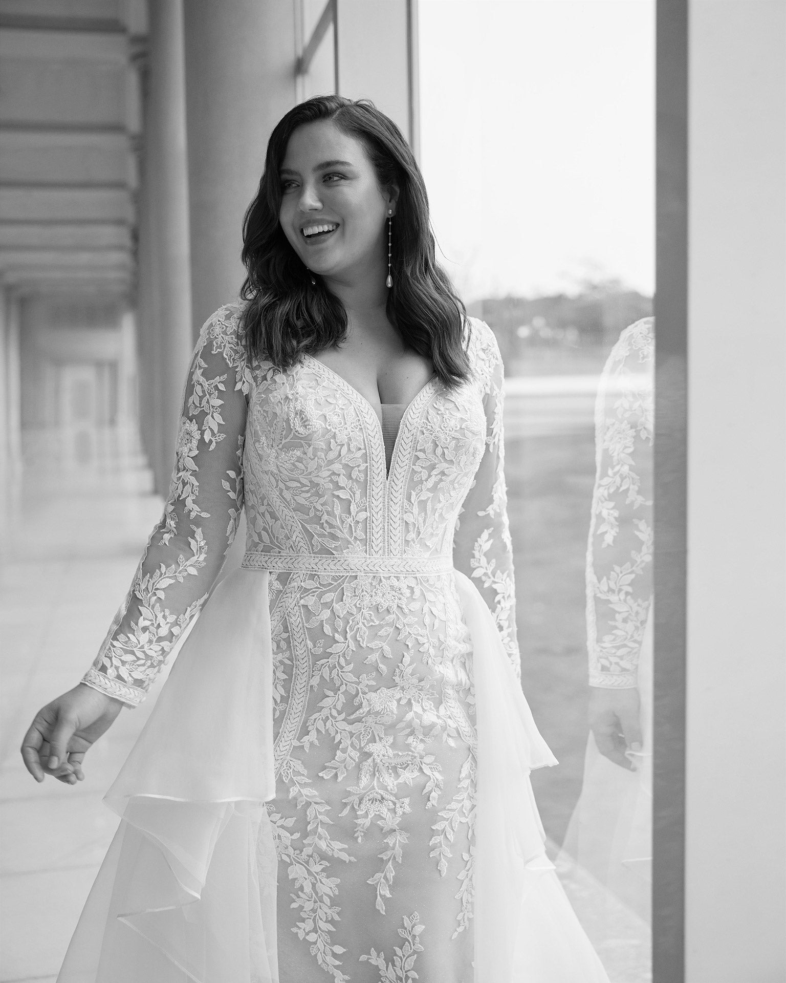 Melya by Martha Blanc is a stylish lace fit and flare mermaid style curve wedding dress, with a beautiful front and back v-neckline, long fitted lace sleeves all finished with a stylish detachable organza overskirt.