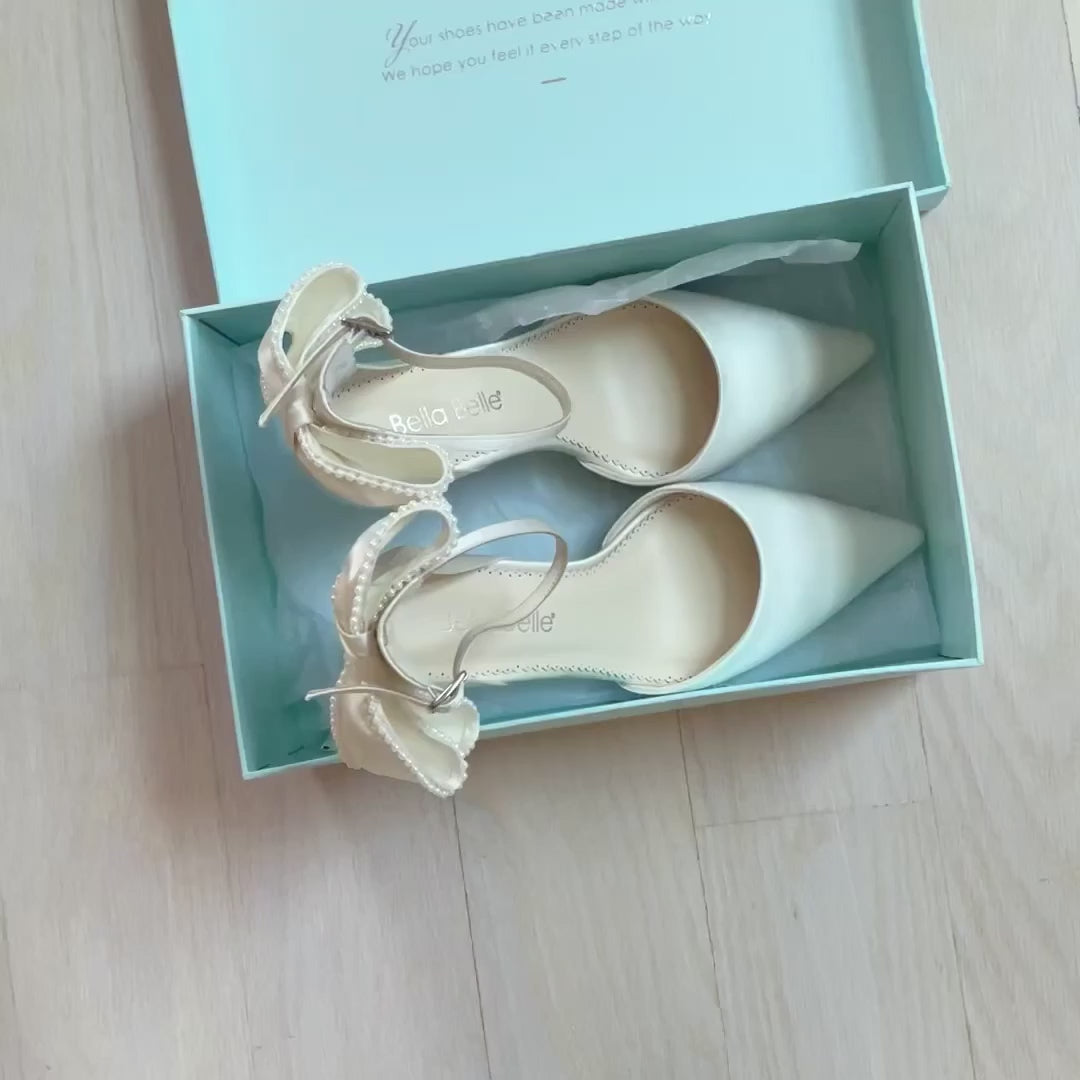 Walk away from the crowd in style in these pearl bow heels! Exquisitely handcrafted bows adorn the back of Mirabelle’s clean silhouette. Look closer, and you'll see elegant hand-sewn pearls that outline the edges of these ivory bow wedding shoes. These wedding pearl heels are unassuming at the front but a standout at the back!