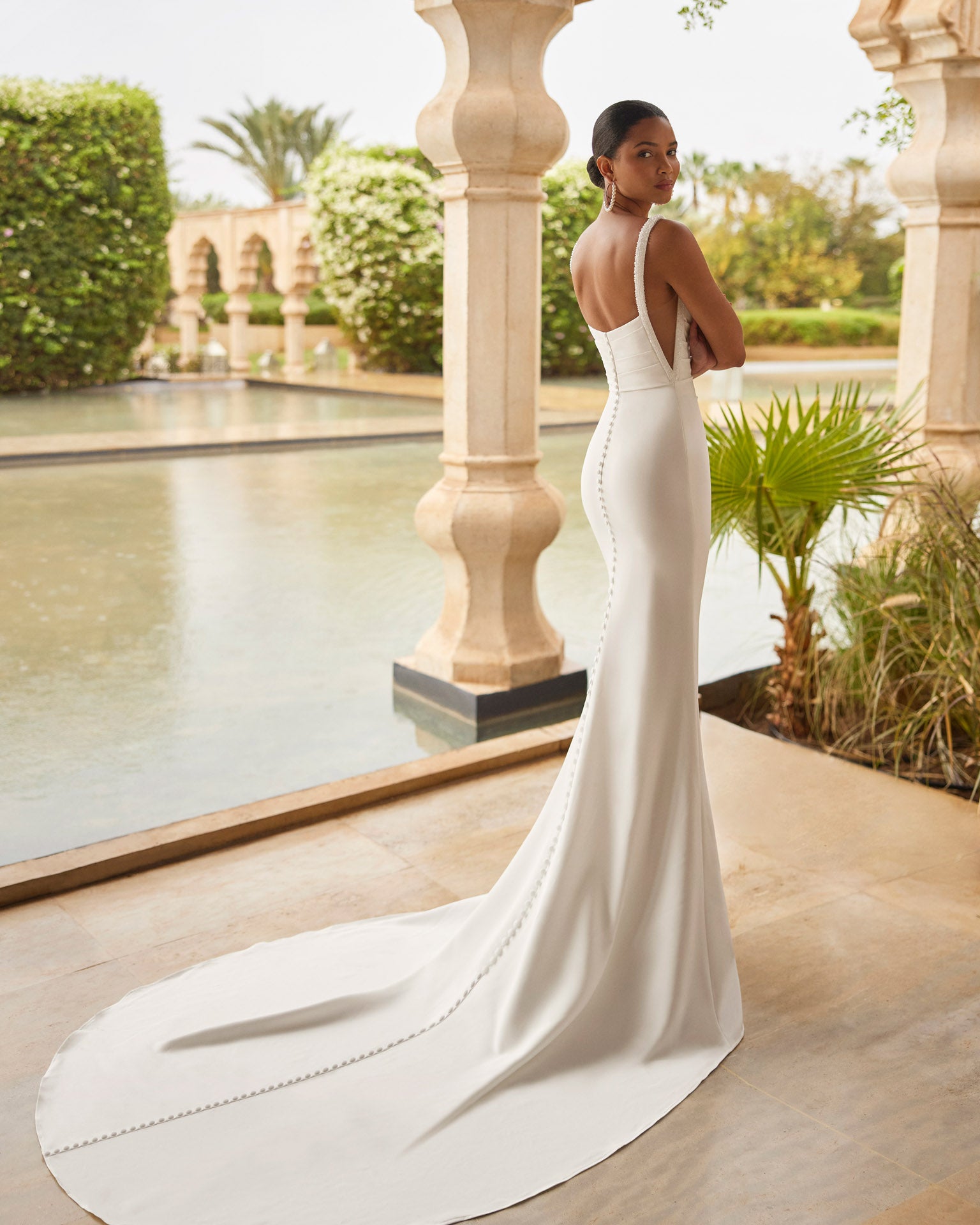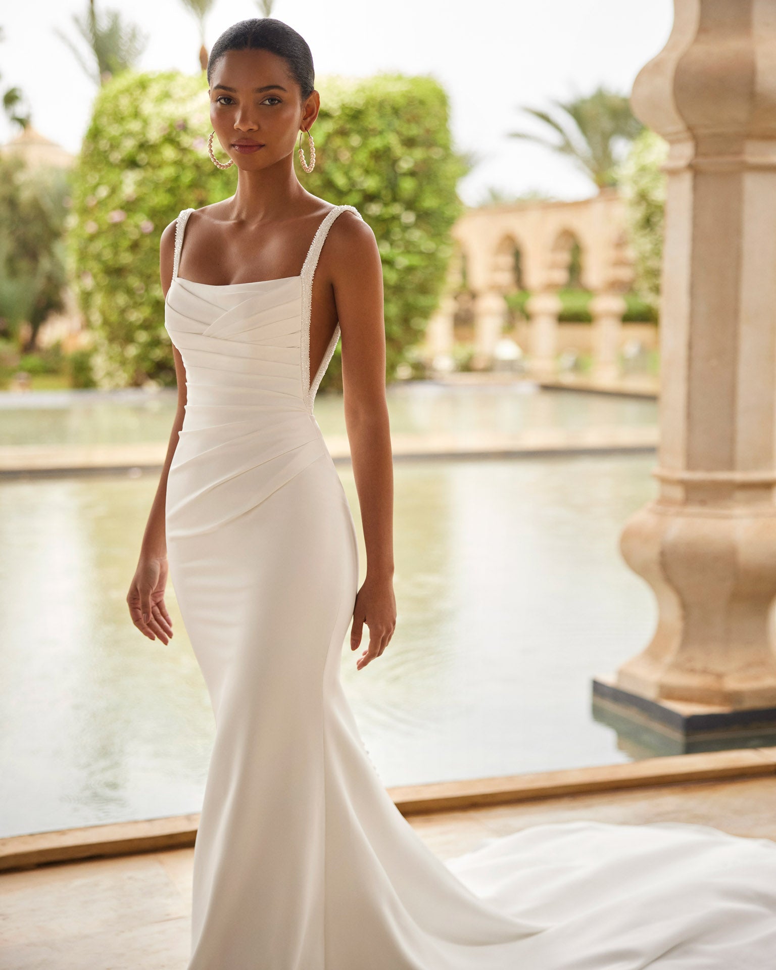 Rosa Clará Oden – Crepe Mermaid Wedding Dress with Square Neckline, Beaded Straps and Open Back