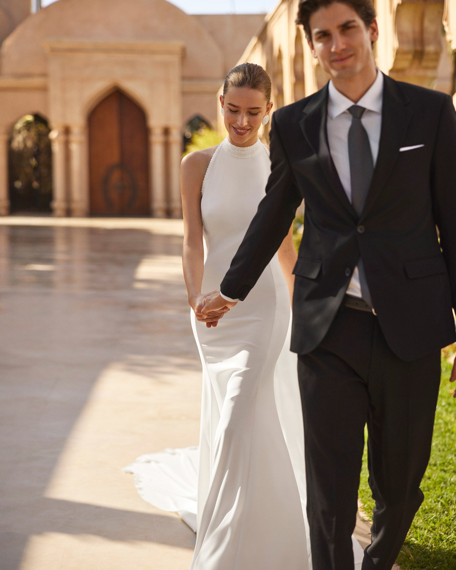 Effortlessly sleek and modern, the Odin gown by Rosa Clará is a striking two-piece column wedding dress designed for brides who appreciate clean lines and contemporary elegance. Crafted in bi-stretch crepe, this silhouette-skimming gown offers a flawless fit with a smooth, minimalist finish.