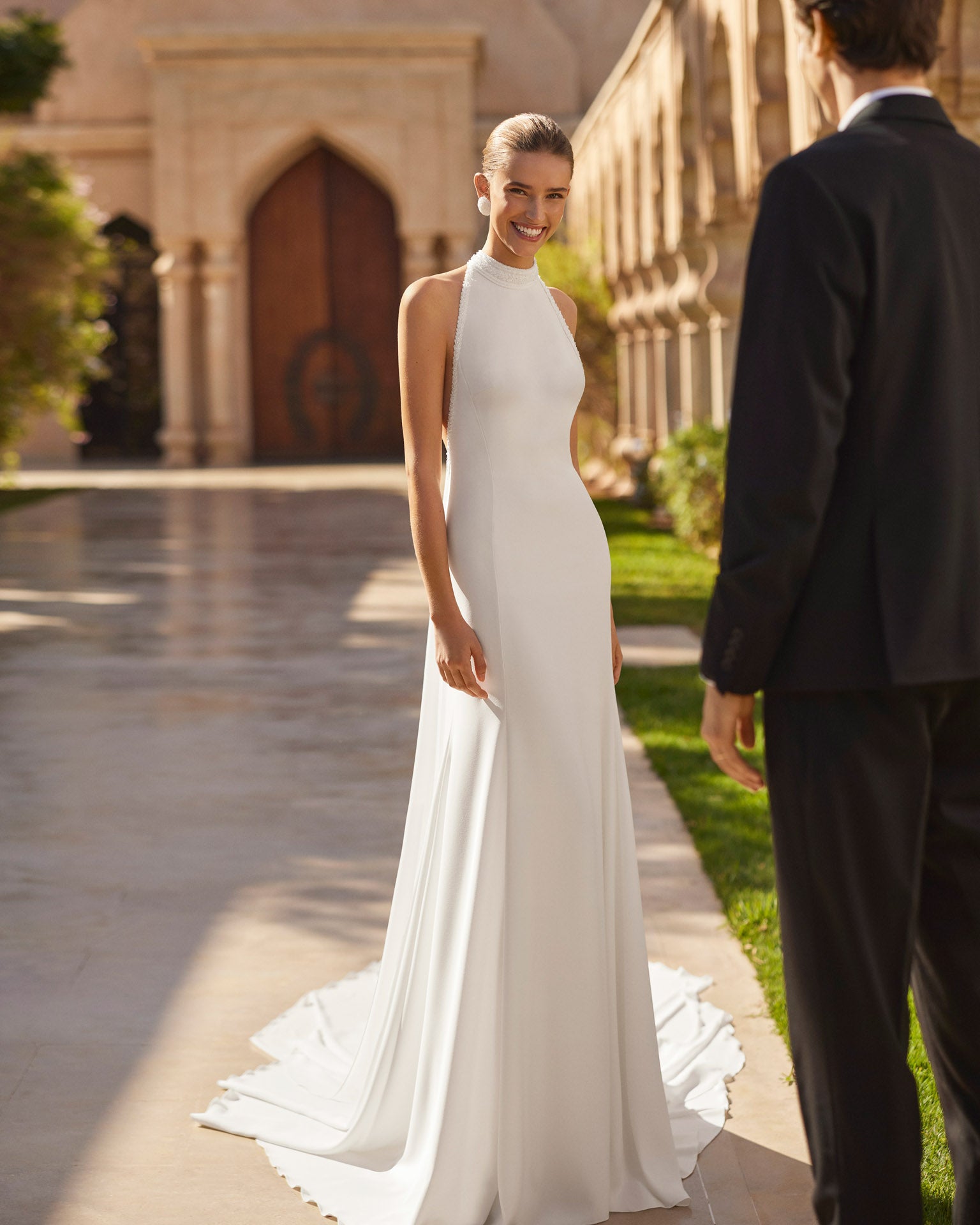Rosa Clará Odin – Bi-Stretch Crepe Column Wedding Dress with Halter Neckline, Open Back and Detachable Drape