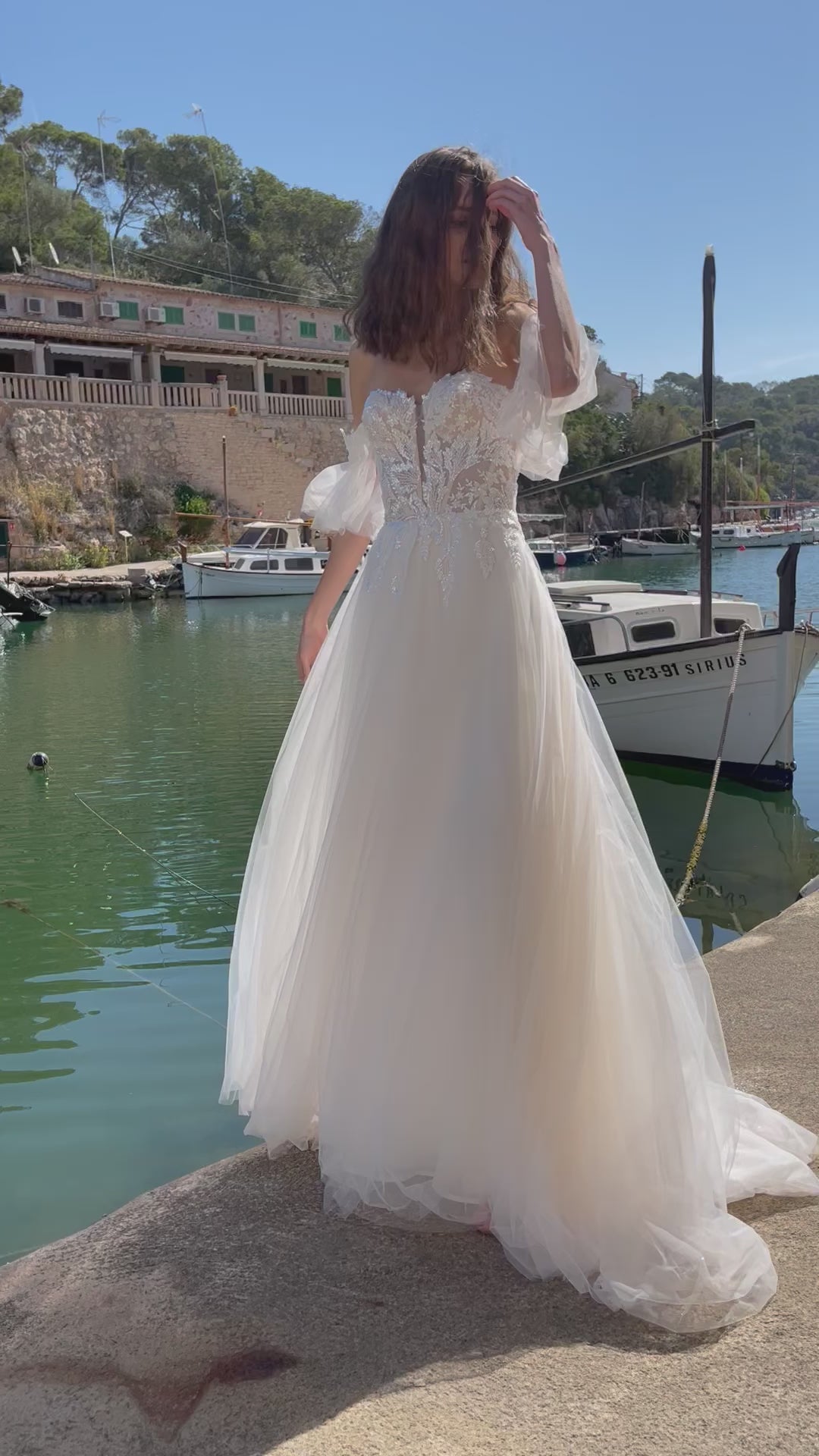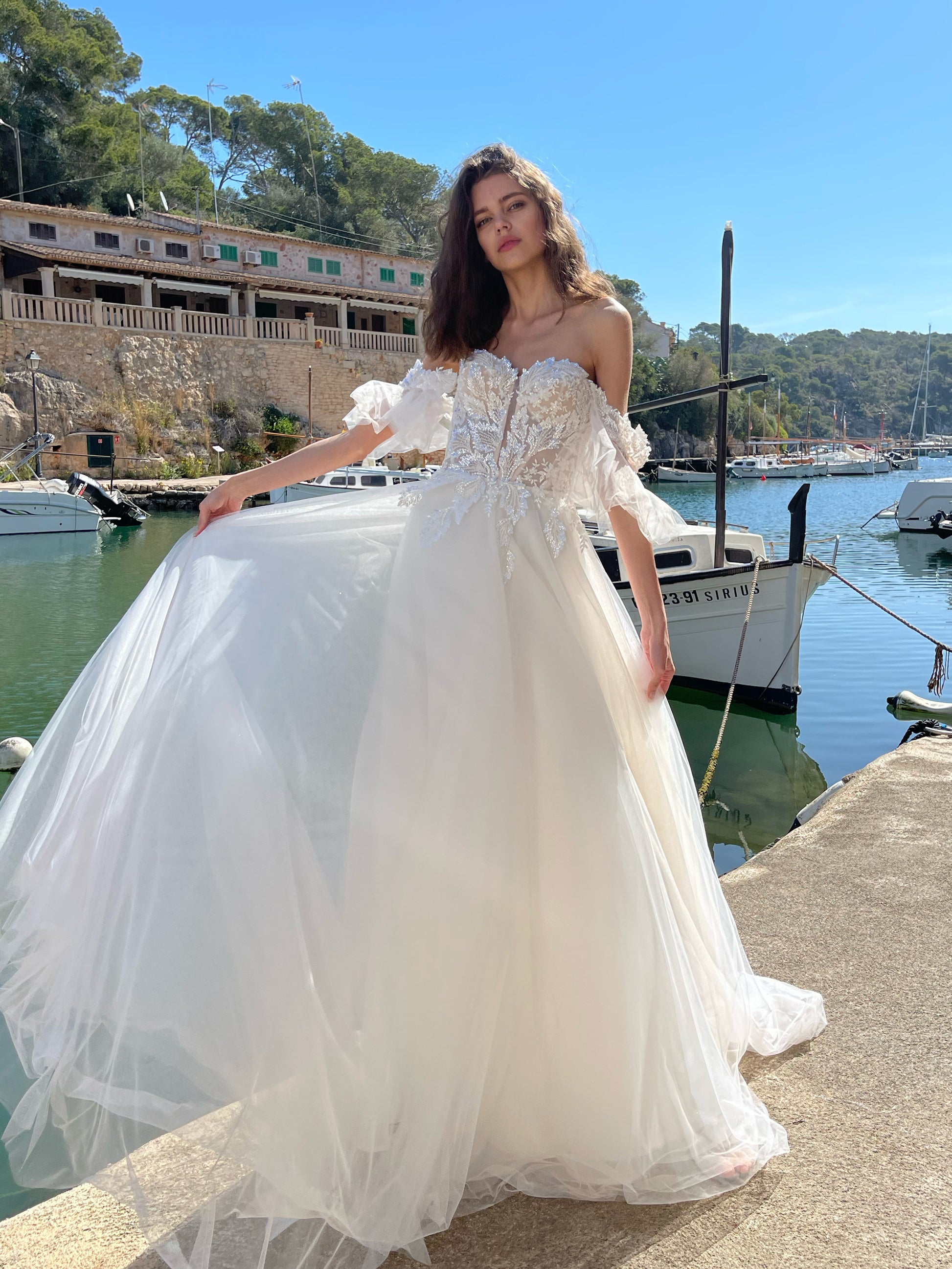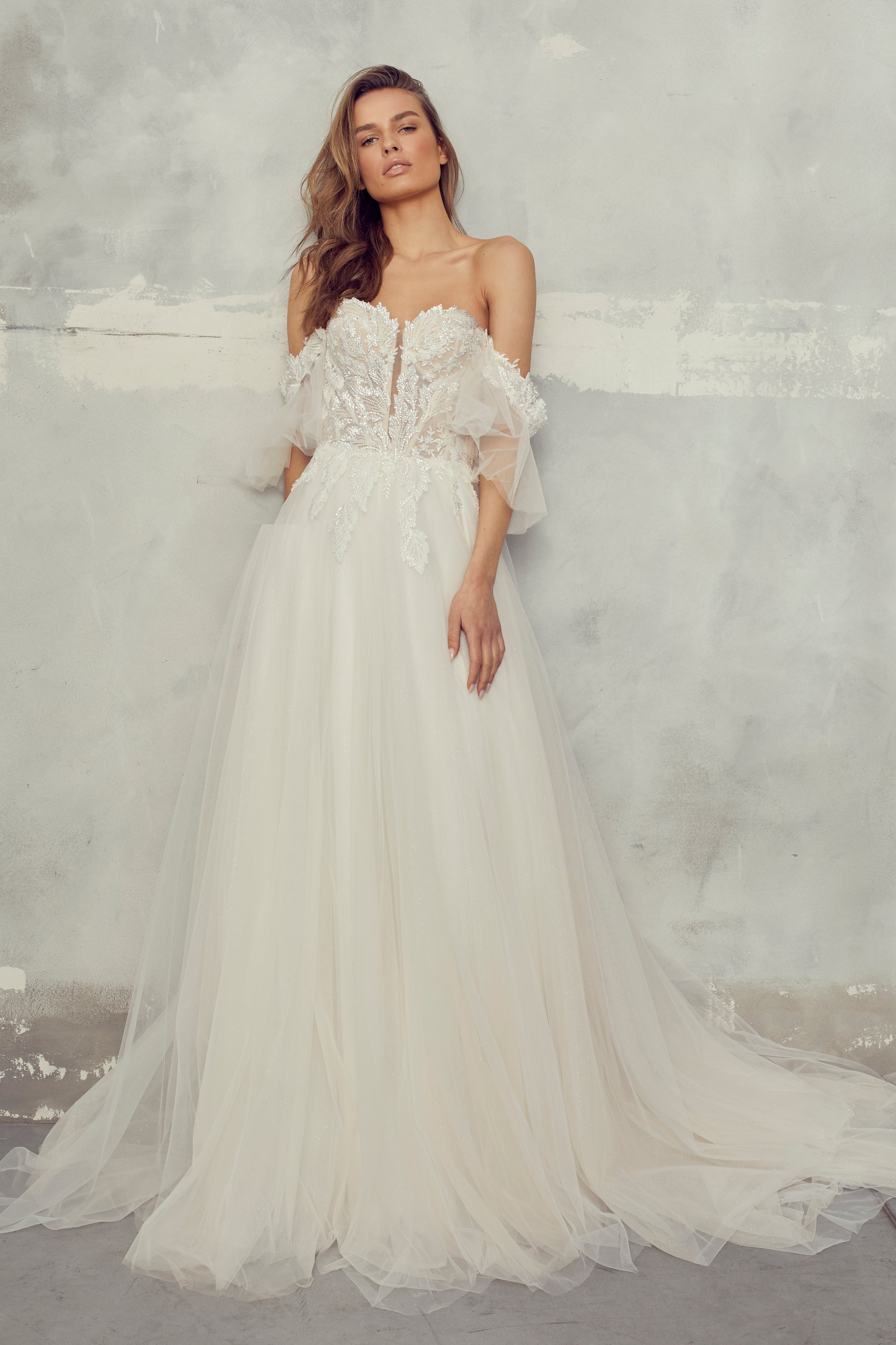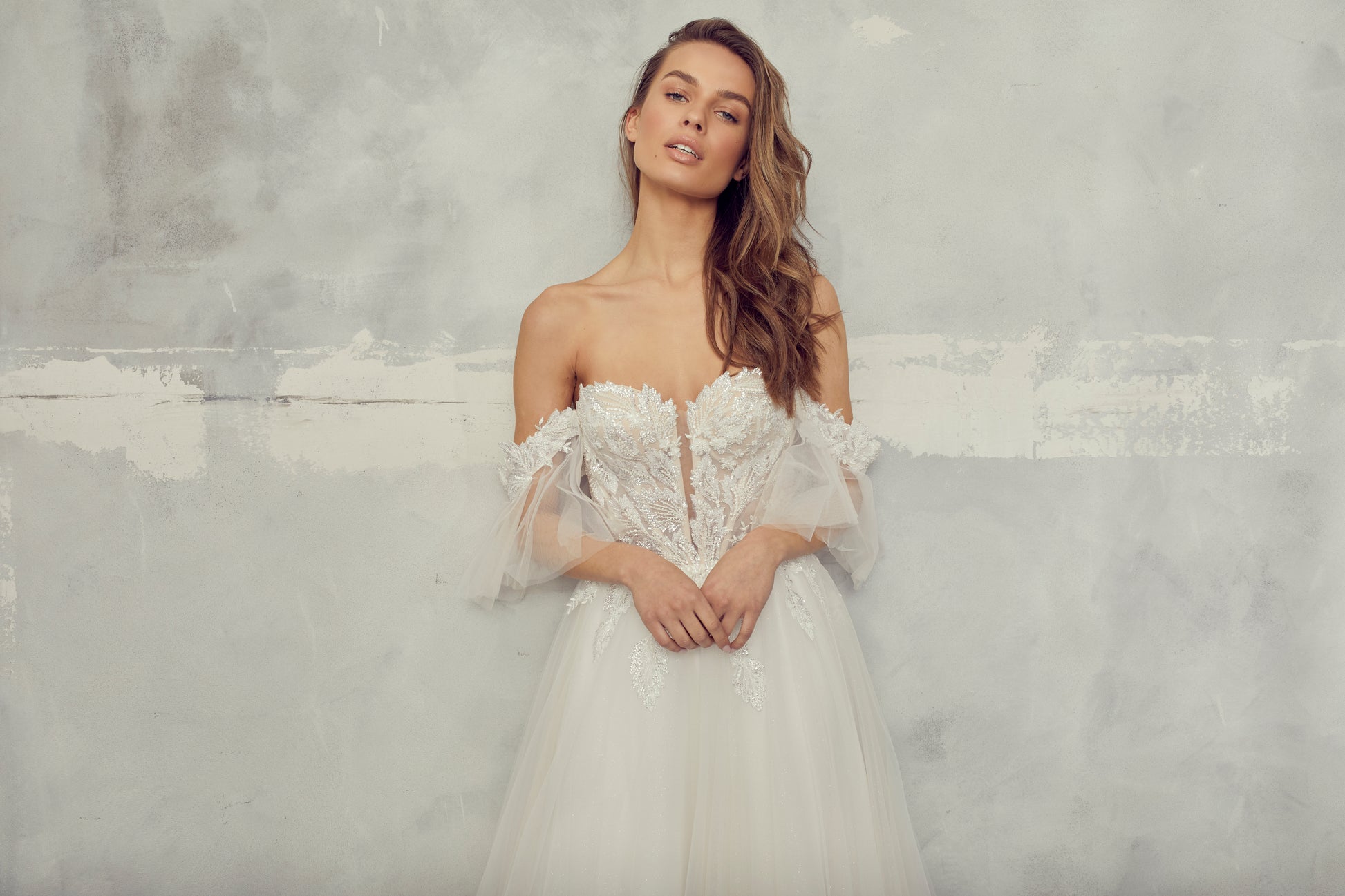 Olearia is a long romantic a-line wedding dress. The top of the dress is a corset-style and embelished with sequined lace appliques. The skirt is made of tulle with a layer of silver glitter sparkle under the top layer. The dress has a blush undertone and high shine sequins.