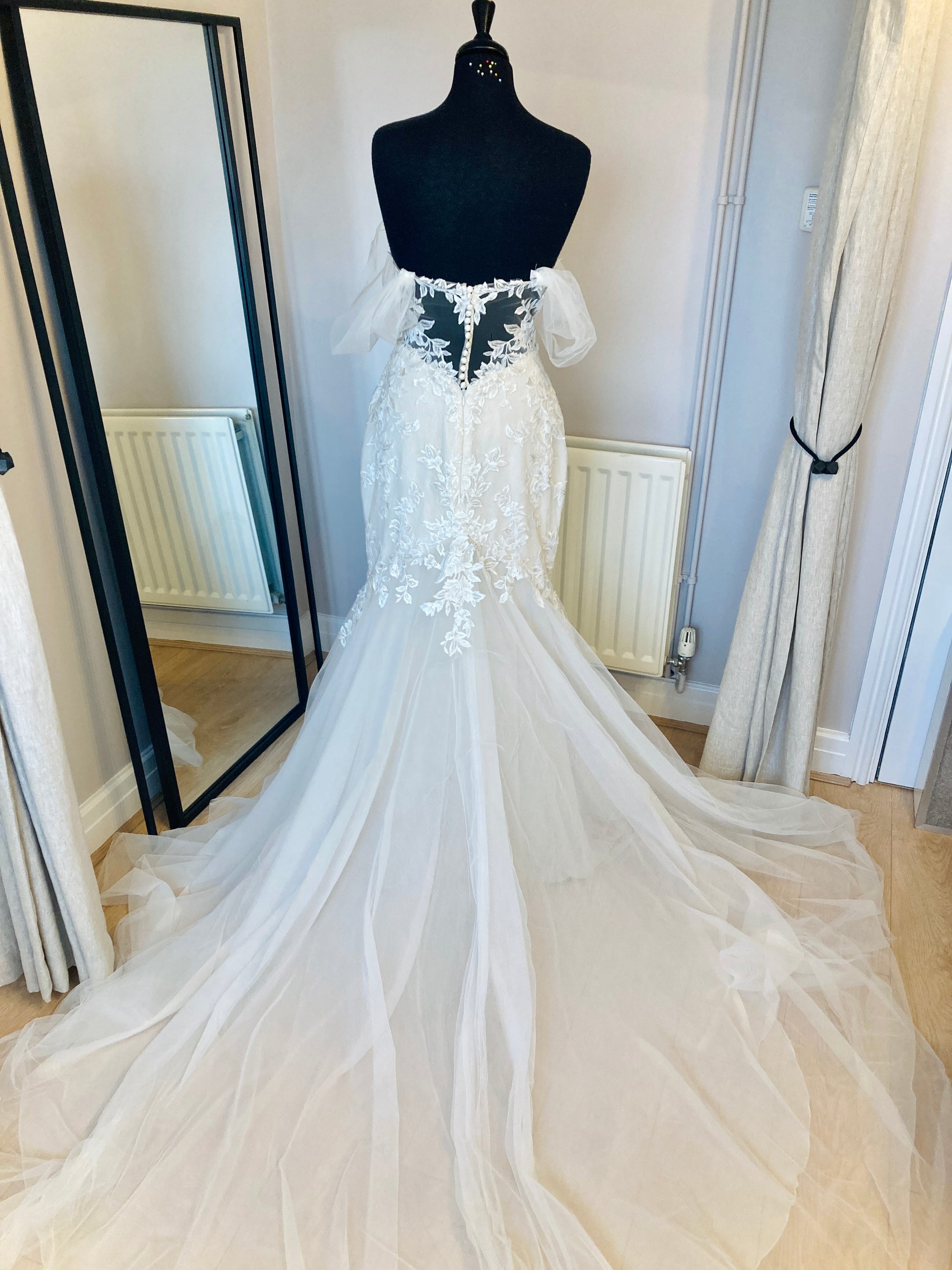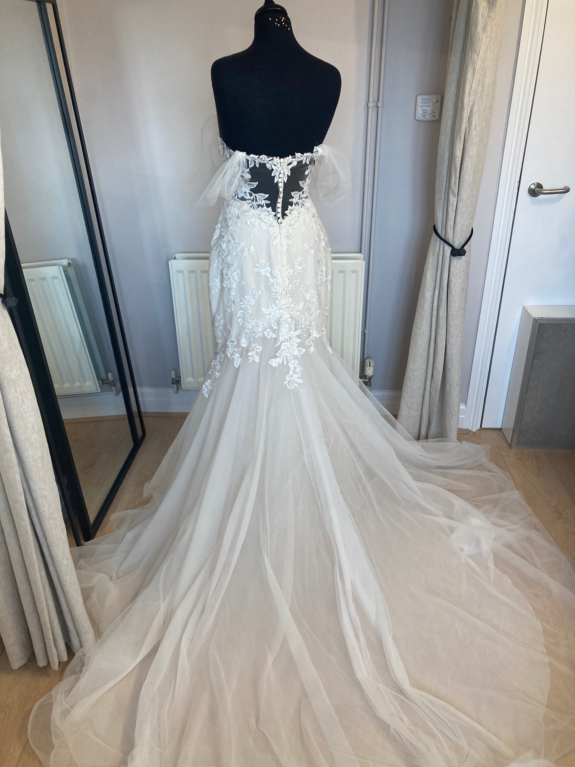 All sample dresses can be reduced in size up to 2 dress sizes. Please check your body measurements against those listed below. All sample dresses are sold as seen with defects, repairs and alterations are not included in the price of the dress.
