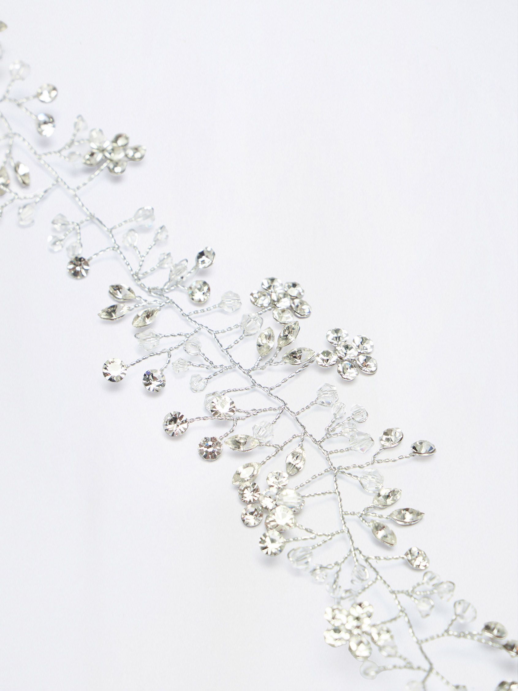 A shining silver bridal hair vine made from diamante's and clear beads. The hair accessory can be worn in the front or back of the hair.