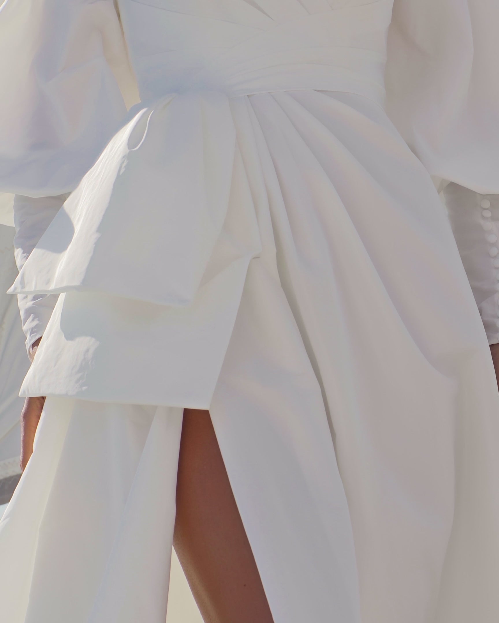 A modern, catwalk-inspired gown that interconnects various volumes. Tailored in crisp taffeta and featuring and a strapless sweetheart bodice with figure-defining drapes, detachable macro sleeves and a daring split for a hi-lo effect. An oversized bow at the waistline completes this high-fashion bridal look. Our sample is made from a taffeta fabric which is very lightweight, perfect for destination weddings.