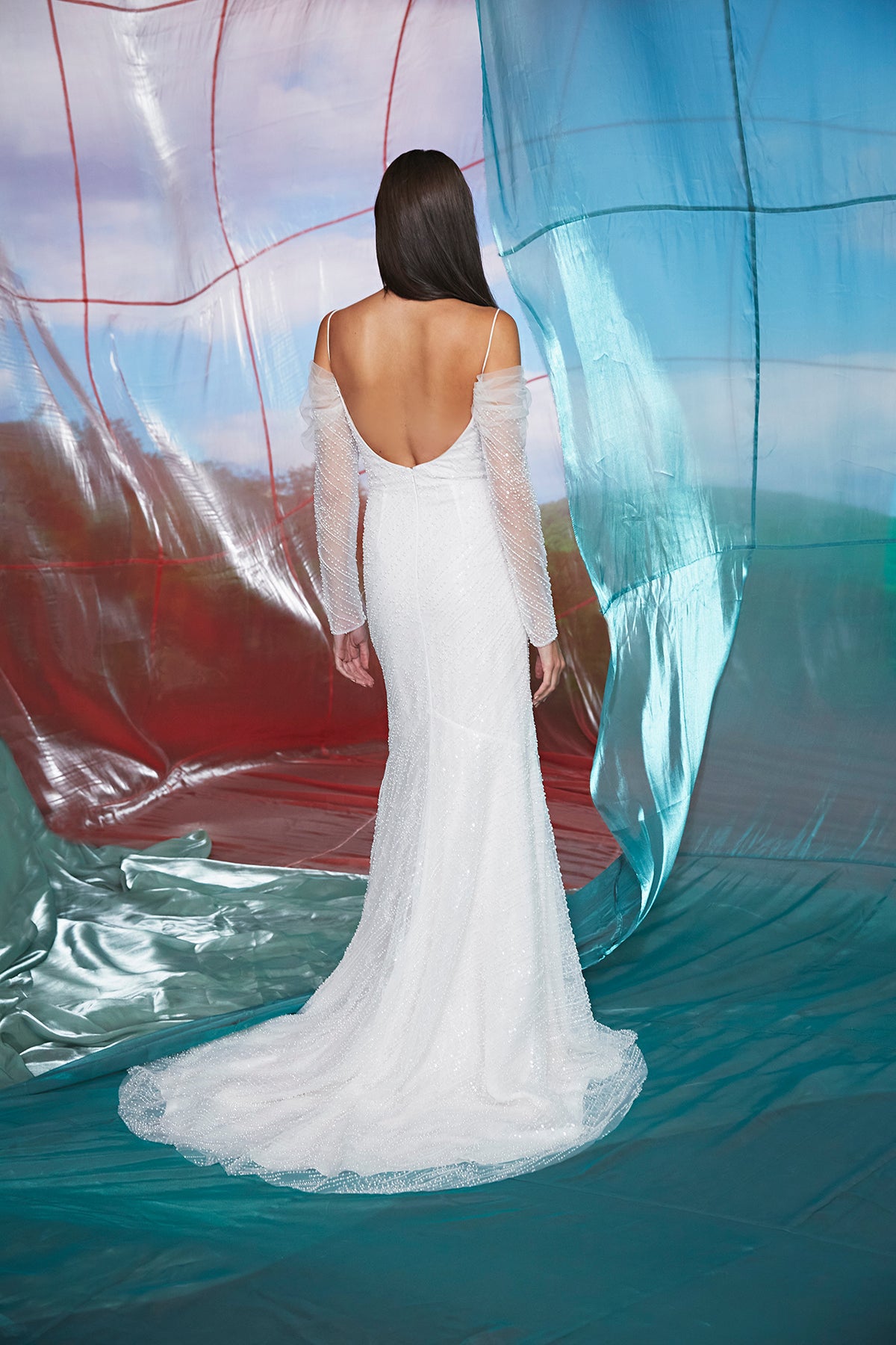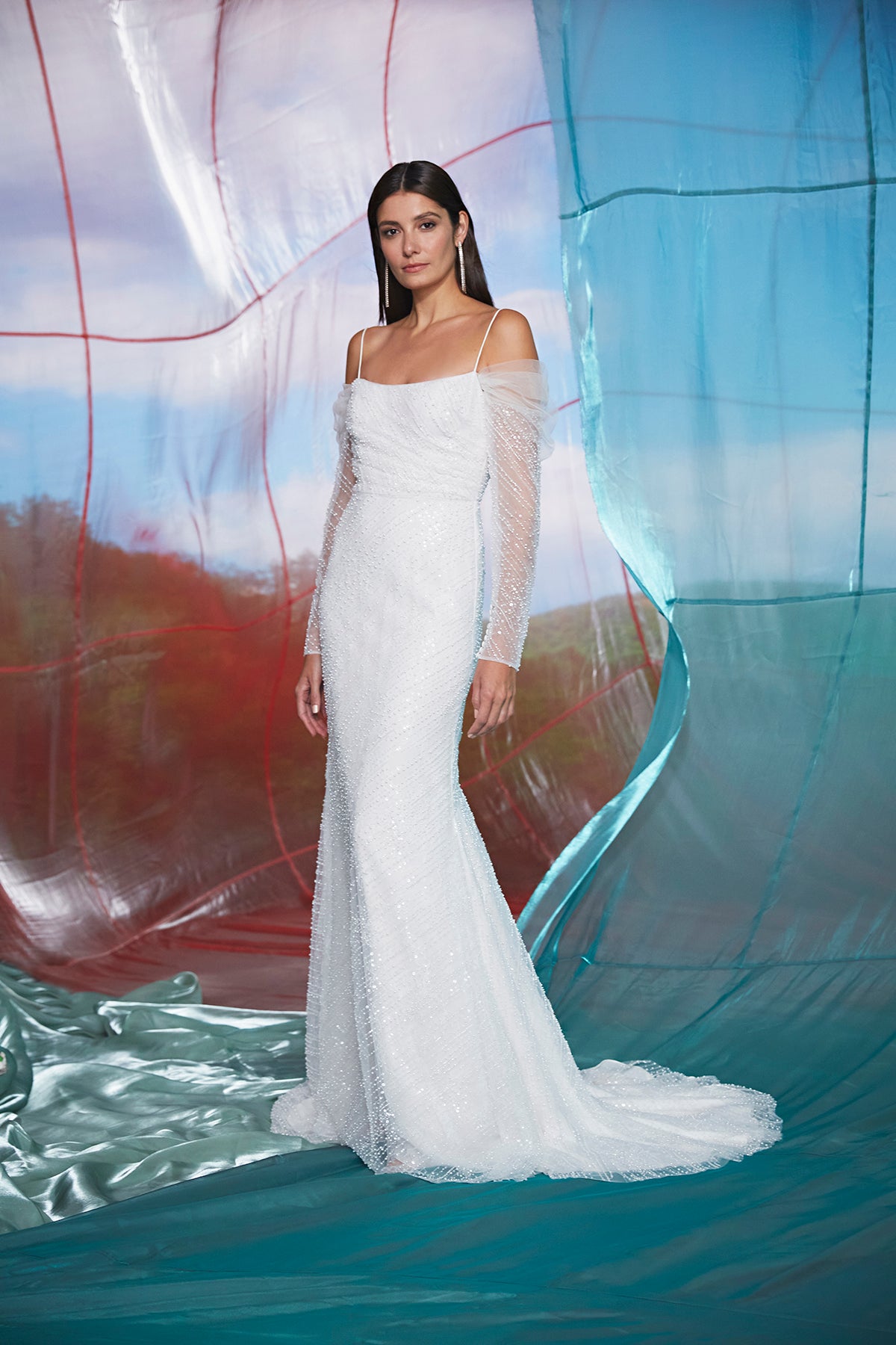 The Raven wedding dress by Theia is beaded pearl and sequin cold shoulder sleeve embroidered gown with spaghetti straps. The sleeves are detachable for a change from day to night.