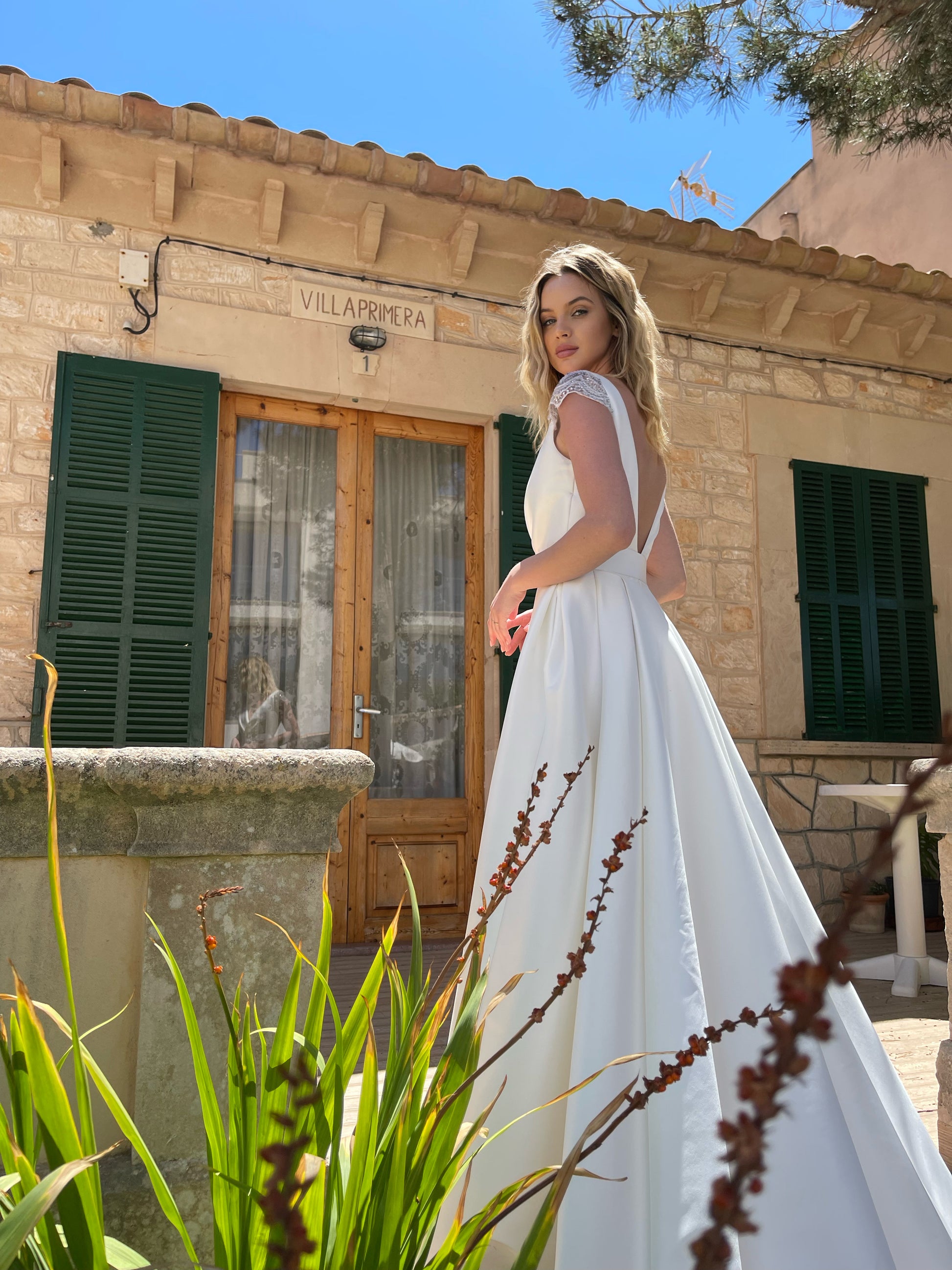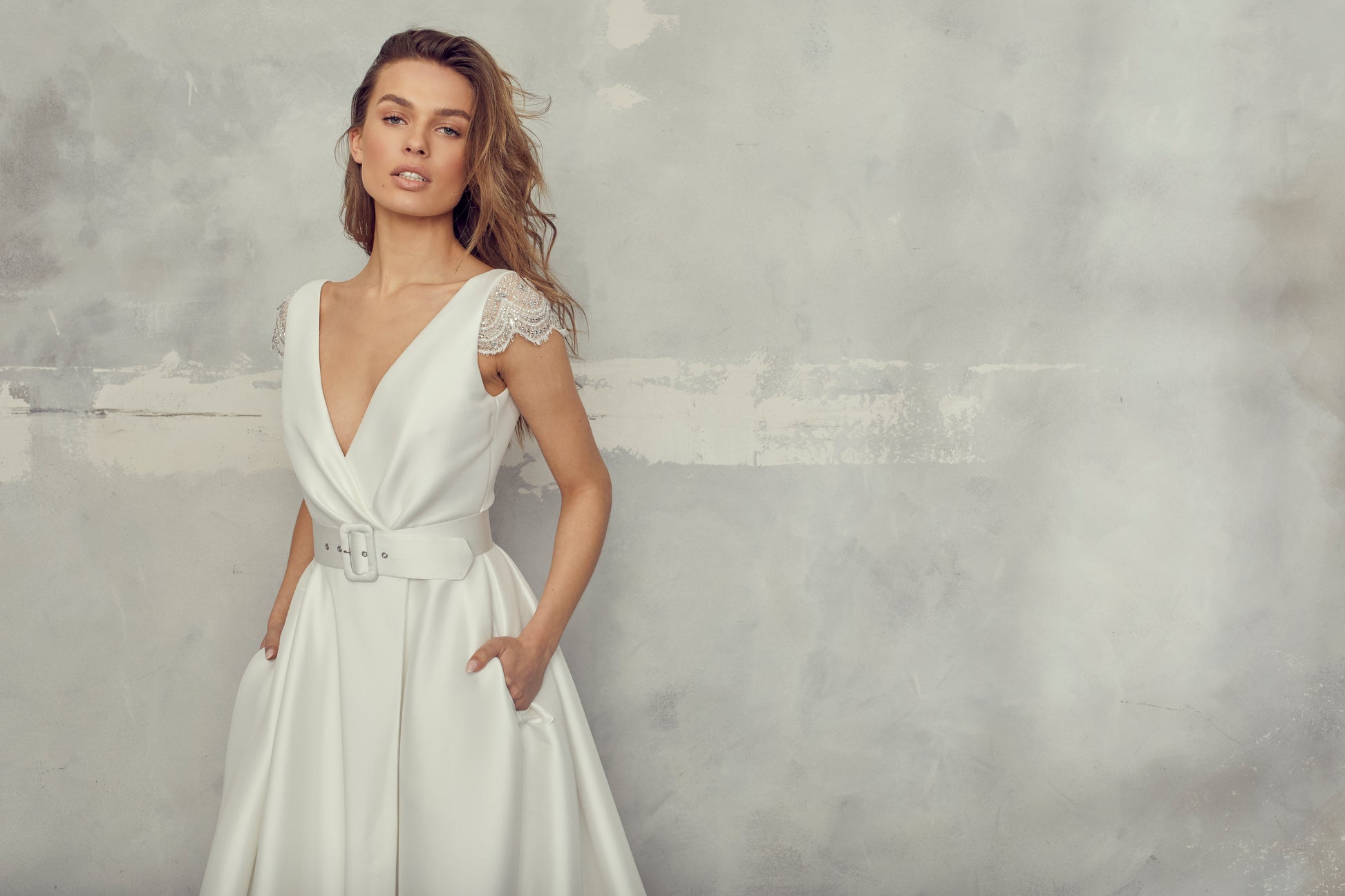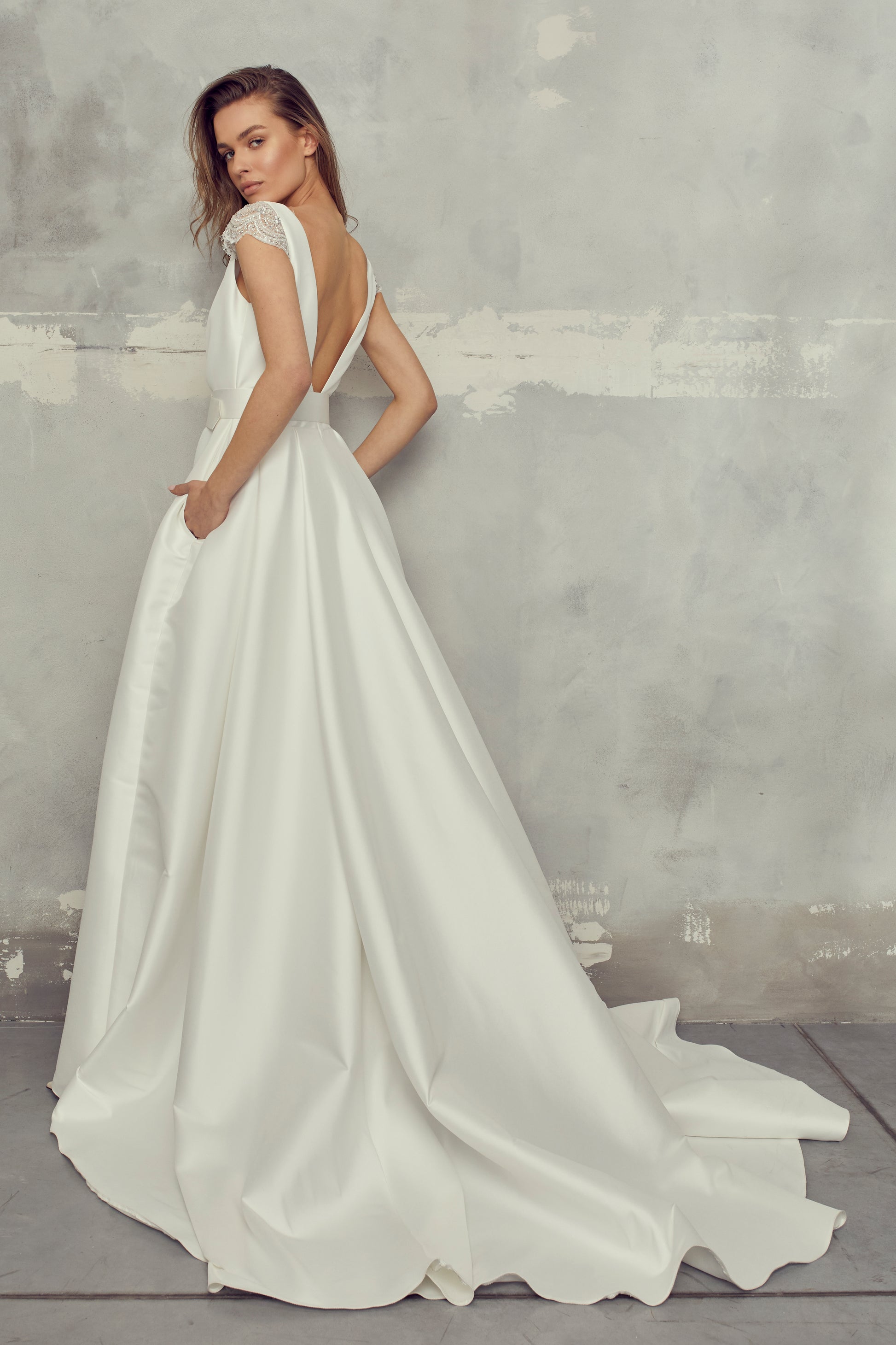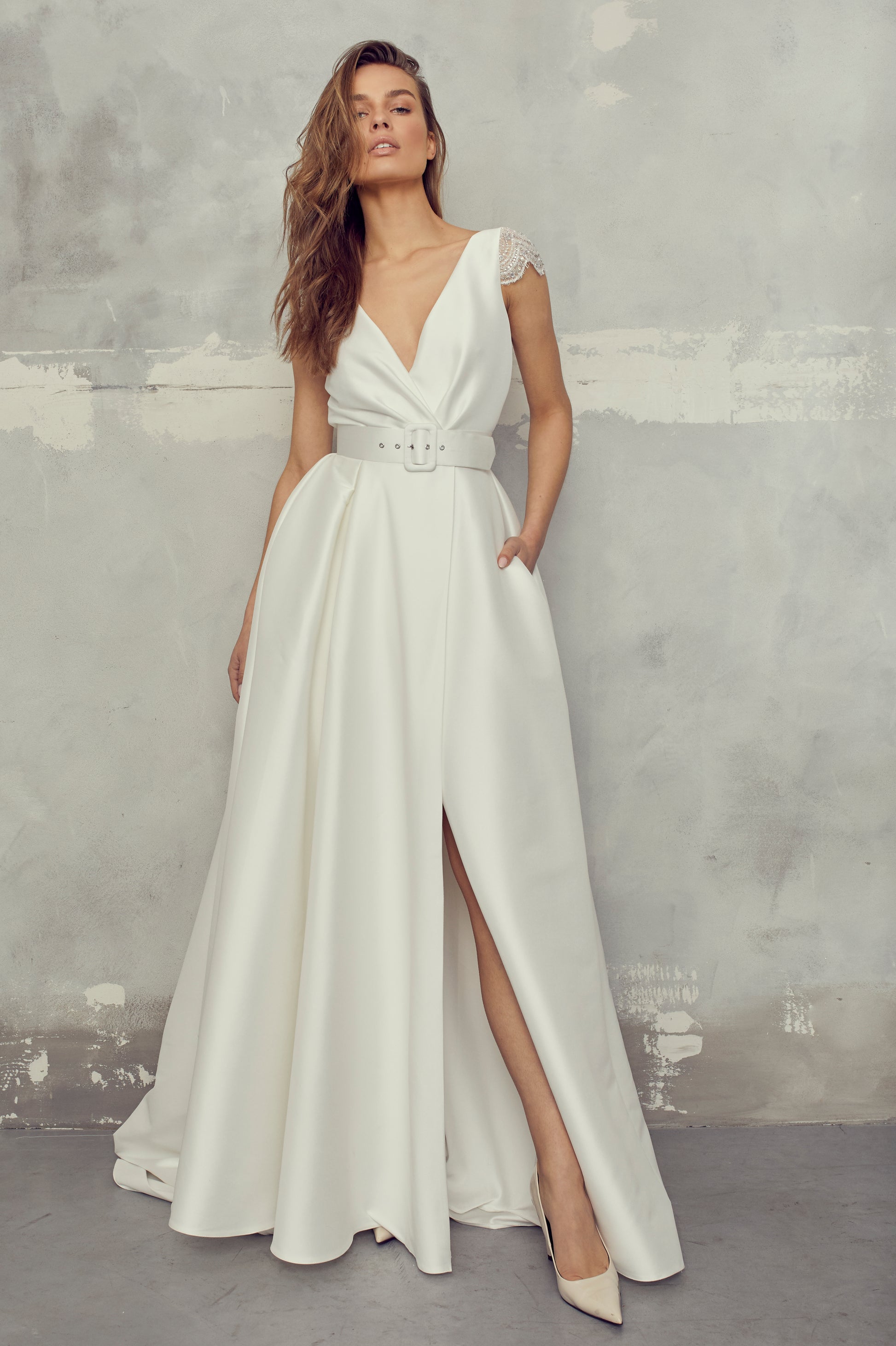 Long elegant dress, made of mikado fabric. Top and skirt made of identical fabric, creating a pleated effect that connects at the waist. Top has short lace sleeves and a V-neckline. Skirt has a slit and a delicate train.