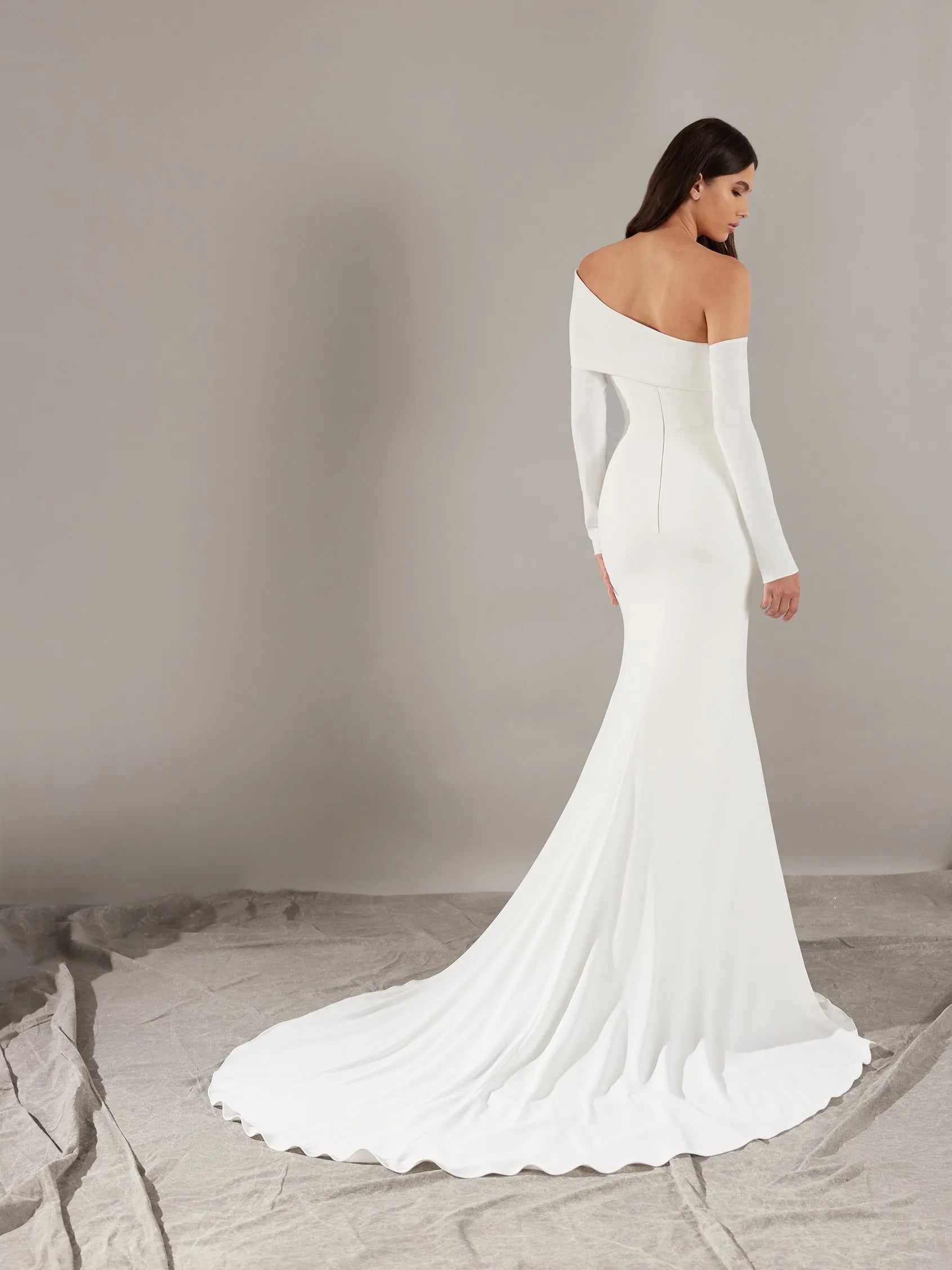 Pronovias Rusty from the 2025 collection. Rusty is the epitome of modern elegance with echoes of classical structure. The sculptural shape of the strapless neckline is beautiful and flows into the mermaid silhouette. Complete the look with detachable long sleeves that snugly fit beyond the wrist line.