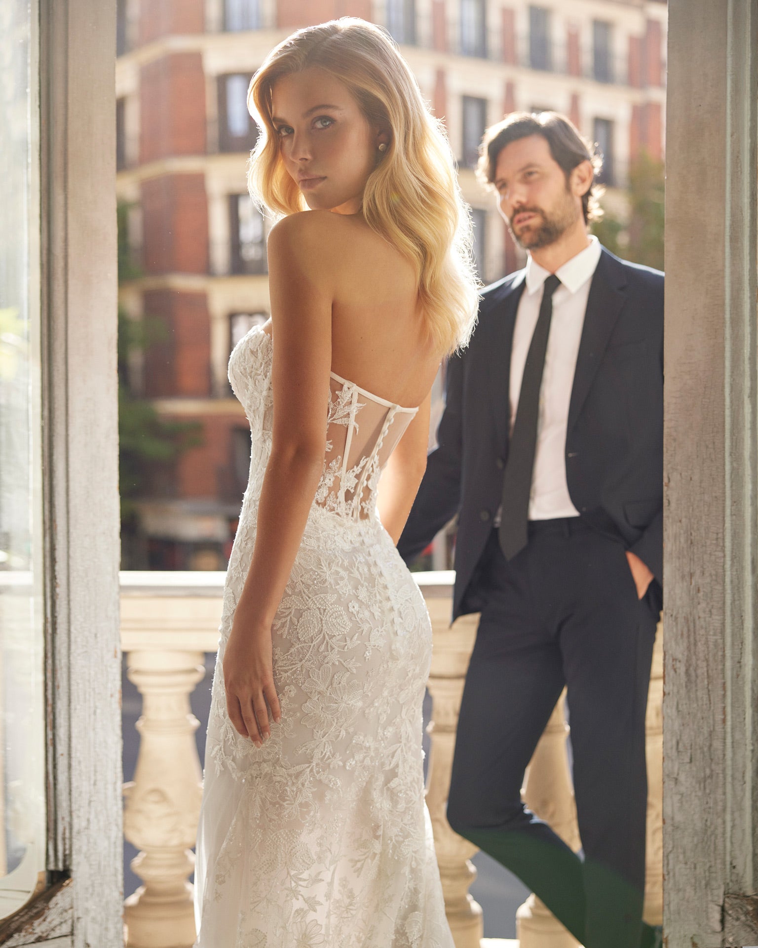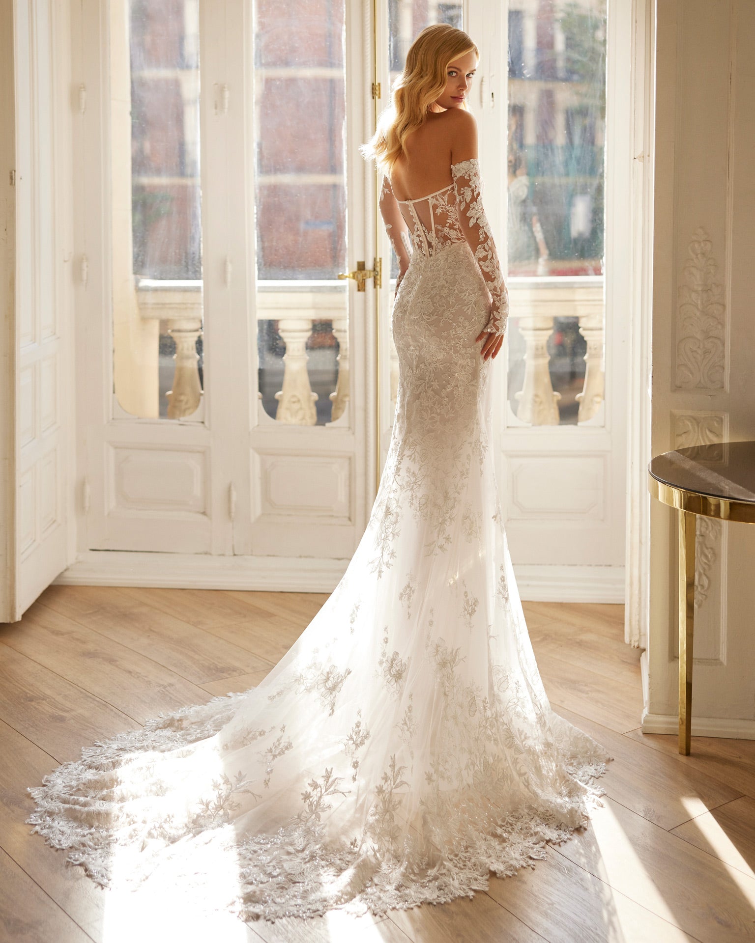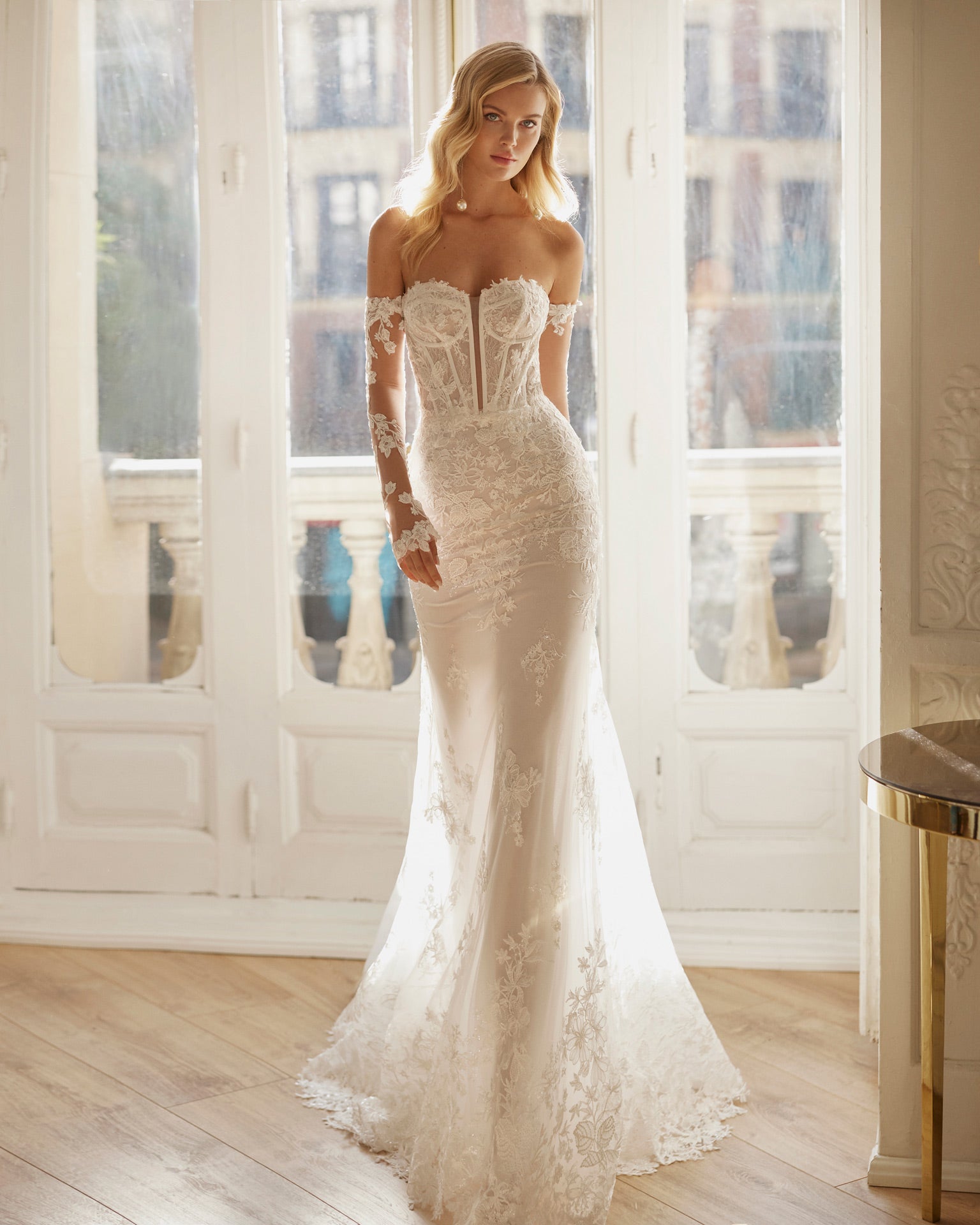 Satini by Spanish designer Luna Novias. Satini is a fitted wedding dress crafted in lace tulle and beadwork for the modern bride. The sweetheart neckline, closed back and detachable matching lace sleeves complete the design.