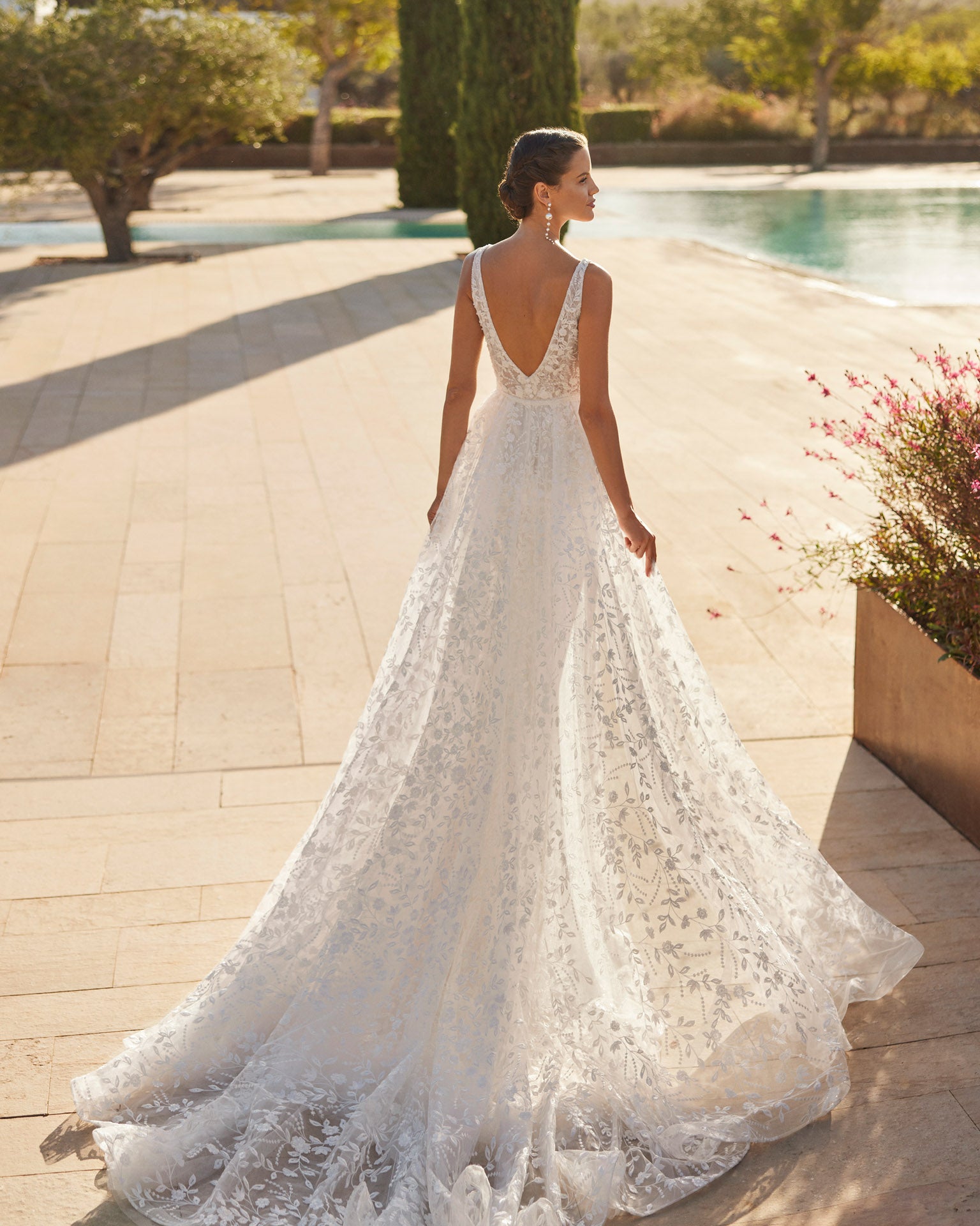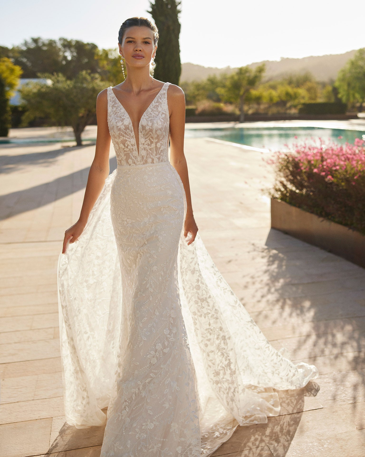The V-neckline and slim shoulder straps create a flattering and feminine shape, complemented by a low V-back for a touch of contemporary elegance. The look is elevated with a flowing lace overskirt, offering the option to add volume and movement for the ceremony, then reveal the sleek mermaid silhouette for the evening celebration.