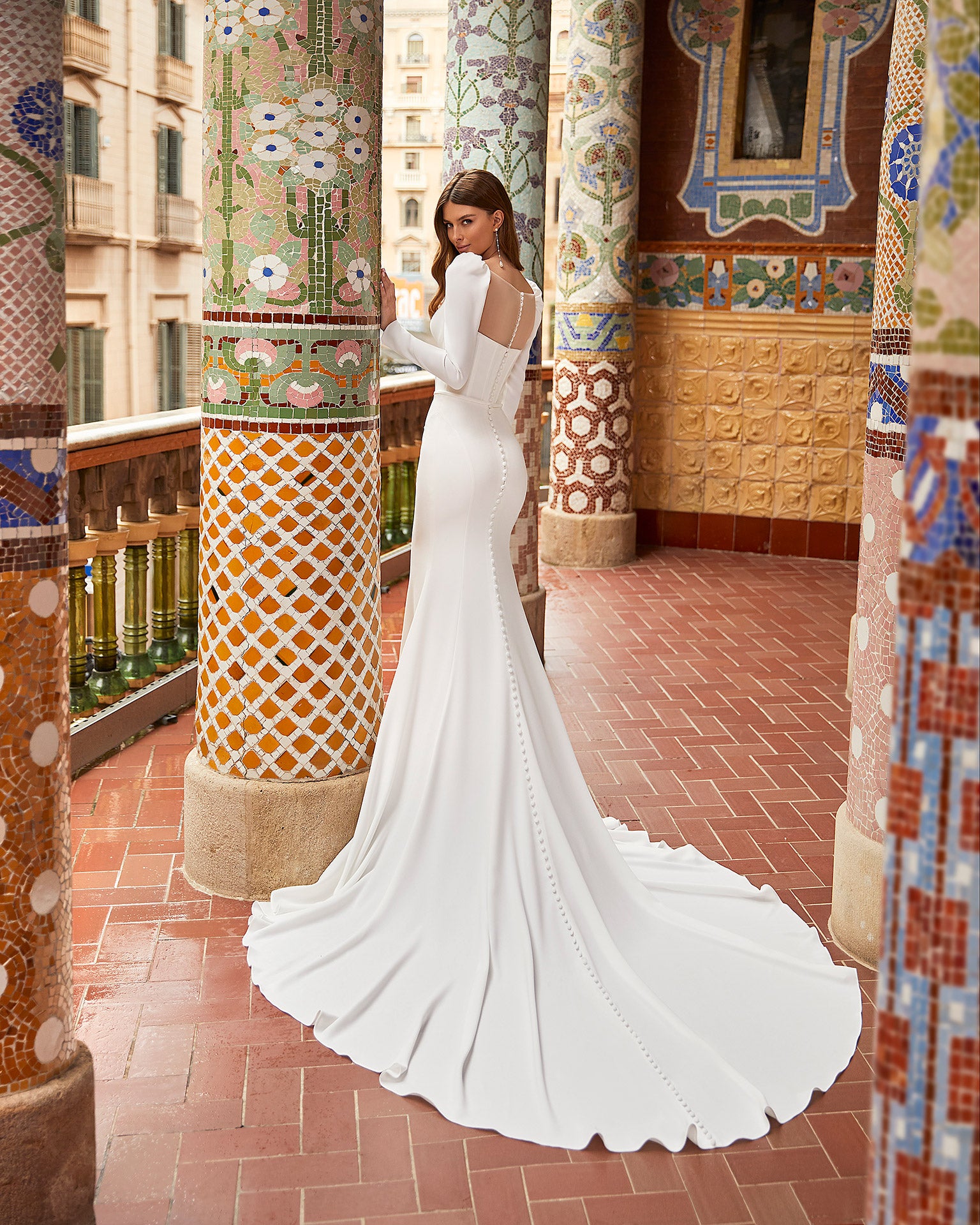 Tarah by Lunanovias. Tarah is a modern sheath-style wedding dress, made of stretch crepe. The dress features beautiful fitted sleeves, a deep-plunge neckline and a button-up sheer back. This is a design for the modern and stylish bride.