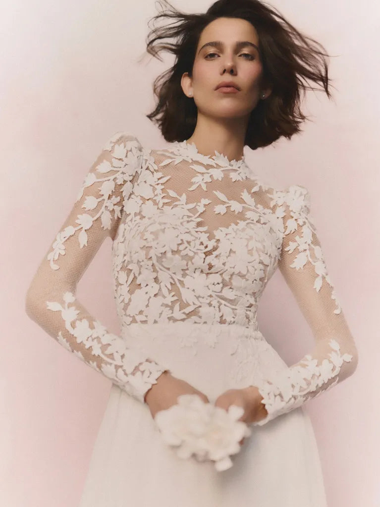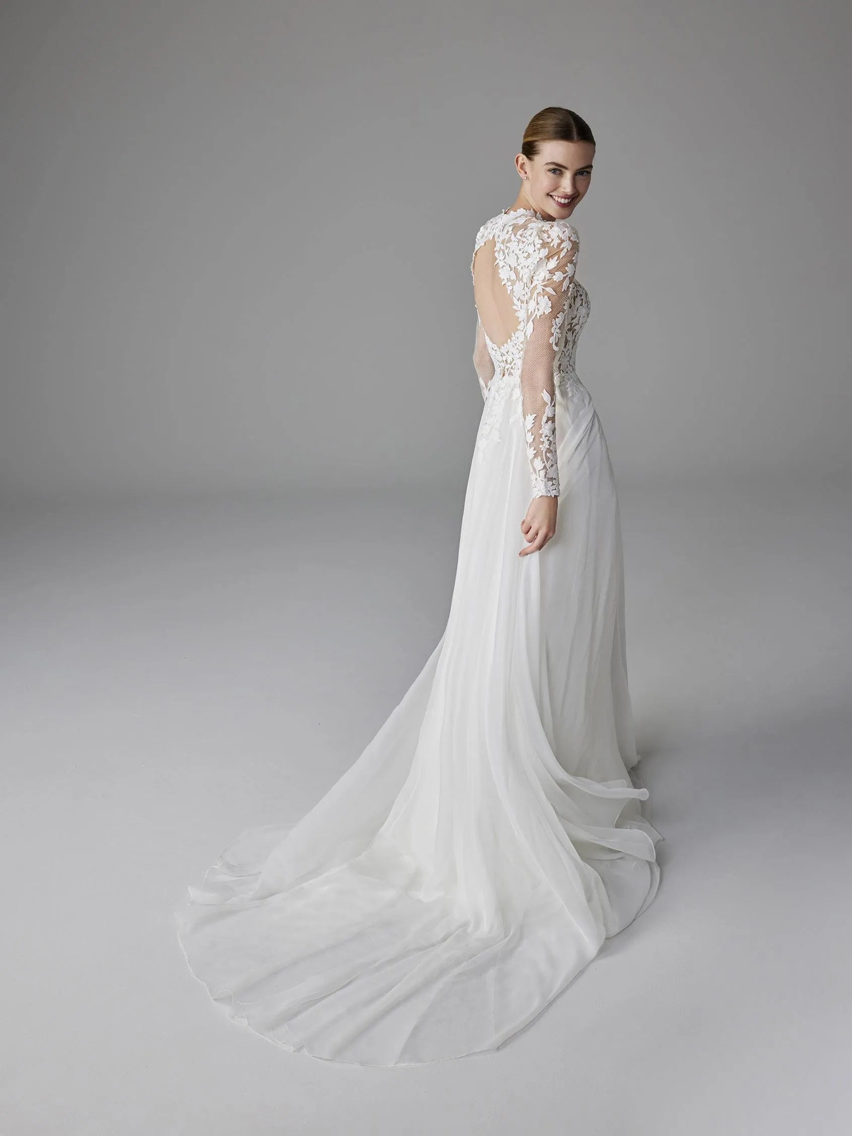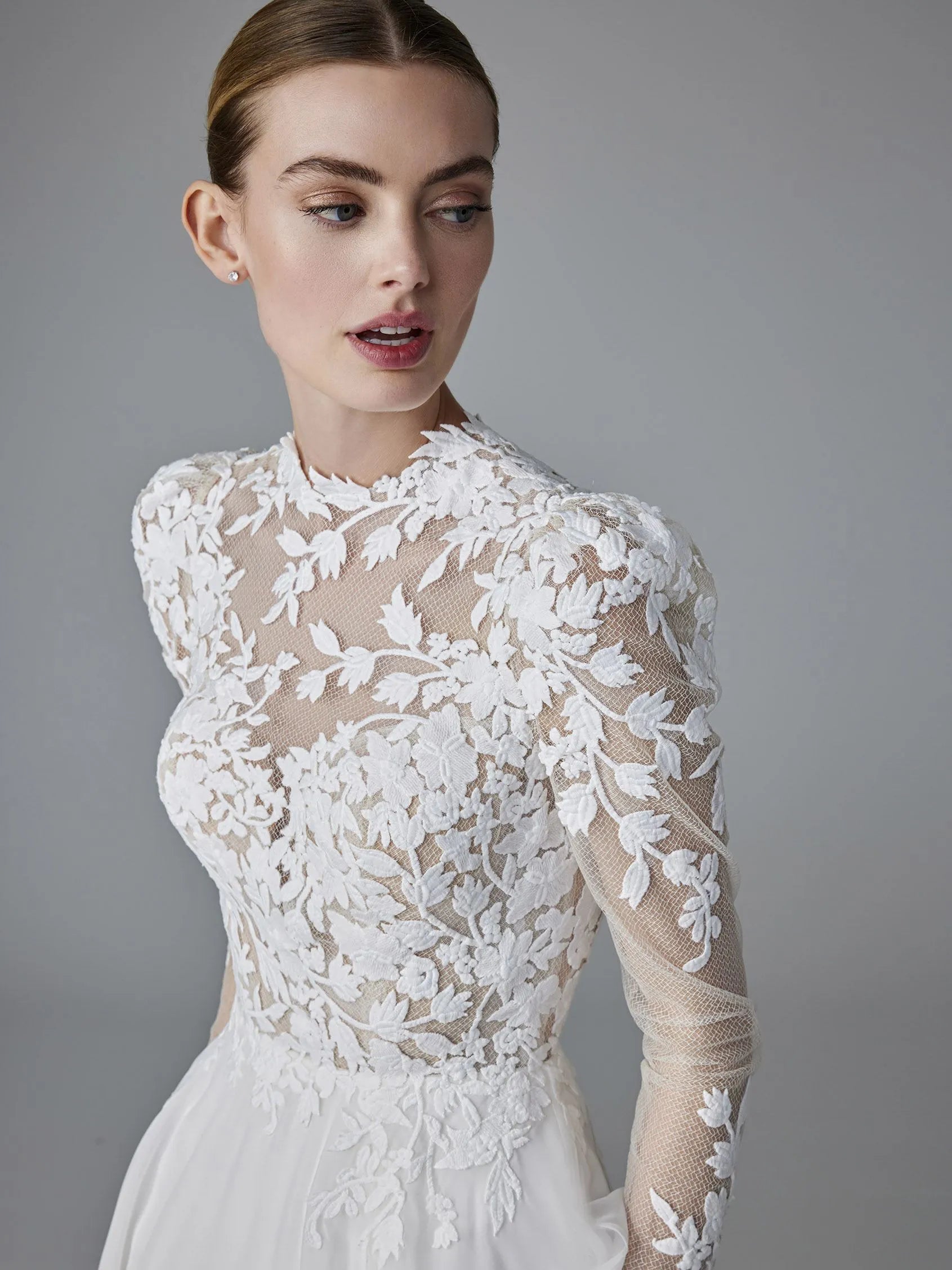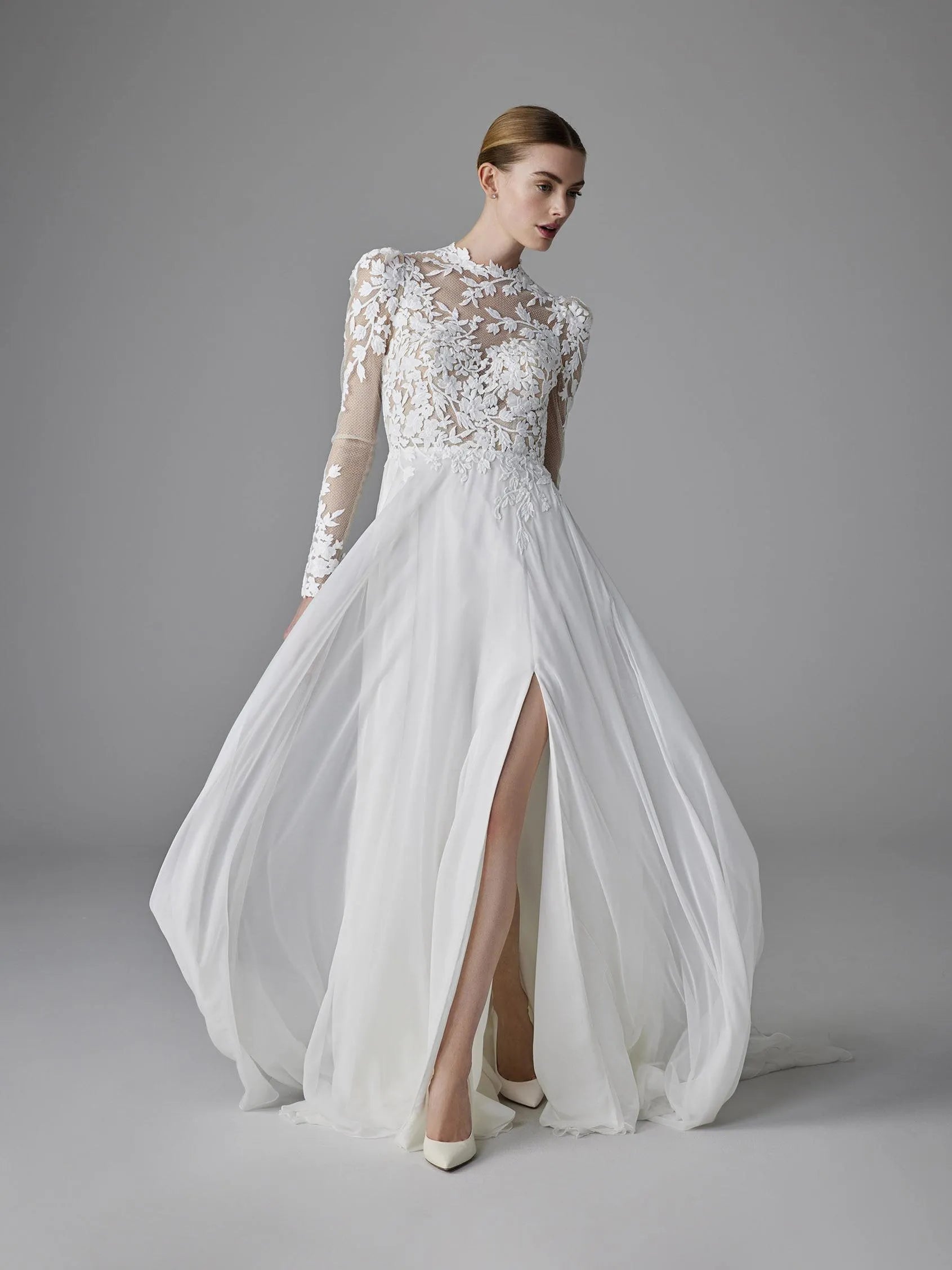 The Pronovias Teresine dress shows that romanticism is not incompatible with modernity. This chiffon A-line design is composed of a semi-sheer lace bodice with a high neck, long sleeves, back slit, and a gorgeous layered skirt adorned with a suggestive slit on one side of the front.