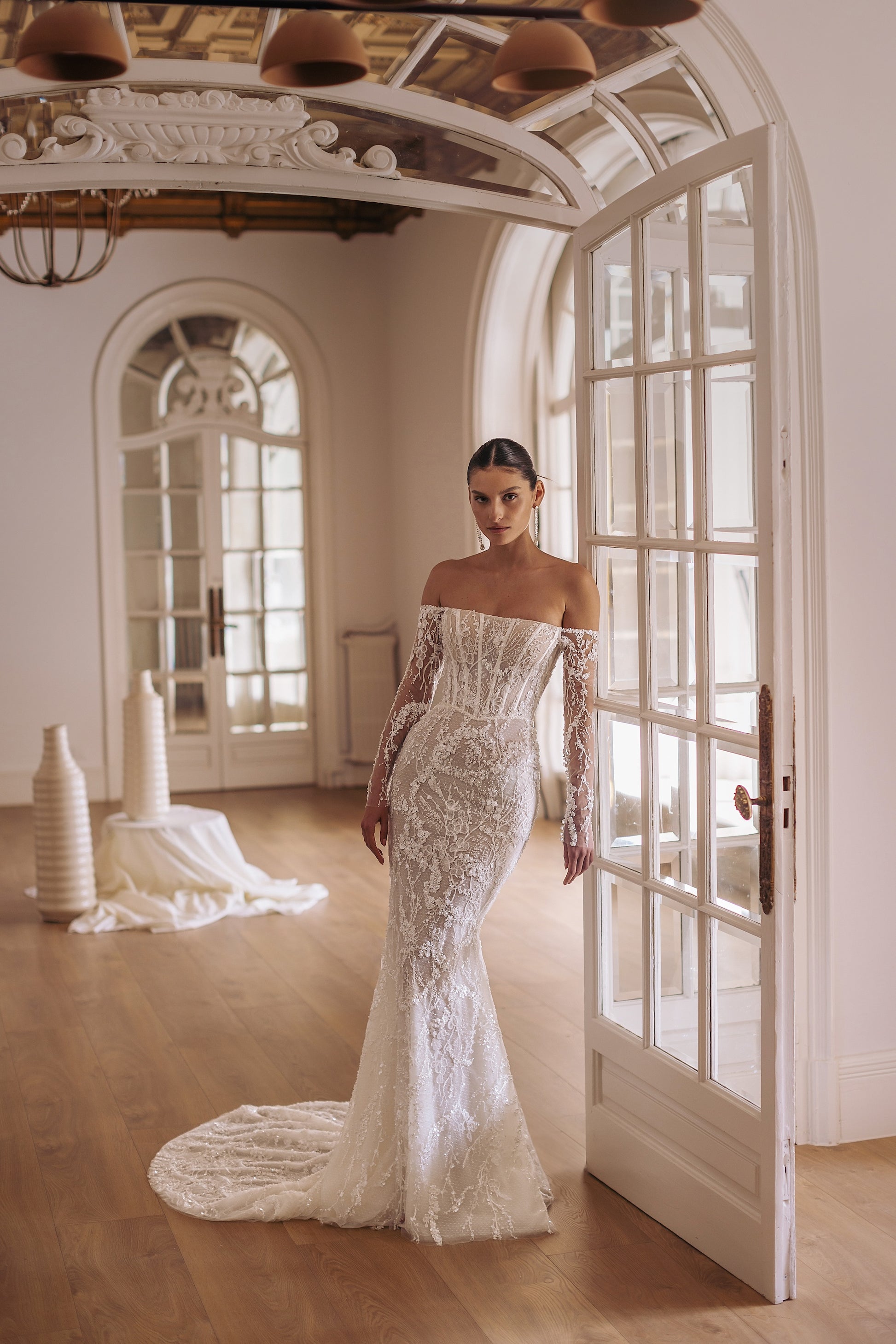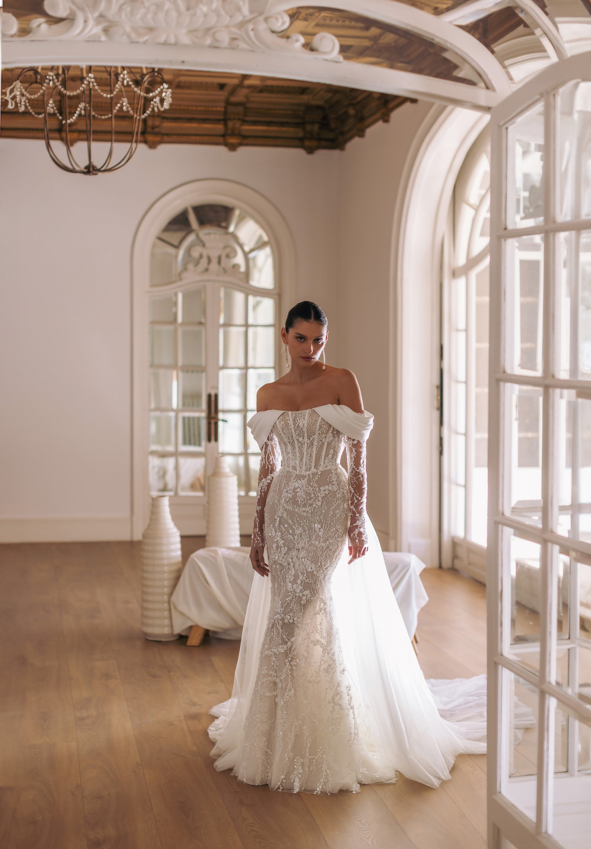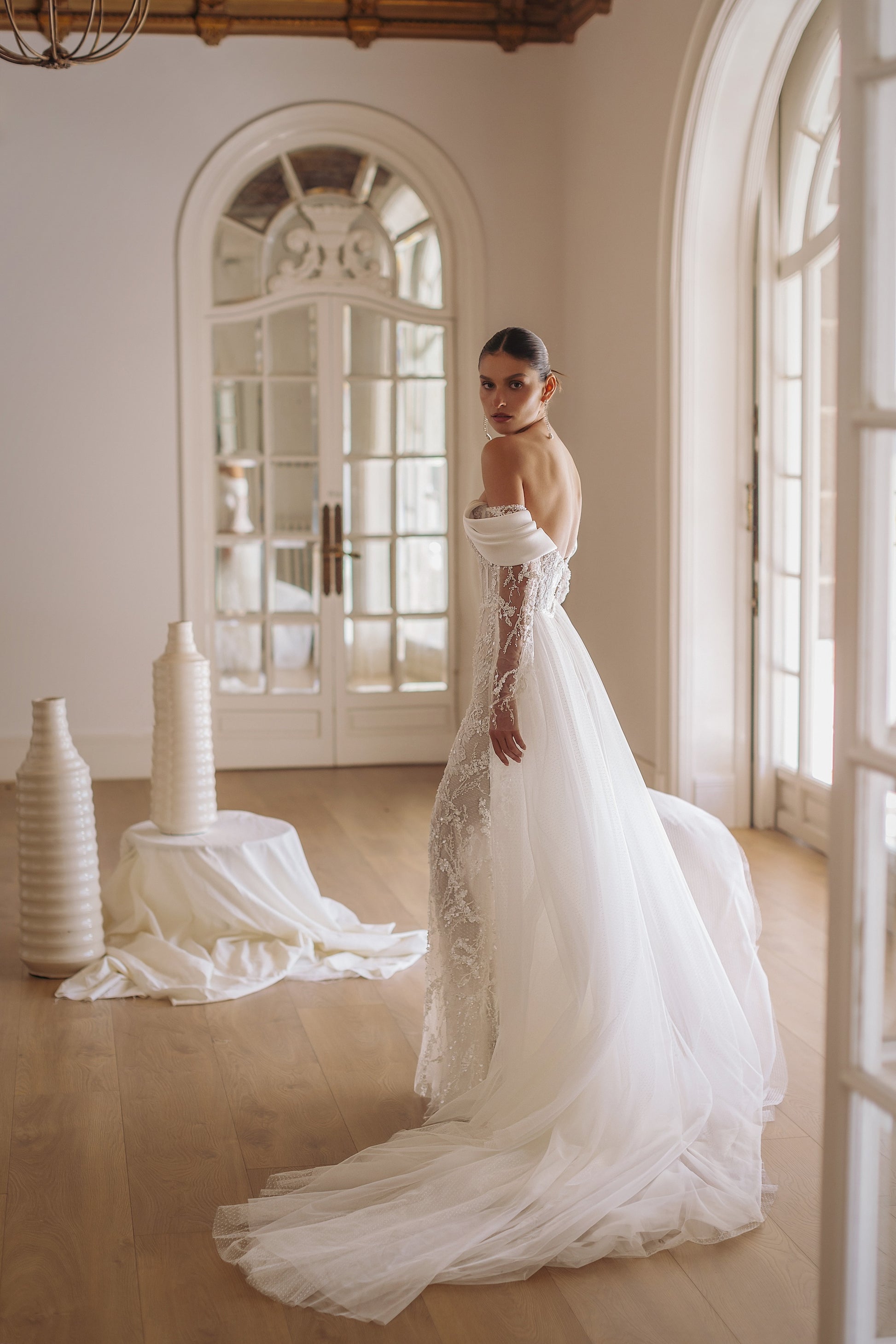 Tulum by WONA is straight neckline strapless corset-based dress with sophisticated embroideries all over the mermaid silhouette. Featuring detachable overskirt made of tulle and smooth off-shoulder straps in mikado fabric. Dress only - £2,400