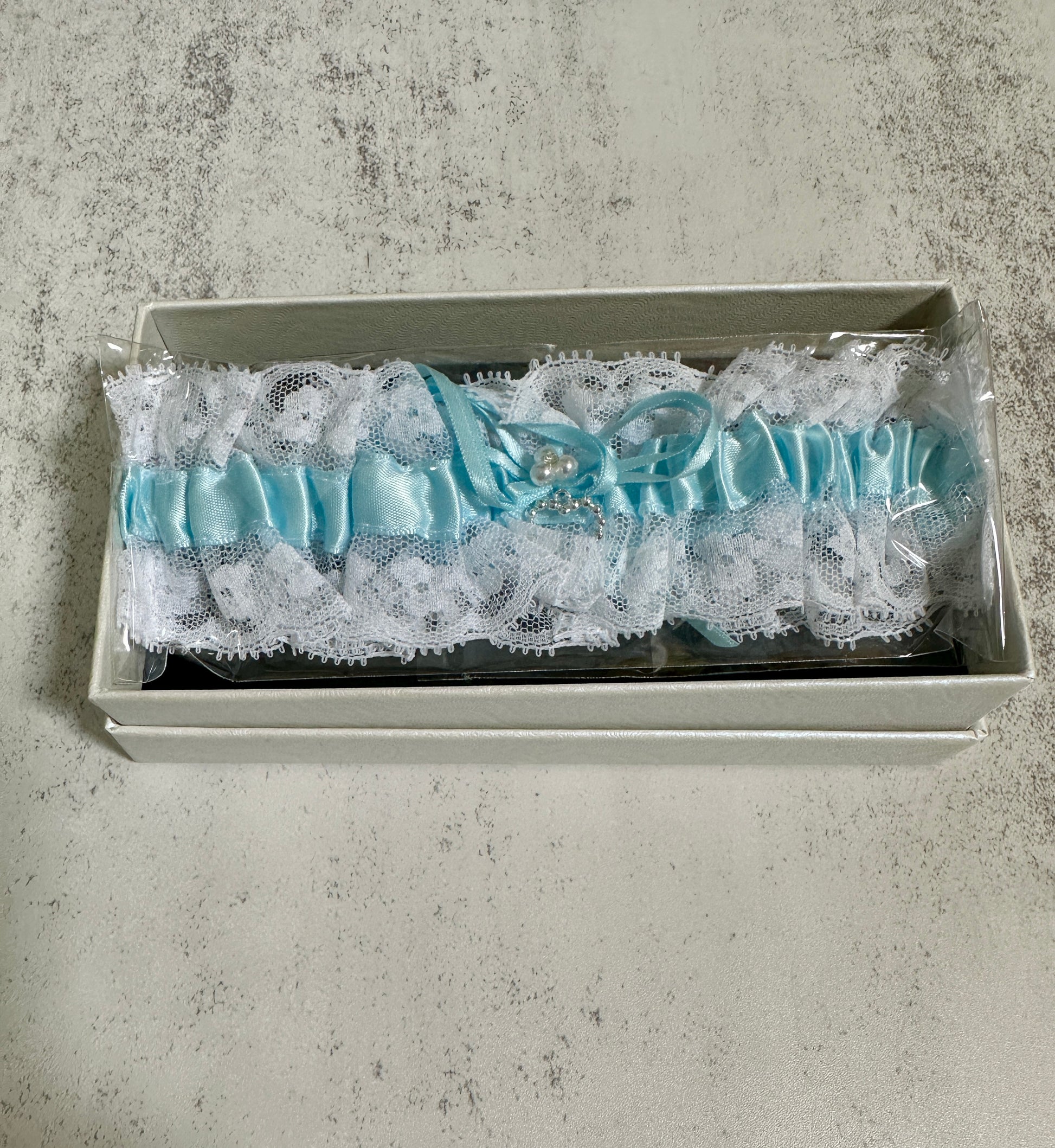 Twilight Designs narrow ivory lace garter with blue ribbon, pearl and diamante centre with a dangling heart charm.