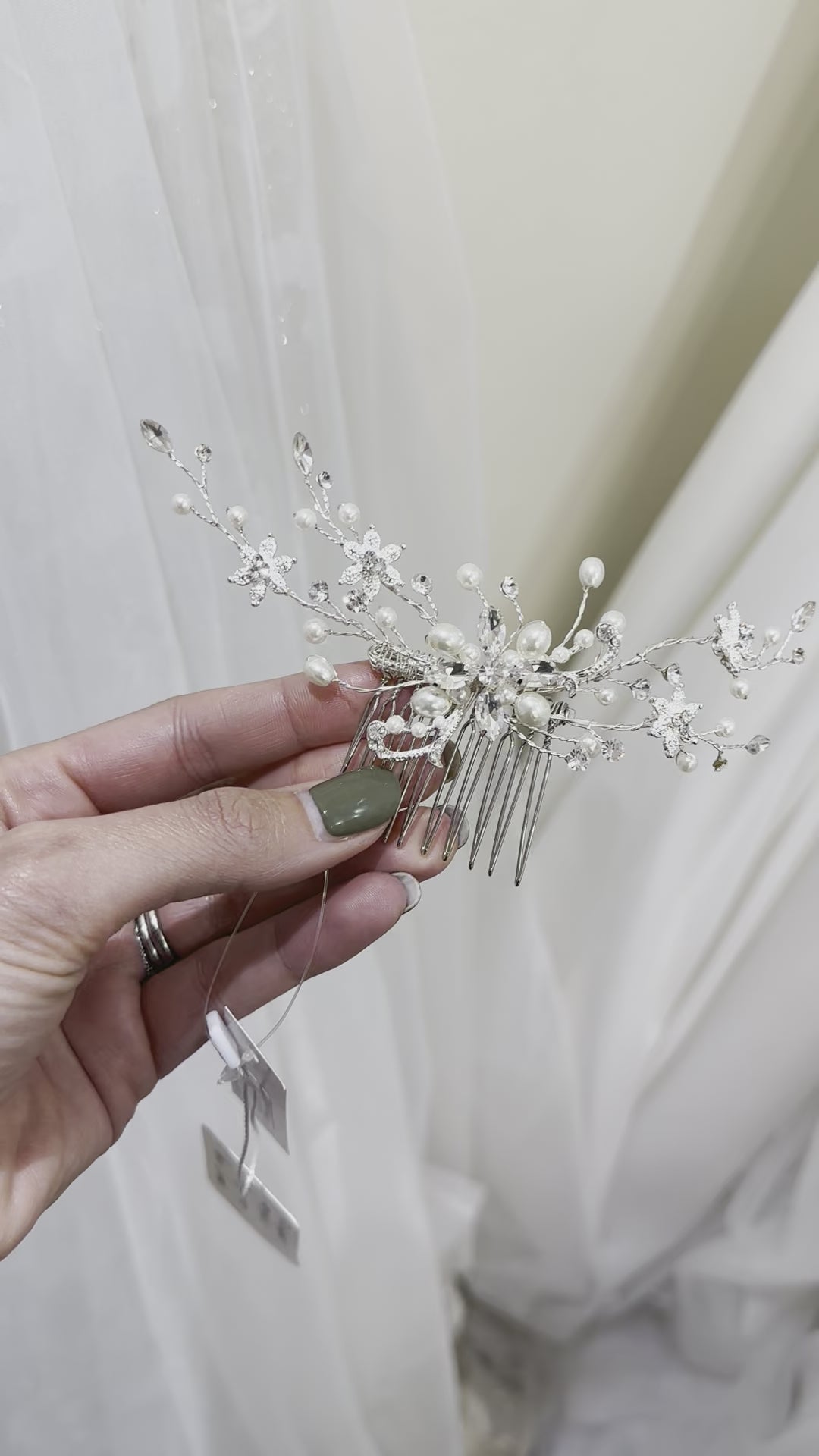 A Swarovski Stone, Freshwater Pearl and Diamante Hair Comb by Twilight Designs in a silver metal.