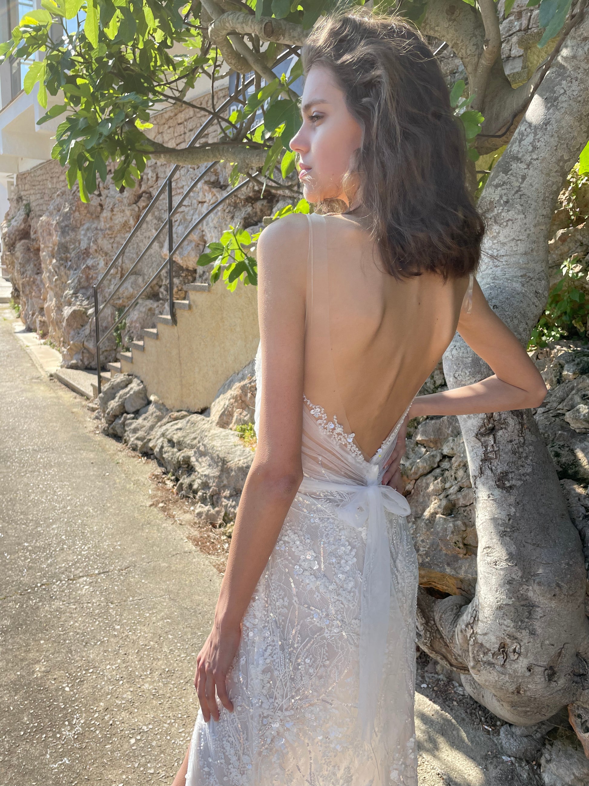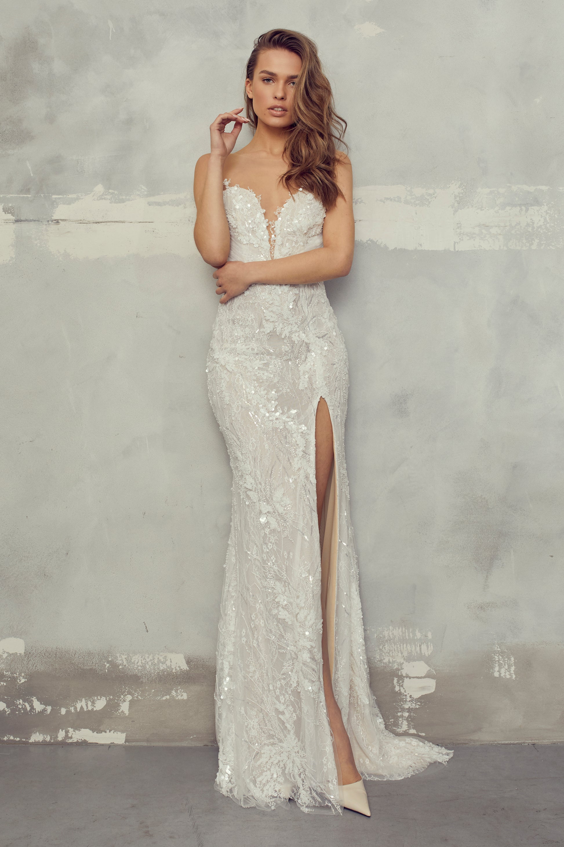 Model 2305 Veronica by Mia Lavi is a trumpet silhouette dress made from a beautiful sequin lace. The top is an illusion tulle neckline giving the effect of a sweetheart neckline and a dropped back. The skirt features a high split and a small train. Perfect for summer weddings. The dress is in a blush pink colour.
